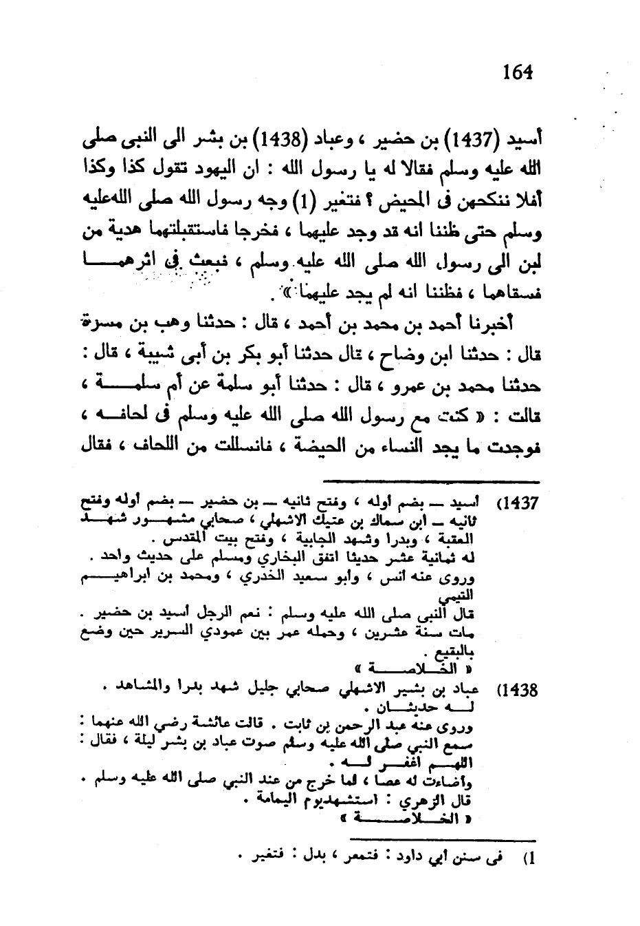 أُسَيْدُ بْنُ حُضَيْرٍ وَعَبَّادُ بْنُ بِشْرٍ إِلَى النَّبِيِّ صَلَّى اللَّهُ عَلَيْهِ وَسَلَّمَ فَقَالَا لَهُ يَا رَسُولَ اللَّهِ إِنَّ الْيَهُودَ تَقُولُ كَذَا وَكَذَا أَفَلَا نَنْكِحُهُنَّ فِي الْمَحِيضِ فَتَغَيَّرَ وَجْهُ رَسُولِ اللَّهِ صَلَّى اللَّهُ عَلَيْهِ وَسَلَّمَ حَتَّى ظَنَنَّا أَنَّهُ قَدْ وَجَدَ عَلَيْهِمَا فَخَرَجَا فَاسْتَقْبَلَتْهُمَا هَدِيَّةٌ مِنْ لَبَنٍ إِلَى رَسُولِ اللَّهِ صَلَّى اللَّهُ عَلَيْهِ وَسَلَّمَ فَبَعَثَ فِي أَثَرِهِمَا فَسَقَاهُمَا فَظَنَنَّا أَنَّهُ لَمْ يَجِدْ عَلَيْهِمَا أَخْبَرَنَا أَحْمَدُ بْنُ مُحَمَّدِ بْنِ أَحْمَدَ قَالَ حَدَّثَنَا وَهْبُ بْنُ مَسَرَّةَ قَالَ حَدَّثَنَا ابْنُ وَضَّاحٍ قَالَ حَدَّثَنَا أَبُو بَكْرِ بْنُ أَبِي شَيْبَةَ قَالَ حَدَّثَنَا مُحَمَّدُ بْنُ عَمْرٍو قَالَ حَدَّثَنَا أَبُو سَلَمَةَ عَنْ أُمِّ سَلَمَةَ قَالَتْ كُنْتُ مَعَ رَسُولِ اللَّهِ صَلَّى اللَّهُ عَلَيْهِ وَسَلَّمَ في لِحَافِهِ فَوَجَدْتُ مَا يَجِدُ النِّسَاءُ مِنَ الْحَيْضَةِ فَانْسَلَلْتُ مِنَ اللِّحَافِ فَقَالَ
