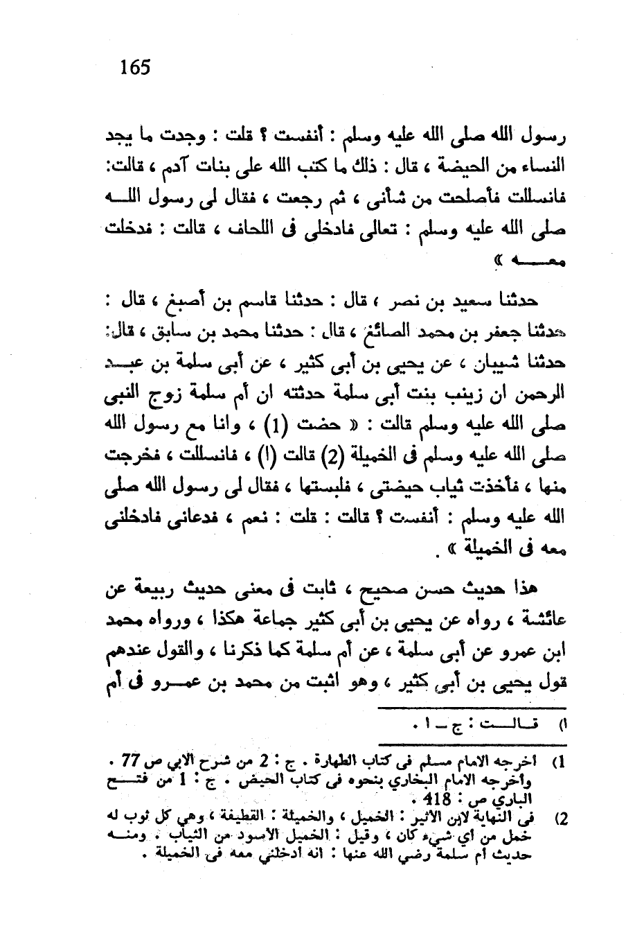 رَسُولُ اللَّهِ صَلَّى اللَّهُ عَلَيْهِ وَسَلَّمَ أَنَفِسْتِ قُلْتُ وَجَدْتُ مَا يَجِدُ النِّسَاءُ مِنَ الْحَيْضَةِ قَالَ ذَلِكَ مَا كَتَبَ اللَّهُ عَلَى بَنَاتِ آدَمَ قَالَتْ فَانْسَلَلْتُ فَأَصْلَحْتُ مِنْ شَأْنِي ثُمَّ رَجَعْتُ فَقَالَ لِي رَسُولُ اللَّهِ صَلَّى اللَّهُ عَلَيْهِ وَسَلَّمَ تَعَالِي فَادْخُلِي فِي اللِّحَافِ قَالَتْ فَدَخَلْتُ مَعَهُ حَدَّثَنَا سَعِيدُ بْنُ نَصْرٍ قَالَ حَدَّثَنَا قَاسِمُ بْنُ أَصْبَغَ قَالَ حَدَّثَنَا جَعْفَرُ بْنُ مُحَمَّدٍ الصَّائِغُ قَالَ حَدَّثَنَا مُحَمَّدُ بْنُ سَابِقٍ قَالَ حَدَّثَنَا شَيْبَانُ عَنْ يَحْيَى بْنِ أَبِي كَثِيرٍ عَنْ أَبِي سَلَمَةَ بْنِ عَبْدِ الرَّحْمَنِ أَنَّ زَيْنَبَ بِنْتَ أَبِي سَلَمَةَ حَدَّثَتْهُ أَنَّ أُمَّ سَلَمَةَ زَوْجَ النَّبِيِّ صَلَّى اللَّهُ عَلَيْهِ وَسَلَّمَ قَالَتْ حِضْتُ وَأَنَا مَعَ رَسُولِ اللَّهِ صَلَّى اللَّهُ عَلَيْهِ وَسَلَّمَ فِي الْخَمِيلَةِ قَالَتْ فَانْسَلَلْتُ فَخَرَجْتُ مِنْهَا فَأَخَذْتُ ثِيَابَ حَيْضَتِي فَلَبِسْتُهَا فَقَالَ لِي رَسُولُ اللَّهِ صَلَّى اللَّهُ عَلَيْهِ وَسَلَّمَ أَنَفِسْتِ قَالَتْ قُلْتُ نَعَمْ فَدَعَانِي فَأَدْخَلَنِي مَعَهُ فِي الْخَمِيلَةِ هَذَا حَدِيثٌ حَسَنٌ صَحِيحٌ ثَابِتٌ فِي مَعْنَى حَدِيثِ رَبِيعَةَ عَنْ عَائِشَةَ رَوَاهُ عَنْ يَحْيَى بْنِ أَبِي كَثِيرٍ جماعة هكذا ورواه محمد ابن عَمْرٍو عَنْ أَبِي سَلَمَةَ عَنْ أُمِّ سَلَمَةَ كَمَا ذَكَرْنَا وَالْقَوْلُ عِنْدَهُمْ قَوْلُ يَحْيَى بْنِ أَبِي كَثِيرٍ وَهُوَ أَثْبَتُ مِنْ مُحَمَّدِ بْنِ عَمْرٍو فِي أُمِّ