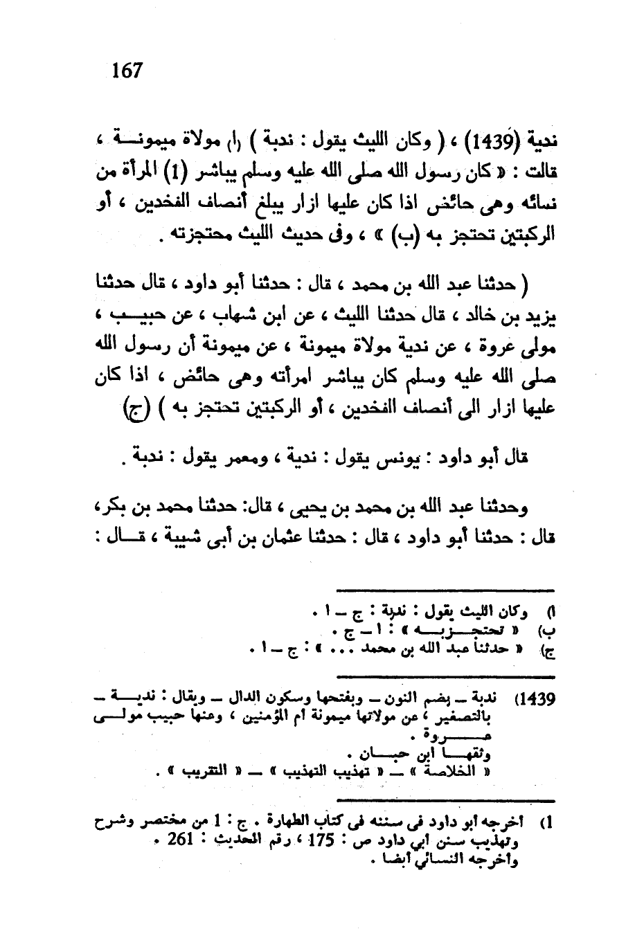 ندية (وكان الليث يقول ندبة) (أ) مَوْلَاةِ مَيْمُونَةَ قَالَتْ كَانَ رَسُولُ اللَّهِ صَلَّى اللَّهُ عَلَيْهِ وَسَلَّمَ يُبَاشِرُ الْمَرْأَةَ مِنْ نِسَائِهِ وَهِيَ حَائِضٌ إِذَا كَانَ عَلَيْهَا إِزَارٌ يَبْلُغُ أَنْصَافَ الْفَخِذَيْنِ أَوِ الرُّكْبَتَيْنِ تَحْتَجِزُ بِهِ وَفِي حَدِيثِ اللَّيْثِ مُحْتَجِزَتَهُ (حَدَّثَنَا عَبْدُ اللَّهِ بْنُ مُحَمَّدٍ قَالَ حَدَّثَنَا أَبُو دَاوُدَ قَالَ حَدَّثَنَا يَزِيدُ بْنُ خَالِدٍ قَالَ حَدَّثَنَا اللَّيْثُ عَنِ ابْنِ شِهَابٍ عَنْ حَبِيبٍ مَوْلَى عُرْوَةَ عَنْ نُدَيَّةَ مَوْلَاةِ مَيْمُونَةَ عَنْ مَيْمُونَةَ أَنَّ رَسُولَ اللَّهِ صَلَّى اللَّهُ عَلَيْهِ وَسَلَّمَ كَانَ يُبَاشِرُ امْرَأَتَهُ وَهِيَ حَائِضٌ إِذَا كَانَ عَلَيْهَا إِزَارٌ إِلَى أَنْصَافِ الْفَخِذَيْنِ أَوِ الرُّكْبَتَيْنِ تَحْتَجِزُ بِهِ) (ج) قَالَ أَبُو دَاوُدَ يُونُسُ يَقُولُ نُدَيَّةُ وَمَعْمَرٌ يَقُولُ نُدْبَةُ وَحَدَّثَنَا عَبْدُ اللَّهِ بْنُ مُحَمَّدِ بْنِ يَحْيَى قَالَ حَدَّثَنَا مُحَمَّدُ بْنُ بَكْرٍ قَالَ حَدَّثَنَا أَبُو دَاوُدَ قَالَ حَدَّثَنَا عُثْمَانُ بْنُ أَبِي شَيْبَةَ قَالَ