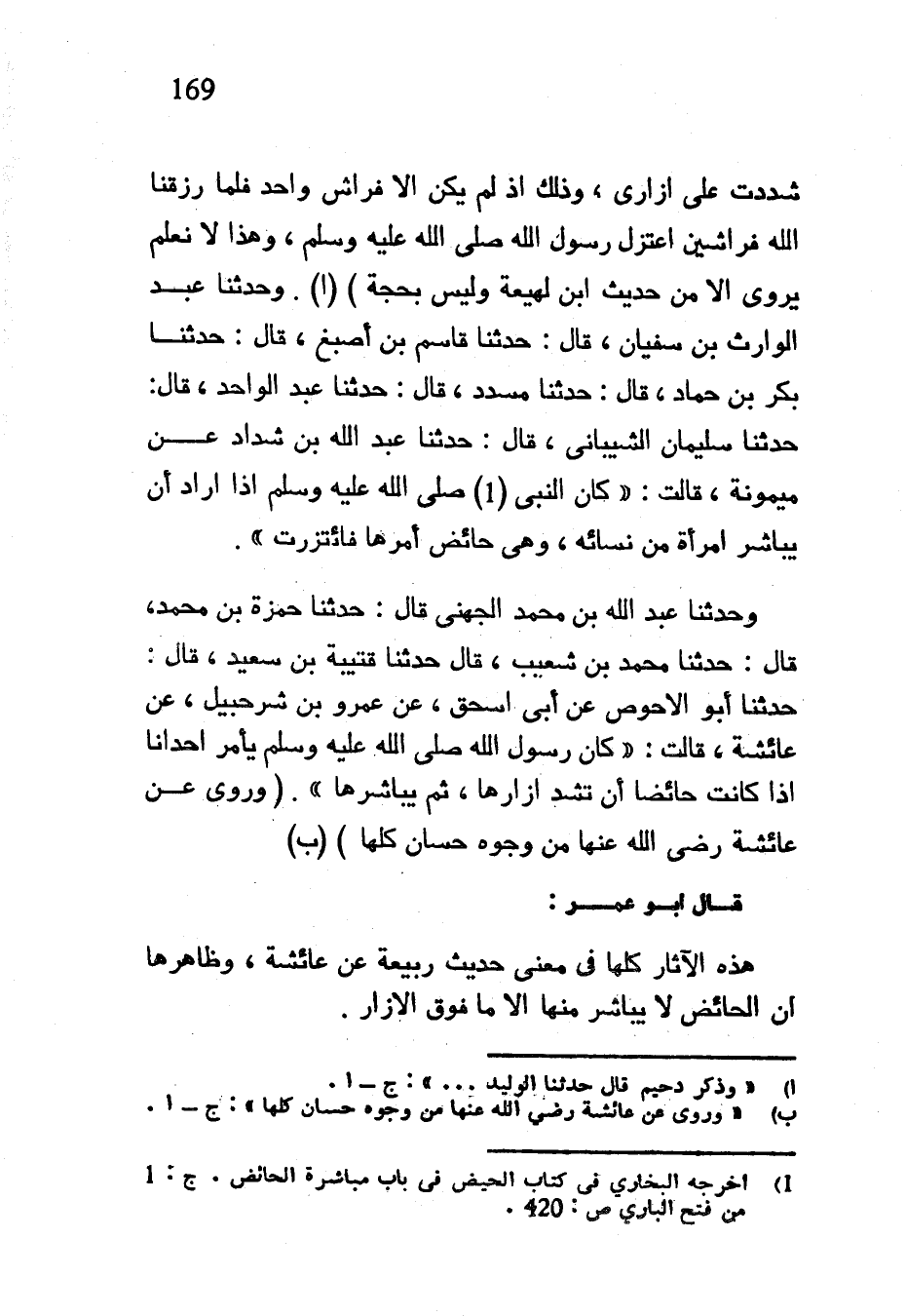 شَدَدْتُ عَلِيَّ إِزَارِي وَذَلِكَ إِذْ لَمْ يَكُنْ إِلَّا فِرَاشٌ وَاحِدٌ فَلَمَّا رَزَقَنَا اللَّهُ فِرَاشَيْنِ اعْتَزَلَ رَسُولُ اللَّهِ صَلَّى اللَّهُ عَلَيْهِ وَسَلَّمَ وَهَذَا لَا نَعْلَمُ يُرْوَى إِلَّا مِنْ حَدِيثِ ابْنِ لَهِيعَةَ وَلَيْسَ بِحُجَّةٍ وَحَدَّثَنَا عَبْدُ الْوَارِثِ بْنُ سُفْيَانَ قَالَ حَدَّثَنَا قَاسِمُ بْنُ أَصْبَغَ قَالَ حَدَّثَنَا بَكْرُ بْنُ حَمَّادٍ قَالَ حَدَّثَنَا مُسَدَّدٌ قَالَ حَدَّثَنَا عَبْدُ الْوَاحِدِ قَالَ حَدَّثَنَا سُلَيْمَانُ الشَّيْبَانِيُّ قَالَ حَدَّثَنَا عَبْدُ اللَّهِ بْنُ شَدَّادٍ عَنْ مَيْمُونَةَ قَالَتْ كَانَ النَّبِيُّ صَلَّى اللَّهُ عَلَيْهِ وَسَلَّمَ إِذَا أَرَادَ أَنْ يُبَاشِرَ امْرَأَةً مِنْ نِسَائِهِ وَهِيَ حَائِضٌ أَمَرَهَا فَائْتَزَرَتْ وَحَدَّثَنَا عَبْدُ اللَّهِ بْنُ مُحَمَّدٍ الْجُهَنِيُّ قَالَ حَدَّثَنَا حَمْزَةُ بْنُ مُحَمَّدٍ قَالَ حَدَّثَنَا مُحَمَّدُ بْنُ شُعَيْبٍ قَالَ حَدَّثَنَا قُتَيْبَةُ بْنُ سَعِيدٍ قَالَ حَدَّثَنَا أبو الأحوص عن أبي إسحق عَنْ عَمْرِو بْنِ شُرَحْبِيلَ عَنْ عَائِشَةَ قَالَتْ كَانَ رَسُولُ اللَّهِ صَلَّى اللَّهُ عَلَيْهِ وَسَلَّمَ يَأْمُرُ إِحْدَانَا إِذَا كَانَتْ حَائِضًا أَنْ تَشُدَّ إِزَارَهَا ثُمَّ يُبَاشِرُهَا (وَرُوِيَ عَنْ عَائِشَةَ رَضِيَ الله عنها من وجوه حسان كلها) (ب) قَالَ أَبُو عُمَرَ هَذِهِ الْآثَارُ كُلُّهَا فِي مَعْنَى حَدِيثِ رَبِيعَةَ عَنْ عَائِشَةَ وَظَاهِرُهَا أَنَّ الْحَائِضَ لَا يُبَاشَرُ مِنْهَا إِلَّا مَا فَوْقَ الازار