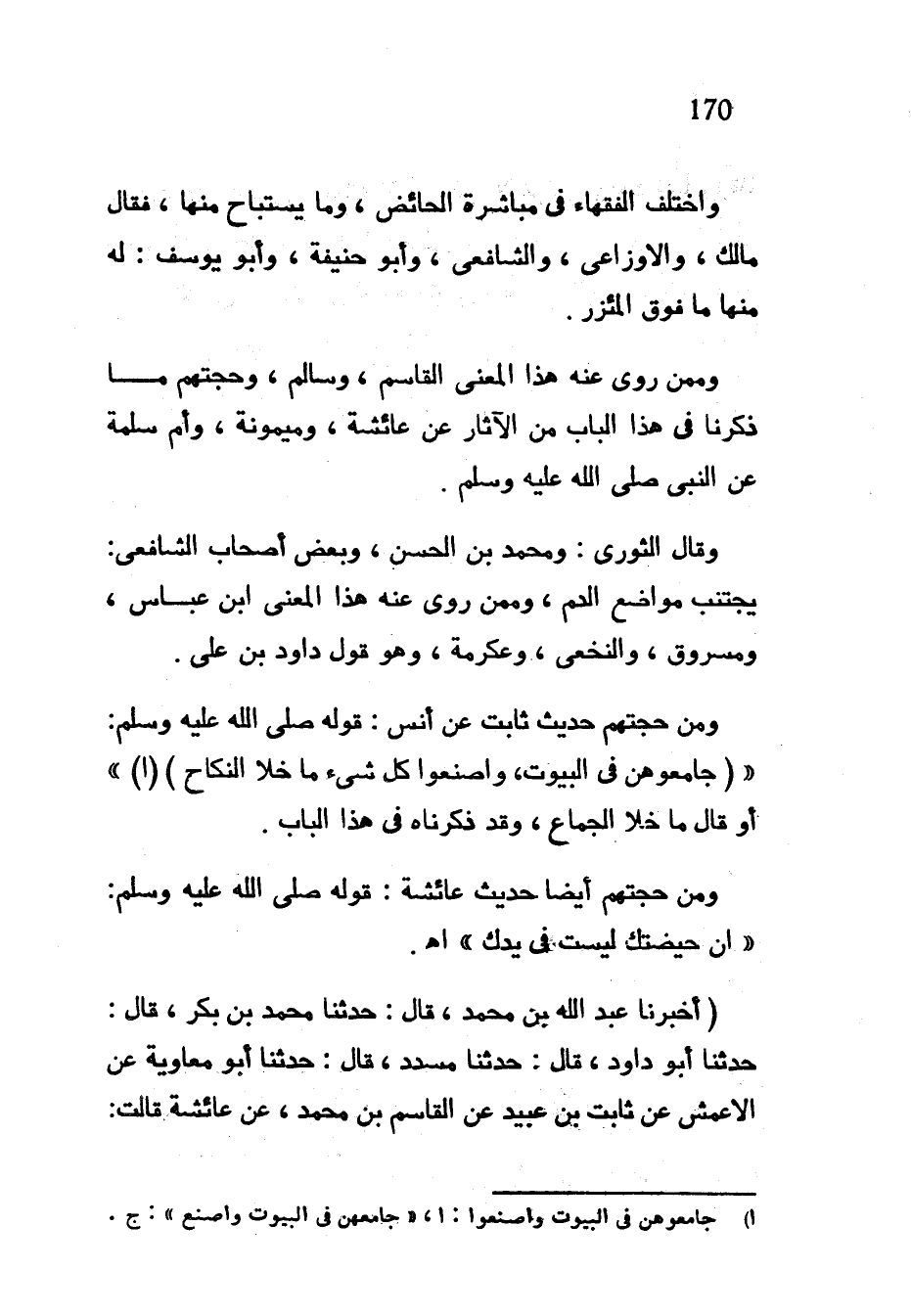 وَاخْتَلَفَ الْفُقَهَاءُ فِي مُبَاشَرَةِ الْحَائِضِ وَمَا يُسْتَبَاحُ مِنْهَا فَقَالَ مَالِكٌ وَالْأَوْزَاعِيُّ وَالشَّافِعِيُّ وَأَبُو حَنِيفَةَ وَأَبُو يُوسُفَ لَهُ مِنْهَا مَا فَوْقَ الْمِئْزَرِ وَمِمَّنْ رَوَى عَنْهُ هَذَا الْمَعْنَى الْقَاسِمُ وَسَالِمٌ وَحُجَّتُهُمْ مَا ذَكَرْنَا فِي هَذَا الْبَابِ مِنَ الْآثَارِ عَنْ عَائِشَةَ وَمَيْمُونَةَ وَأُمِّ سَلَمَةَ عَنِ النَّبِيِّ صَلَّى اللَّهُ عَلَيْهِ وَسَلَّمَ وَقَالَ الثَّوْرِيُّ وَمُحَمَّدُ بْنُ الْحَسَنِ وَبَعْضُ أَصْحَابِ الشَّافِعِيِّ يَجْتَنِبُ مَوَاضِعَ الدَّمِ وَمِمَّنْ رَوَى عَنْهُ هَذَا الْمَعْنَى ابن عباس مسروق وَالنَّخَعِيُّ وَعِكْرِمَةُ وَهُوَ قَوْلُ دَاوُدَ بْنِ عَلِيٍّ وَمِنْ حُجَّتِهِمْ حَدِيثُ ثَابِتٍ عَنْ أَنَسٍ قَوْلُهُ صَلَّى اللَّهُ عَلَيْهِ وَسَلَّمَ (جَامِعُوهُنَّ فِي الْبُيُوتِ واصنعوا كل شيء ما خلا النكاح) (أ) أَوْ قَالَ مَا خَلَا الْجِمَاعَ وَقَدْ ذَكَرْنَاهُ فِي هَذَا الْبَابِ وَمِنْ حُجَّتِهِمْ أَيْضًا حَدِيثُ عَائِشَةَ قَوْلُهُ صَلَّى اللَّهُ عَلَيْهِ وَسَلَّمَ إِنَّ حَيْضَتَكِ لَيْسَتْ فِي يَدِكِ اه (أَخْبَرَنَا عَبْدُ اللَّهِ بْنُ مُحَمَّدٍ قَالَ حَدَّثَنَا مُحَمَّدُ بْنُ بَكْرٍ قَالَ حَدَّثَنَا أَبُو دَاوُدَ قَالَ حَدَّثَنَا مُسَدَّدٌ قَالَ حَدَّثَنَا أَبُو مُعَاوِيَةَ عَنِ الْأَعْمَشِ عَنْ ثَابِتِ بْنِ عُبَيْدٍ عَنِ الْقَاسِمِ بْنِ مُحَمَّدٍ عَنْ عَائِشَةَ قَالَتْ
