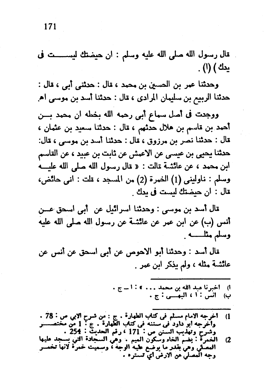 قَالَ رَسُولُ اللَّهِ صَلَّى اللَّهُ عَلَيْهِ وَسَلَّمَ إِنَّ حَيْضَتَكِ لَيْسَتْ فِي يَدِكِ) وَحَدَّثَنَا عُمَرُ بْنُ الْحُسَيْنِ بْنِ مُحَمَّدٍ قَالَ حَدَّثَنِي أَبِي قَالَ حَدَّثَنَا الرَّبِيعُ بْنُ سُلَيْمَانَ الْمُرَادِيُّ قَالَ حَدَّثَنَا أَسَدُ بْنُ مُوسَى اه وَوَجَدْتُ فِي أَصْلِ سَمَاعِ أَبِي رَحِمَهُ اللَّهُ بِخَطِّهِ أَنَّ مُحَمَّدَ بْنَ أَحْمَدَ بْنِ قَاسِمِ بْنِ هِلَالٍ حَدَّثَهُمْ قَالَ حَدَّثَنَا سَعِيدُ بْنُ عُثْمَانَ قَالَ حَدَّثَنَا نَصْرُ بْنُ مَرْزُوقٍ قَالَ حَدَّثَنَا أَسَدُ بْنُ مُوسَى قَالَ حَدَّثَنَا يَحْيَى بْنُ عِيسَى عَنِ الْأَعْمَشِ عَنْ ثَابِتِ بْنِ عُبَيْدٍ عَنِ القاسم ابن مُحَمَّدٍ عَنْ عَائِشَةَ قَالَتْ قَالَ رَسُولُ اللَّهِ صَلَّى اللَّهُ عَلَيْهِ وَسَلَّمَ نَاوِلِينِي الْخُمْرَةَ مِنَ الْمَسْجِدِ قُلْتُ إِنِّي حَائِضٌ قَالَ إِنَّ حَيْضَتَكِ لَيْسَتْ فِي يَدِكِ قَالَ أَسَدُ بْنُ مُوسَى وَحَدَّثَنَا إِسْرَائِيلُ عَنْ أَبِي إِسْحَاقَ عَنْ أَنَسٍ عَنِ ابْنِ عُمَرَ عَنْ عَائِشَةَ عَنْ رَسُولِ اللَّهِ صَلَّى اللَّهُ عَلَيْهِ وَسَلَّمَ مِثْلَهُ قَالَ أَسَدٌ وَحَدَّثَنَا أَبُو الْأَحْوَصِ عَنْ أَبِي إِسْحَاقَ عَنْ أَنَسٍ عَنْ عَائِشَةَ مِثْلَهُ وَلَمْ يَذْكُرِ ابن عمر