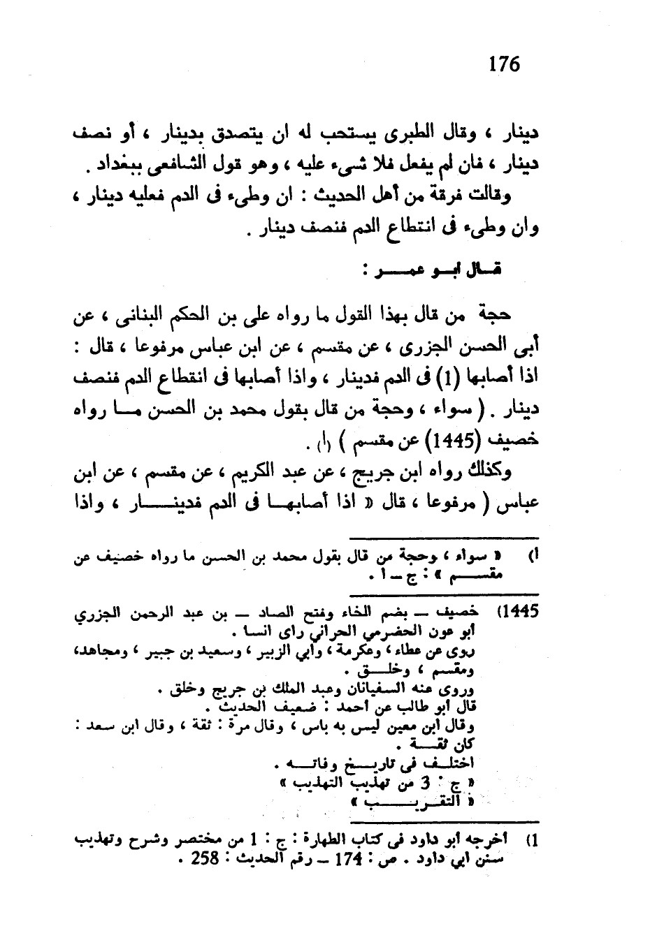 دِينَارٍ وَقَالَ الطَّبَرِيُّ يُسْتَحَبُّ لَهُ أَنْ يَتَصَدَّقَ بِدِينَارٍ أَوْ نِصْفِ دِينَارٍ فَإِنْ لَمْ يَفْعَلْ فَلَا شَيْءَ عَلَيْهِ وَهُوَ قَوْلُ الشَّافِعِيِّ بِبَغْدَادَ وقالت فرقة من أهل الحديث ان وطيء في الدم فعليه دينار وإن وطيء فِي انْقِطَاعِ الدَّمِ فَنِصْفُ دِينَارٍ قَالَ أَبُو عُمَرَ حُجَّةُ مَنْ قَالَ بِهَذَا الْقَوْلِ مَا رَوَاهُ عَلِيُّ بْنُ الْحَكَمِ الْبُنَانِيُّ عَنْ أَبِي الْحَسَنِ الْجَزَرِيِّ عَنْ مِقْسَمٍ عَنِ ابْنِ عَبَّاسٍ مَرْفُوعًا قَالَ إِذَا أَصَابَهَا فِي الدَّمِ فَدِينَارٌ وَإِذَا أَصَابَهَا فِي انْقِطَاعِ الدَّمِ فَنِصْفُ دِينَارٍ (سَوَاءٌ وَحُجَّةُ مَنْ قَالَ بِقَوْلِ مُحَمَّدِ بْنِ الْحَسَنِ مَا رَوَاهُ خُصَيْفٌ (1445) عَنْ مِقْسَمٍ) وَكَذَلِكَ رَوَاهُ ابْنُ جُرَيْجٍ عَنْ عَبْدِ الْكَرِيمِ عَنْ مِقْسَمٍ عَنِ ابْنِ عَبَّاسٍ (مَرْفُوعًا قَالَ إِذَا أَصَابَهَا فِي الدَّمِ فَدِينَارٌ وَإِذَا