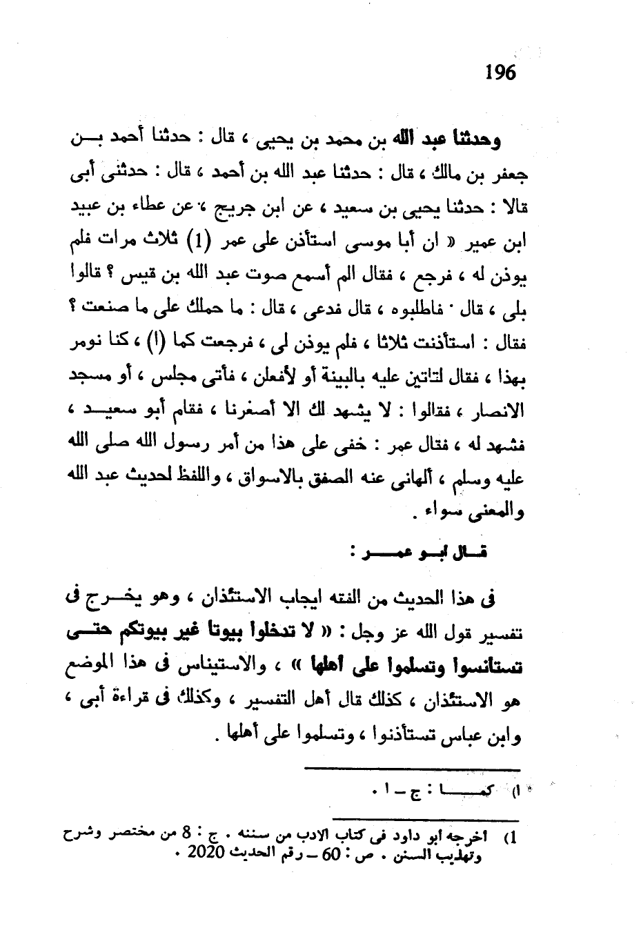 وَحَدَّثَنَا عَبْدُ اللَّهِ بْنُ مُحَمَّدِ بْنِ يَحْيَى قَالَ حَدَّثَنَا أَحْمَدُ بْنُ جَعْفَرِ بْنِ مَالِكٍ قَالَ حَدَّثَنَا عَبْدُ اللَّهِ بْنُ أَحْمَدَ قَالَ حَدَّثَنِي أَبِي قَالَا حَدَّثَنَا يَحْيَى بْنُ سَعِيدٍ عَنِ ابْنِ جُرَيْجٍ عن عطاء بن عبيد ابن عُمَيْرٍ أَنَّ أَبَا مُوسَى اسْتَأْذَنَ عَلَى عُمَرَ ثَلَاثَ مَرَّاتٍ فَلَمْ يُؤْذَنْ لَهُ فَرَجَعَ فَقَالَ أَلَمْ أَسْمَعْ صَوْتَ عَبْدِ اللَّهِ بْنِ قَيْسٍ قَالُوا بَلَى قَالَ فَاطْلُبُوهُ قَالَ فَدُعِيَ قَالَ مَا حَمَلَكَ عَلَى مَا صَنَعْتَ فَقَالَ اسْتَأْذَنْتُ ثَلَاثًا فَلَمْ يُؤْذَنْ لِي فَرَجَعْتُ كَمَا كُنَّا نُؤْمَرُ بِهَذَا فَقَالَ لَتَأْتِيَنَّ عَلَيْهِ بِالْبَيِّنَةِ أَوْ لَأَفْعَلَنَّ فَأَتَى مَجْلِسَ أَوْ مَسْجِدَ الْأَنْصَارِ فَقَالُوا لَا يَشْهَدُ لَكَ إِلَّا أَصْغَرُنَا فَقَامَ أَبُو سَعِيدٍ فَشَهِدَ لَهُ فَقَالَ عُمَرُ خَفِيَ عَلَيَّ هَذَا مِنْ أَمْرِ رَسُولِ اللَّهِ صَلَّى اللَّهُ عَلَيْهِ وَسَلَّمَ أَلْهَانِي عَنْهُ الصَّفْقُ بِالْأَسْوَاقِ وَاللَّفْظُ لِحَدِيثِ عَبْدِ اللَّهِ وَالْمَعْنَى سَوَاءٌ قَالَ أَبُو عُمَرَ فِي هَذَا الْحَدِيثِ مِنَ الْفِقْهِ إِيجَابُ الاستئئذان وَهُوَ يَخْرُجُ فِي تَفْسِيرِ قَوْلِ اللَّهِ عَزَّ وَجَلَّ لَا تَدْخُلُوا بُيُوتًا غَيْرَ بُيُوتِكُمْ حَتَّى تَسْتَأْنِسُوا وتسلموا على أهلها ولا استيناس فِي هَذَا الْمَوْضِعِ هُوَ الِاسْتِئْذَانُ كَذَلِكَ قَالَ أَهْلُ التَّفْسِيرِ وَكَذَلِكَ فِي قِرَاءَةِ أُبَيٍّ وَابْنِ عَبَّاسٍ تَسْتَأْذِنُوا وَتُسَلِّمُوا عَلَى أَهْلِهَا