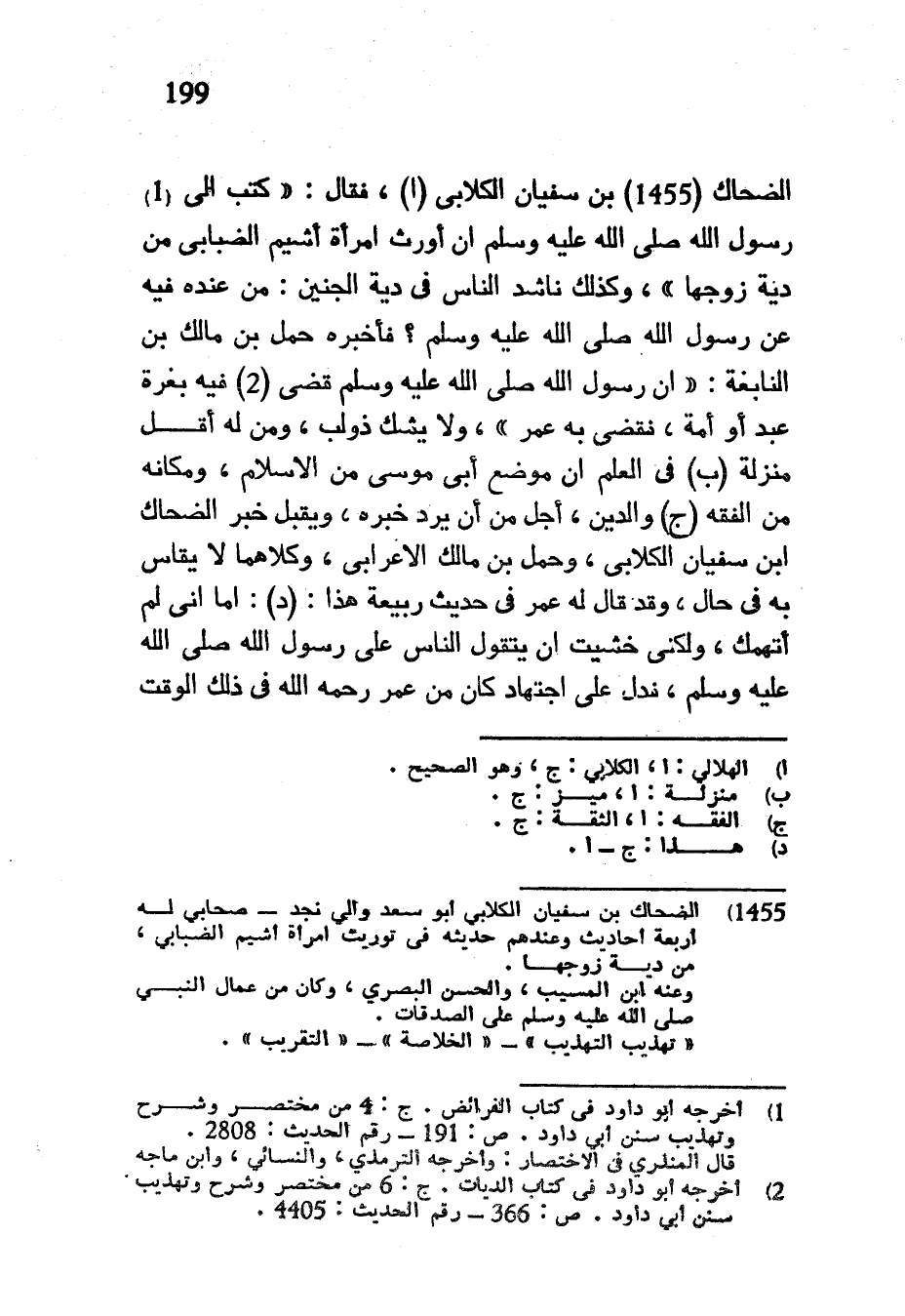 الضحاك بن سفيان الكلاب فَقَالَ كَتَبَ إِلَيَّ رَسُولُ اللَّهِ صَلَّى اللَّهُ عَلَيْهِ وَسَلَّمَ أَنْ أَوْرِثِ امْرَأَةَ أَشْيَمَ الضِّبَابِيِّ مِنْ دِيَةِ زَوْجِهَا وَكَذَلِكَ نَاشَدَ النَّاسَ فِي دِيَةِ الْجَنِينِ مَنْ عِنْدَهُ فِيهِ عَنْ رَسُولِ اللَّهِ صَلَّى اللَّهُ عَلَيْهِ وَسَلَّمَ فَأَخْبَرَهُ حَمَلُ بْنُ مَالِكِ بْنِ النَّابِغَةِ أَنَّ رَسُولَ اللَّهِ صَلَّى اللَّهُ عَلَيْهِ وَسَلَّمَ قَضَى فِيهِ بِغُرَّةٍ عَبْدٍ أَوْ أَمَةٍ فَقَضَى بِهِ عُمَرُ وَلَا يَشُكُّ ذُو لُبٍّ وَمَنْ لَهُ أَقَلُّ مَنْزِلَةٍ فِي الْعِلْمِ أَنَّ مَوْضِعَ أَبِي مُوسَى مِنَ الْإِسْلَامِ وَمَكَانَهُ مِنَ الْفِقْهِ وَالدِّينِ أَجَلُّ مِنْ أن يرد خبره ويقبل خبر الضحاك ابن سُفْيَانَ الْكِلَابِيِّ وَحَمَلِ بْنِ مَالِكٍ الْأَعْرَابِيِّ وَكِلَاهُمَا لا يقاص بِهِ فِي حَالٍ وَقَدْ قَالَ لَهُ عُمَرُ فِي حَدِيثِ رَبِيعَةَ هَذَا أَمَا إِنِّي لَمْ أَتَّهِمْكَ وَلَكِنِّي خَشِيتُ أَنْ يَتَقَوَّلَ النَّاسُ عَلَى رسول الله صلى الله عليه وسلم فدل عَلَى اجْتِهَادٍ كَانَ مِنْ عُمَرَ رَحِمَهُ اللَّهُ فِي ذَلِكَ الْوَقْتِ