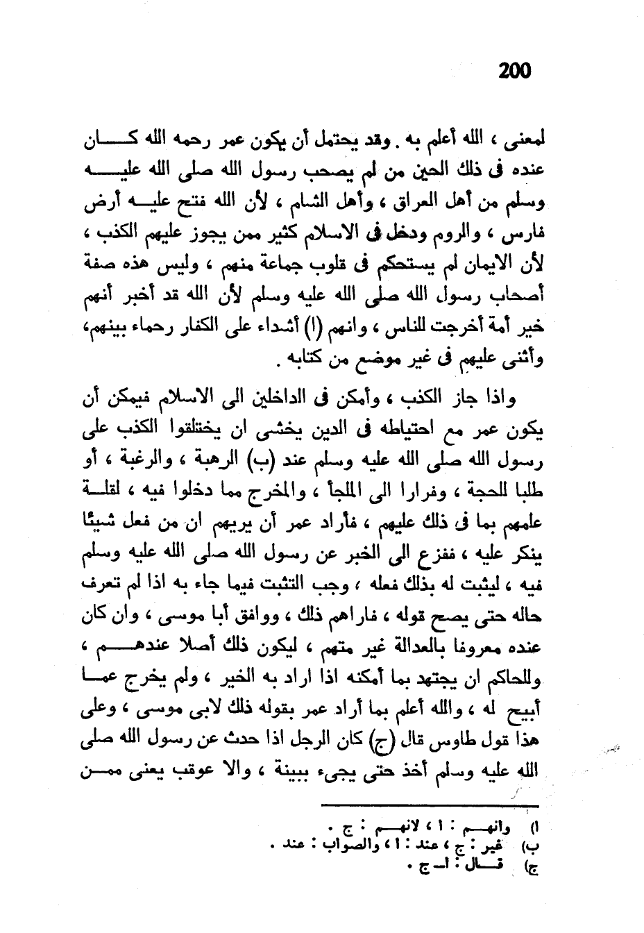 لِمَعْنًى اللَّهُ أَعْلَمُ بِهِ وَقَدْ يُحْتَمَلُ أَنْ يَكُونَ عُمَرُ رَحِمَهُ اللَّهُ كَانَ عِنْدَهُ فِي ذَلِكَ الْحِينِ مَنْ لَمْ يَصْحَبْ رَسُولَ اللَّهِ صَلَّى اللَّهُ عَلَيْهِ وَسَلَّمَ مِنْ أَهْلِ الْعِرَاقِ وَأَهْلِ الشَّامِ لِأَنَّ اللَّهَ فَتَحَ عَلَيْهِ أَرْضَ فَارِسَ وَالرُّومِ وَدَخَلَ فِي الْإِسْلَامِ كَثِيرٌ مِمَّنْ يَجُوزُ عَلَيْهِمُ الْكَذِبُ لِأَنَّ الْإِيْمَانَ لَمْ يَسْتَحْكِمْ فِي قُلُوبِ جَمَاعَةٍ مِنْهُمْ وَلَيْسَ هَذِهِ صِفَةَ أصحاب رسول الله صلى الله عليه وسلم لِأَنَّ اللَّهَ قَدْ أَخْبَرَ أَنَّهُمْ خَيْرُ أُمَّةٍ أُخْرِجَتْ لِلنَّاسِ وَأَنَّهُمْ أَشِدَّاءُ عَلَى الْكُفَّارِ رُحَمَاءُ بَيْنَهُمْ وَأَثْنَى عَلَيْهِمْ فِي غَيْرِ مَوْضِعٍ مِنْ كِتَابِهِ وَإِذَا جَازَ الْكَذِبُ وَأَمْكَنَ فِي الدَّاخِلِينَ إِلَى الْإِسْلَامِ فَيُمْكِنُ أَنْ يَكُونَ عُمَرُ مَعَ احْتِيَاطِهِ فِي الدِّينِ يَخْشَى أَنْ يَخْتَلِقُوا الْكَذِبَ على رسول الله صلى الله عليه وسلم عِنْدَ الرَّهْبَةِ وَالرَّغْبَةِ أَوْ طَلَبًا لِلْحُجَّةِ وَفِرَارًا إِلَى الْمَلْجَأِ وَالْمَخْرَجِ مِمَّا دَخَلُوا فِيهِ لِقِلَّةِ عِلْمِهِمْ بِمَا فِي ذَلِكَ عَلَيْهِمْ فَأَرَادَ عُمَرُ أَنْ يُرِيَهُمْ أَنَّ مَنْ فَعَلَ شَيْئًا يُنْكَرُ عَلَيْهِ فَفَزِعَ إِلَى الْخَبَرِ عَنْ رَسُولِ اللَّهِ صَلَّى اللَّهُ عَلَيْهِ وَسَلَّمَ لِيَثْبُتَ لَهُ بِذَلِكَ فِعْلُهُ وَجَبَ التَّثَبُّتُ فِيمَا جَاءَ بِهِ إِذَا لَمْ تُعْرَفْ حَالُهُ حَتَّى يَصِحَّ قَوْلُهُ فَأَرَاهُمْ ذَلِكَ وَوَافَقَ أَبَا مُوسَى وَإِنْ كَانَ عِنْدَهُ مَعْرُوفًا بِالْعَدَالَةِ غَيْرَ مُتَّهَمٍ لِيَكُونَ ذَلِكَ أَصْلًا عِنْدَهُمْ وَلِلْحَاكِمِ أَنْ يَجْتَهِدَ بِمَا أَمْكَنَهُ إِذَا أَرَادَ بِهِ الْخَيْرَ وَلَمْ يَخْرُجْ عَمَّا أُبِيحَ لَهُ وَاللَّهُ أَعْلَمُ بِمَا أَرَادَ عُمَرُ بِقَوْلِهِ ذَلِكَ لِأَبِي مُوسَى وَعَلَى هَذَا قَوْلُ طَاوُسٍ قَالَ كَانَ الرَّجُلُ إِذَا حَدَّثَ عَنْ رَسُولِ اللَّهِ صَلَّى اللَّهُ عَلَيْهِ وَسَلَّمَ أُخِذَ حَتَّى يَجِيءَ بِبَيِّنَةٍ وَإِلَّا عُوقِبَ يعني ممن