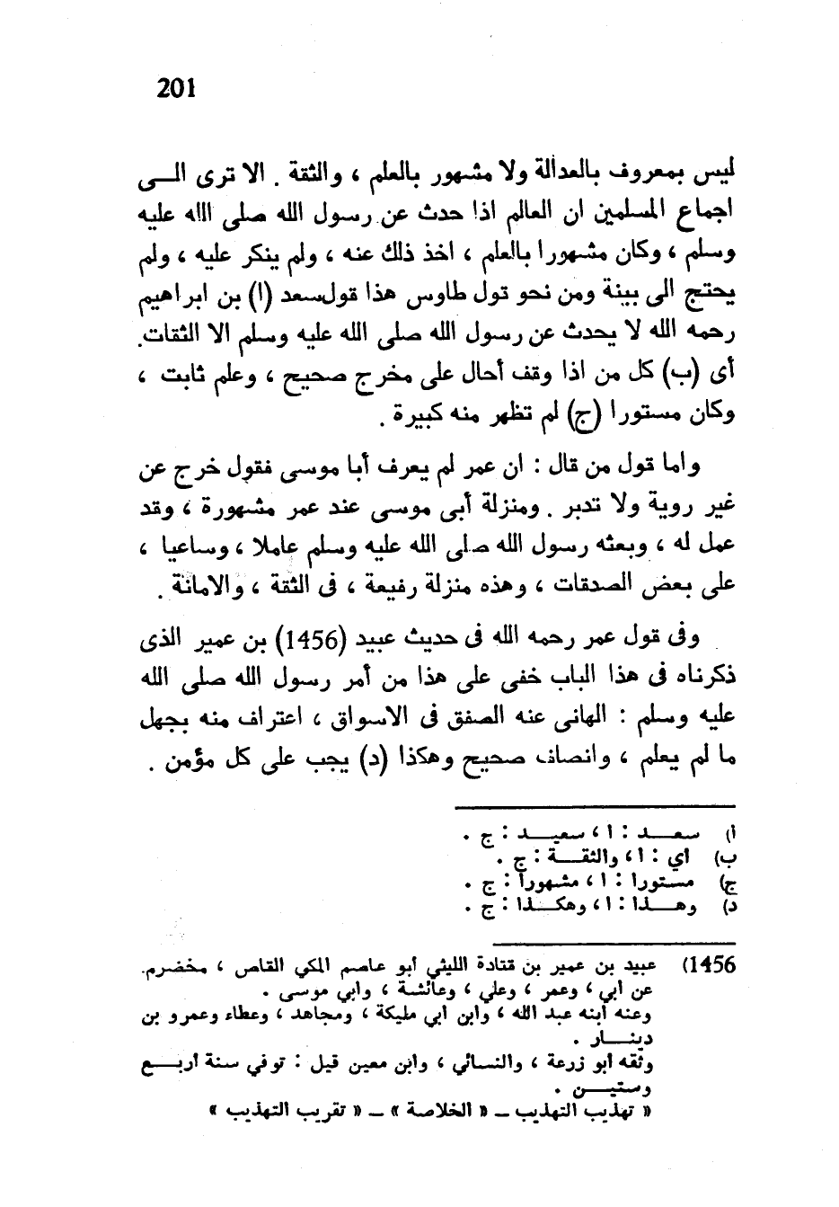 لَيْسَ بِمَعْرُوفٍ بِالْعَدَالَةِ وَلَا مَشْهُورٍ بِالْعِلْمِ وَالثِّقَةِ أَلَا تَرَى إِلَى إِجْمَاعِ الْمُسْلِمِينَ أَنَّ الْعَالِمَ إِذَا حَدَّثَ عَنْ رَسُولِ اللَّهِ صَلَّى اللَّهُ عَلَيْهِ وَسَلَّمَ وَكَانَ مَشْهُورًا بِالْعِلْمِ أُخِذَ ذَلِكَ عَنْهُ وَلَمْ يُنْكَرْ عَلَيْهِ وَلَمْ يُحْتَجْ إِلَى بَيِّنَةٍ وَمِنْ نَحْوِ قَوْلِ طَاوُسٍ هَذَا قَوْلُ سَعْدِ بْنِ إِبْرَاهِيمَ رَحِمَهُ اللَّهُ لَا يُحَدِّثُ عَنْ رَسُولِ اللَّهِ صَلَّى اللَّهُ عَلَيْهِ وَسَلَّمَ إِلَّا الثِّقَاتُ أَيْ كُلُّ مَنْ إِذَا وُقِفَ أَحَالَ عَلَى مَخْرَجٍ صَحِيحٍ وَعَلَمٍ ثَابِتٍ وَكَانَ مَسْتُورًا لَمْ تَظْهَرْ مِنْهُ كَبِيرَةٌ وَأَمَّا قَوْلُ مَنْ قَالَ إِنَّ عُمَرَ لَمْ يَعْرِفْ أَبَا مُوسَى فَقَوْلٌ خَرَجَ عَنْ غَيْرِ رَوِيَّةٍ وَلَا تَدَبُّرٍ وَمَنْزِلَةُ أَبِي مُوسَى عِنْدَ عُمَرَ مَشْهُورَةٌ وَقَدْ عَمِلَ لَهُ وَبَعَثَهُ رَسُولُ اللَّهِ صَلَّى اللَّهُ عَلَيْهِ وَسَلَّمَ عَامِلًا وَسَاعِيًا عَلَى بَعْضِ الصَّدَقَاتِ وَهَذِهِ مَنْزِلَةٌ رَفِيعَةٌ فِي الثِّقَةِ وَالْأَمَانَةِ وَفِي قَوْلِ عُمَرَ رَحِمَهُ اللَّهُ فِي حَدِيثِ عُبَيْدِ 1456) بْنِ عُمَيْرٍ الَّذِي ذَكَرْنَاهُ فِي هَذَا الْبَابِ خَفِيَ عَلَيَّ هَذَا مِنْ أَمْرِ رَسُولِ اللَّهِ صَلَّى اللَّهُ عَلَيْهِ وَسَلَّمَ أَلْهَانِي عَنْهُ الصَّفْقُ فِي الْأَسْوَاقِ اعْتِرَافٌ مِنْهُ بِجَهْلِ مَا لَمْ يَعْلَمْ وَإِنْصَافٌ صَحِيحٌ وَهَكَذَا يَجِبُ عَلَى كل مؤمن