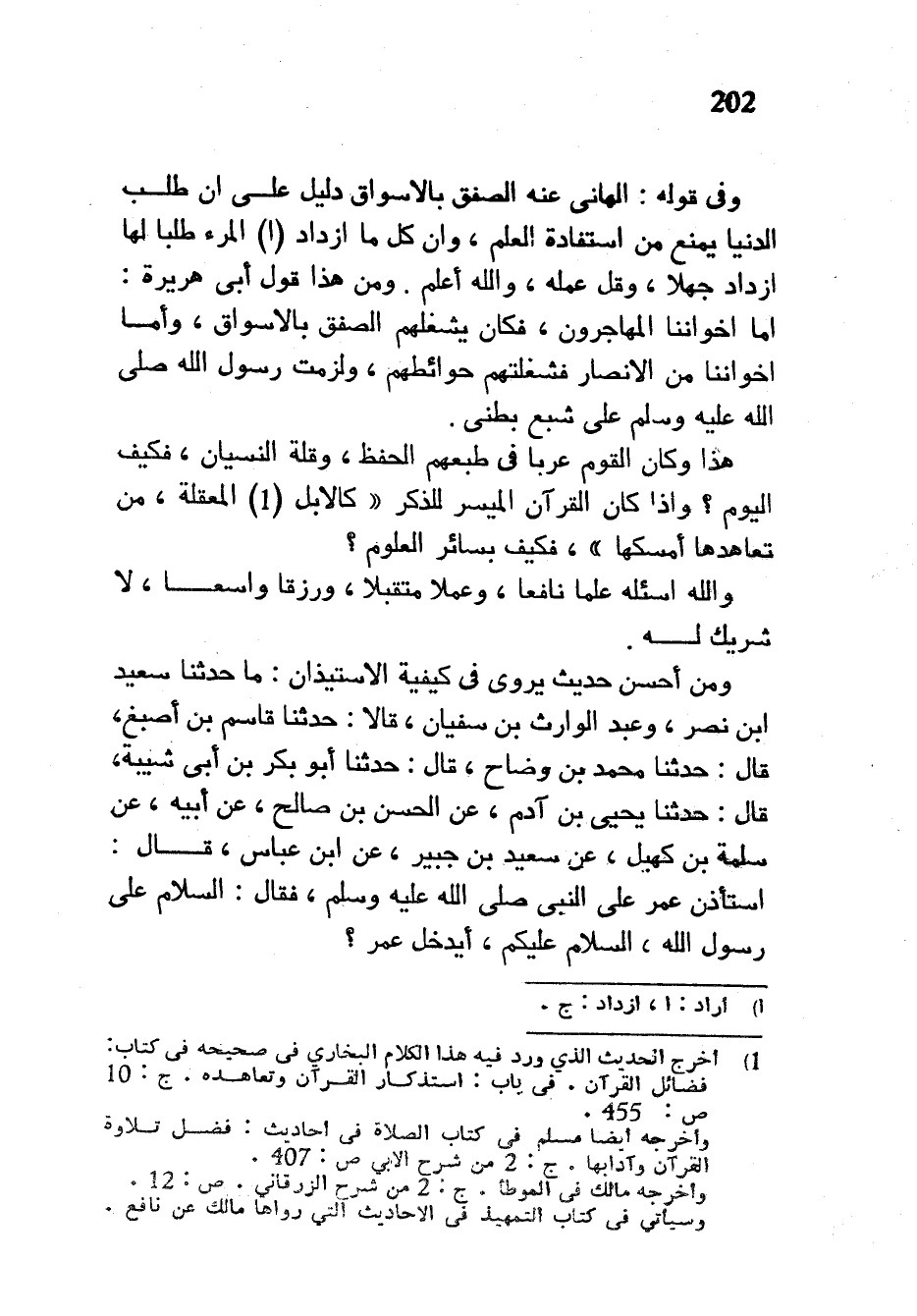 وَفِي قَوْلِهِ أَلْهَانِي عَنْهُ الصَّفْقُ بِالْأَسْوَاقِ دَلِيلٌ عَلَى أَنَّ طَلَبَ الدُّنْيَا يَمْنَعُ مِنَ اسْتِفَادَةِ العلم وإن كل ما ازْدَادَ الْمَرْءُ طَلَبًا لَهَا ازْدَادَ جَهْلًا وَقَلَّ عَمَلُهُ وَاللَّهُ أَعْلَمُ وَمِنْ هَذَا قَوْلُ أَبِي هُرَيْرَةَ أَمَّا إِخْوَانُنَا الْمُهَاجِرُونَ فَكَانَ يَشْغَلُهُمُ الصَّفْقُ بِالْأَسْوَاقِ وَأَمَّا إِخْوَانُنَا مِنَ الْأَنْصَارِ فَشَغَلَتْهُمْ حَوَائِطُهُمْ وَلَزِمْتُ رَسُولَ اللَّهِ صَلَّى اللَّهُ عَلَيْهِ وَسَلَّمَ عَلَى شِبَعِ بَطْنِي هَذَا وَكَانَ الْقَوْمُ عَرَبًا فِي طَبْعِهِمُ الْحِفْظُ وَقِلَّةُ النِّسْيَانِ فَكَيْفَ الْيَوْمَ وَإِذَا كَانَ الْقُرْآنُ الْمُيَسَّرُ لِلذِّكْرِ كَالْإِبِلِ الْمُعَقَّلَةِ مَنْ تَعَاهَدَهَا أَمْسَكَهَا فَكَيْفَ بِسَائِرِ الْعُلُومِ وَاللَّهَ اسئله عِلْمًا نَافِعًا وَعَمَلًا مُتَقَبَّلًا وَرِزْقًا وَاسِعًا لَا شَرِيكَ لَهُ وَمِنْ أَحْسَنِ حَدِيثٍ يُرْوَى فِي كيفية الاستيذان ما حدثنا سعيد ابن نَصْرٍ وَعَبْدُ الْوَارِثِ بْنُ سُفْيَانَ قَالَا حَدَّثَنَا قَاسِمُ بْنُ أَصْبَغَ قَالَ حَدَّثَنَا مُحَمَّدُ بْنُ وَضَّاحٍ قَالَ حَدَّثَنَا أَبُو بَكْرِ بْنُ أَبِي شَيْبَةَ قَالَ حَدَّثَنَا يَحْيَى بْنُ آدَمَ عَنِ الْحَسَنِ بْنِ صَالِحٍ عَنْ أَبِيهِ عَنْ سَلَمَةَ بْنِ كُهَيْلٍ عَنْ سَعِيدِ بْنِ جُبَيْرٍ عَنِ ابْنِ عَبَّاسٍ قال اتساذن عُمَرُ عَلَى النَّبِيِّ صَلَّى اللَّهُ عَلَيْهِ وَسَلَّمَ فَقَالَ السَّلَامُ عَلَى رَسُولِ اللَّهِ السَّلَامُ عَلَيْكُمْ أيدخل عمر