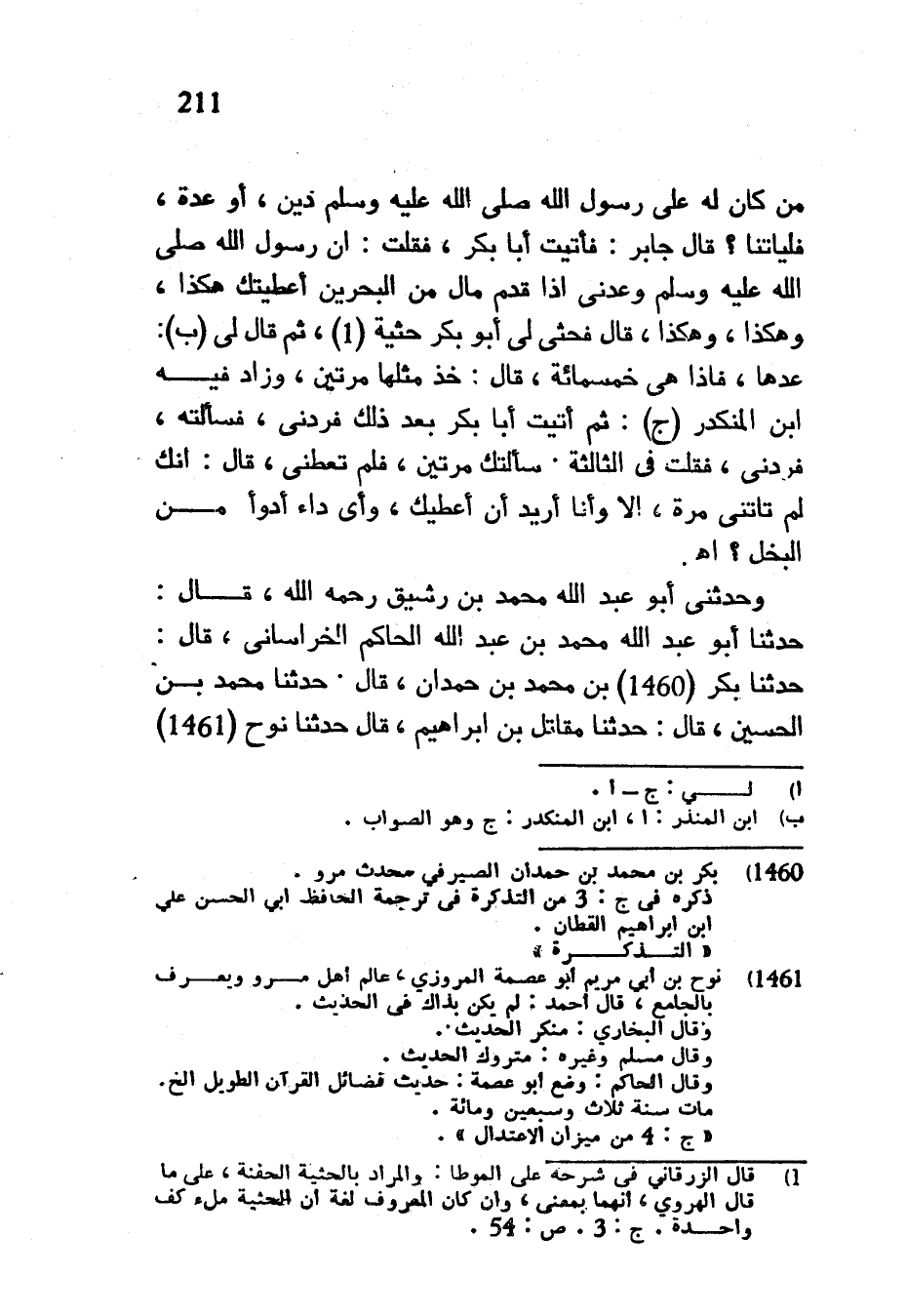 مَنْ كَانَ لَهُ عَلَى رَسُولِ اللَّهِ صَلَّى اللَّهُ عَلَيْهِ وَسَلَّمَ دَيْنٌ أَوْ عِدَةٌ فَلْيَأْتِنَا قَالَ جَابِرٌ فَأَتَيْتُ أَبَا بَكْرٍ فَقُلْتُ إِنَّ رَسُولَ اللَّهِ صَلَّى اللَّهُ عَلَيْهِ وَسَلَّمَ وَعَدَنِي إِذَا قَدِمَ مَالٌ مِنَ الْبَحْرَيْنِ أَعْطَيْتُكَ هَكَذَا وَهَكَذَا وَهَكَذَا قَالَ فَحَثَى لِي أَبُو بَكْرٍ حَثْيَةً ثُمَّ قَالَ لِي عُدَّهَا فَإِذَا هِيَ خَمْسُمِائَةٍ قَالَ خُذْ مِثْلَهَا مَرَّتَيْنِ وَزَادَ فِيهِ ابْنُ الْمُنْكَدِرِ ثُمَّ أَتَيْتُ أَبَا بَكْرٍ بَعْدَ ذَلِكَ فَرَدَّنِي فَسَأَلْتُهُ فَرَدَّنِي فَقُلْتُ فِي الثَّالِثَةِ سَأَلْتُكَ مَرَّتَيْنِ فَلَمْ تُعْطِنِي قَالَ إِنَّكَ لَمْ تَأْتِنِي مَرَّةً إِلَّا وَأَنَا أُرِيدُ أَنْ أُعْطِيَكَ وَأَيُّ دَاءٍ أَدْوَأُ مِنَ الْبُخْلِ اهـ وَحَدَّثَنِي أَبُو عَبْدِ اللَّهِ مُحَمَّدُ بْنُ رَشِيقٍ رَحِمَهُ اللَّهُ قَالَ حَدَّثَنَا أَبُو عَبْدُ اللَّهِ مُحَمَّدُ بْنُ عَبْدِ اللَّهِ الْحَاكِمُ الْخُرَاسَانِيُّ قَالَ حَدَّثَنَا بَكْرُ بْنُ مُحَمَّدِ بْنِ حَمْدَانَ قَالَ حَدَّثَنَا مُحَمَّدُ بْنُ الْحُسَيْنِ قَالَ حَدَّثَنَا مُقَاتِلُ بْنُ إبراهيم قال حدثنا نوح