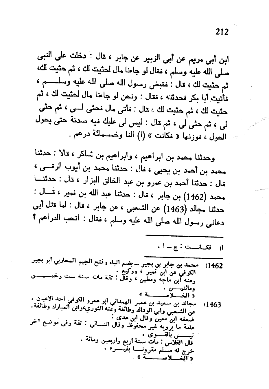 ابن أَبِي مَرْيَمَ عَنْ أَبِي الزُّبَيْرِ عَنْ جَابِرٍ قَالَ دَخَلْتُ عَلَى النَّبِيِّ صَلَّى اللَّهُ عَلَيْهِ وَسَلَّمَ فَقَالَ لَوْ جَاءَنَا مَالٌ لَحَثَيْتُ لَكَ ثم حثيت لك ثم حثيت لك قال فَقُبِضَ رَسُولُ اللَّهِ صَلَّى اللَّهُ عَلَيْهِ وَسَلَّمَ فَأَتَيْتُ أَبَا بَكْرٍ فَحَدَّثْتُهُ فَقَالَ وَنَحْنُ لَوْ جاءنا مال لحثيت لك ثم حثيت لك ثُمَّ حَثَيْتُ لَكِ قَالَ فَأَتَى مَالٌ فَحَثَى لِي ثُمَّ حَثَى لِي ثُمَّ حَثَى لِي ثُمَّ قَالَ لَيْسَ لِي عَلَيْكِ فِيهِ صَدَقَةٌ حَتَّى يَحُولَ الْحَوْلُ فَوَزَنَهَا فَكَانَتْ أَلْفًا وَخَمْسَمِائَةِ دِرْهَمٍ وَحَدَّثَنَا مُحَمَّدُ بْنُ إِبْرَاهِيمَ وَإِبْرَاهِيمُ بْنُ شَاكِرٍ قَالَا حَدَّثَنَا مُحَمَّدُ بْنُ أَحْمَدَ بْنِ يَحْيَى قَالَ حَدَّثَنَا مُحَمَّدُ بْنُ أَيُّوبَ الرَّقِّيُّ قَالَ حَدَّثَنَا أَحْمَدُ بْنُ عَمْرِو بْنِ عَبْدِ الْخَالِقِ الْبَزَّارُ قَالَ حَدَّثَنَا مُحَمَّدُ بْنُ جَابِرٍ قَالَ حَدَّثَنَا عَبْدُ اللَّهِ بْنُ نُمَيْرٍ قَالَ حَدَّثَنَا مَجَالِدٌ عَنِ الشَّعْبِيِّ عَنْ جَابِرٍ قَالَ لَمَّا قُتِلَ أَبِي دَعَانِي رَسُولُ اللَّهِ صَلَّى اللَّهُ عَلَيْهِ وَسَلَّمَ فَقَالَ أَتُحِبُّ الدَّرَاهِمَ