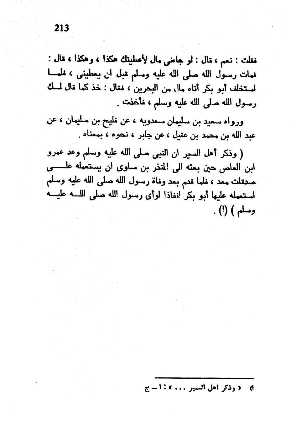 فَقُلْتُ نَعَمْ قَالَ لَوْ جَاءَنِي مَالٌ لَأَعْطَيْتُكَ هَكَذَا وَهَكَذَا قَالَ فَمَاتَ رَسُولُ اللَّهِ صَلَّى اللَّهُ عَلَيْهِ وَسَلَّمَ قَبْلَ أَنْ يُعْطِيَنِي فَلَمَّا اسْتُخْلِفَ أَبُو بَكْرٍ أَتَاهُ مَالٌ مِنَ الْبَحْرَيْنِ فَقَالَ خُذْ كَمَا قَالَ لَكَ رَسُولُ اللَّهِ صَلَّى اللَّهُ عَلَيْهِ وَسَلَّمَ فَأَخَذْتُ وَرَوَاهُ سَعِيدُ بْنُ سُلَيْمَانَ سَعْدَوَيْهِ عَنْ فُلَيْحِ بْنِ سُلَيْمَانَ عَنْ عَبْدِ اللَّهِ بْنِ مُحَمَّدِ بْنِ عَقِيلٍ عَنْ جَابِرٍ نَحْوَهُ بِمَعْنَاهُ (وَذَكَرَ أَهْلُ السِّيَرِ أَنَّ النَّبِيَّ صَلَّى اللَّهُ عَلَيْهِ وَسَلَّمَ وَعَدَ عمرو ابن الْعَاصِ حِينَ بَعَثَهُ إِلَى الْمُنْذِرِ بْنِ سَاوَى أَنْ يَسْتَعْمِلَهُ عَلَى صَدَقَاتِ مَعْدٍ فَلَمَّا قَدِمَ بَعْدَ وَفَاةِ رَسُولِ اللَّهِ صَلَّى اللَّهُ عَلَيْهِ وَسَلَّمَ اسْتَعْمَلَهُ عَلَيْهَا أَبُو بَكْرٍ إِنْفَاذًا لِرَأْيِ رسول الله صلى الله عليه وسلم) (أ)