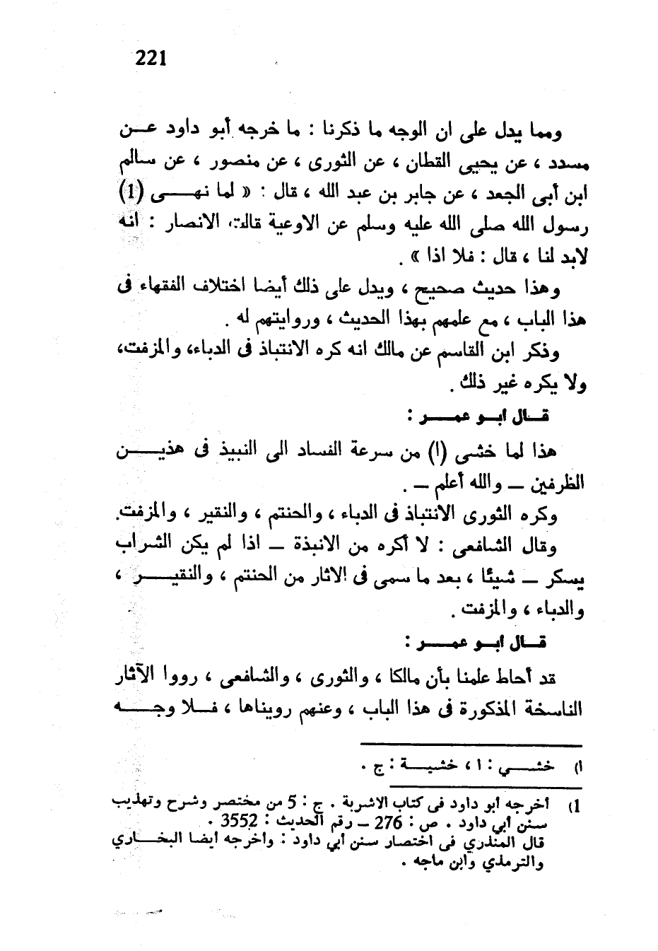 وَمِمَّا يَدُلُّ عَلَى أَنَّ الْوَجْهَ مَا ذَكَرْنَا مَا خَرَّجَهُ أَبُو دَاوُدَ عَنْ مُسَدَّدٍ عَنْ يَحْيَى الْقَطَّانِ عَنِ الثَّوْرِيِّ عَنْ مَنْصُورٍ عَنْ سالم ابن أَبِي الْجَعْدِ عَنْ جَابِرِ بْنِ عَبْدِ اللَّهِ قَالَ لَمَّا نَهَى رَسُولُ اللَّهِ صَلَّى اللَّهُ عَلَيْهِ وَسَلَّمَ عَنِ الْأَوْعِيَةِ قَالَتِ الْأَنْصَارُ إِنَّهُ لَا بُدَّ لَنَا قَالَ فَلَا إِذًا وَهَذَا حَدِيثٌ صَحِيحٌ وَيَدُلُّ عَلَى ذَلِكَ أَيْضًا اخْتِلَافُ الْفُقَهَاءِ فِي هَذَا الْبَابِ مَعَ عِلْمِهِمْ بِهَذَا الْحَدِيثِ وَرِوَايَتِهِمْ لَهُ وَذَكَرَ ابْنُ الْقَاسِمِ عَنْ مَالِكٍ أَنَّهُ كَرِهَ الِانْتِبَاذَ فِي الدُّبَّاءِ وَالْمُزَفَّتِ وَلَا يَكْرَهُ غَيْرَ ذَلِكَ قَالَ أَبُو عُمَرَ هَذَا لَمَّا خَشِيَ مِنْ سُرْعَةِ الْفَسَادِ إِلَى النَّبِيذِ فِي هَذَيْنِ الظَّرْفَيْنِ وَاللَّهُ أَعْلَمُ وَكَرِهَ الثَّوْرِيُّ الِانْتِبَاذَ فِي الدُّبَّاءِ وَالْحَنْتَمِ وَالنَّقِيرِ وَالْمُزَفَّتِ وَقَالَ الشَّافِعِيُّ لَا أَكْرَهُ مِنَ الْأَنْبِذَةِ إِذَا لَمْ يَكُنِ الشَّرَابُ يُسْكِرُ شَيْئًا بَعْدَ مَا سُمِّيَ فِي الْآثَارِ مِنَ الْحَنْتَمِ وَالنَّقِيرِ وَالدُّبَّاءِ وَالْمُزَفَّتِ قَالَ أَبُو عُمَرَ قَدْ أَحَاطَ عِلْمُنَا بِأَنَّ مَالِكًا وَالثَّوْرِيَّ وَالشَّافِعِيَّ رَوَوُا الْآثَارَ النَّاسِخَةَ الْمَذْكُورَةَ فِي هَذَا الْبَابِ وَعَنْهُمْ رُوِّينَاهَا فَلَا وجه