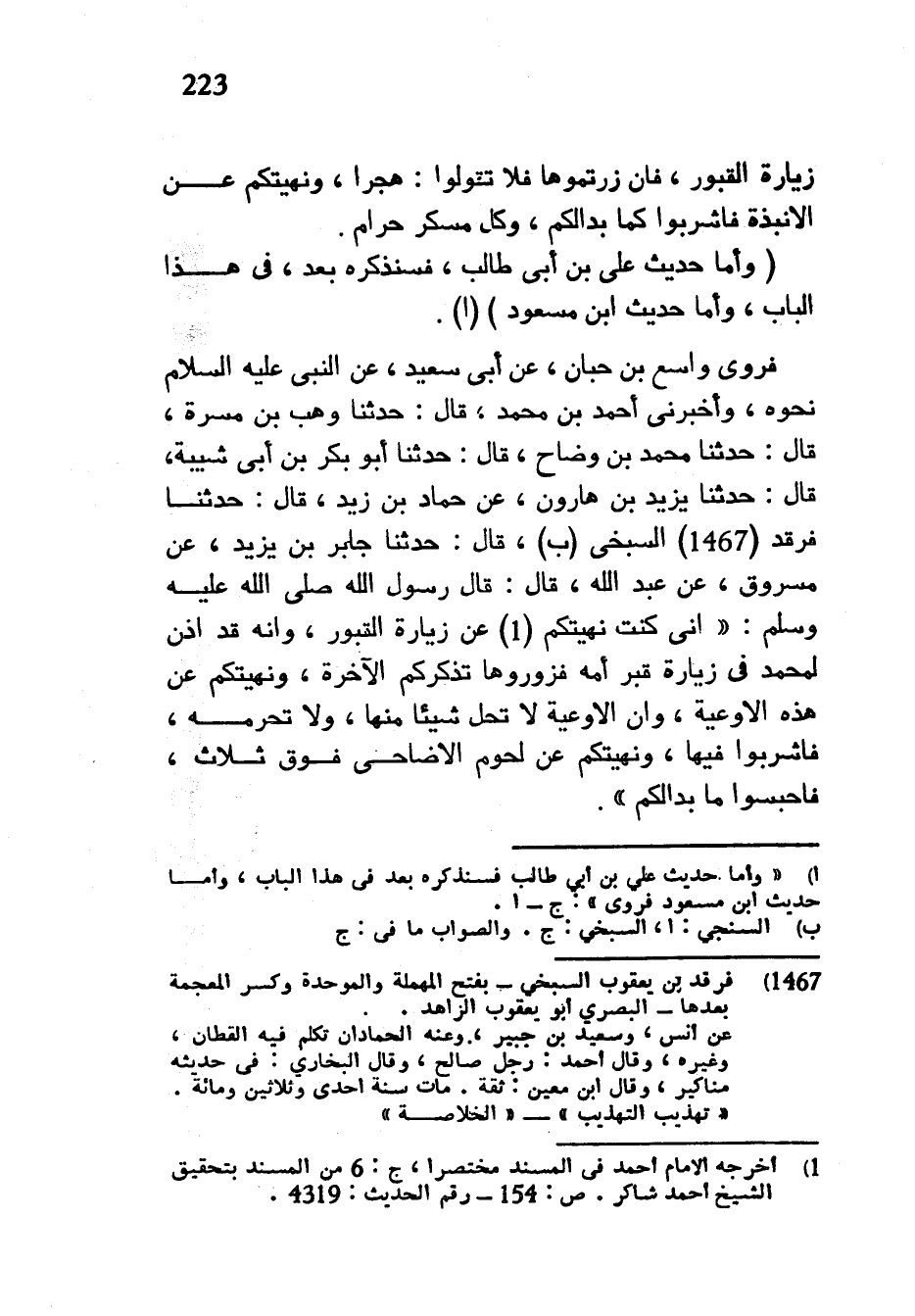 زِيَارَةِ الْقُبُورِ فَإِنْ زُرْتُمُوهَا فَلَا تَقُولُوا هُجْرًا وَنَهَيْتُكُمْ عَنِ الْأَنْبِذَةِ فَاشْرَبُوا كَمَا بَدَا لَكُمْ وَكُلُّ مُسْكِرٍ حَرَامٌ (وَأَمَّا حَدِيثُ عَلِيِّ بْنِ أَبِي طَالِبٍ فَسَنَذْكُرُهُ بَعْدُ فِي هَذَا الْبَابِ وأما حديث ابن مسعود) (أ) فَرَوَى وَاسِعُ بْنُ حَبَّانَ عَنْ أَبِي سَعِيدٍ عَنِ النَّبِيِّ عَلَيْهِ السَّلَامُ نَحْوَهُ وَأَخْبَرَنِي أَحْمَدُ بْنُ مُحَمَّدٍ قَالَ حَدَّثَنَا وَهْبُ بْنُ مَسَرَّةَ قَالَ حَدَّثَنَا مُحَمَّدُ بْنُ وَضَّاحٍ قَالَ حَدَّثَنَا أَبُو بَكْرِ بْنُ أَبِي شَيْبَةَ قَالَ حَدَّثَنَا يَزِيدُ بْنُ هَارُونَ عَنْ حَمَّادِ بْنِ زَيْدٍ قَالَ حَدَّثَنَا فَرْقَدٌ السَّبَخِيُّ قَالَ حَدَّثَنَا جَابِرُ بْنُ يَزِيدَ عَنْ مَسْرُوقٍ عَنْ عَبْدِ اللَّهِ قَالَ قَالَ رَسُولُ اللَّهِ صَلَّى اللَّهُ عَلَيْهِ وَسَلَّمَ إِنِّي كُنْتُ نَهَيْتُكُمْ عَنْ زِيَارَةِ الْقُبُورِ وَإِنَّهُ قَدْ أُذِنَ لِمُحَمَّدٍ فِي زِيَارَةِ قَبْرِ أمه فزرورها تُذَكِّرْكُمُ الْآخِرَةَ وَنَهَيْتُكُمْ عَنْ هَذِهِ الْأَوْعِيَةِ وَإِنَّ الْأَوْعِيَةَ لَا تَحُلُّ شَيْئًا مِنْهَا وَلَا تُحَرِّمُهُ فَاشْرَبُوا فِيهَا وَنَهَيْتُكُمْ عَنْ لُحُومِ الْأَضَاحِي فَوْقَ ثَلَاثٍ فَاحْبِسُوا مَا بَدَا لَكُمْ