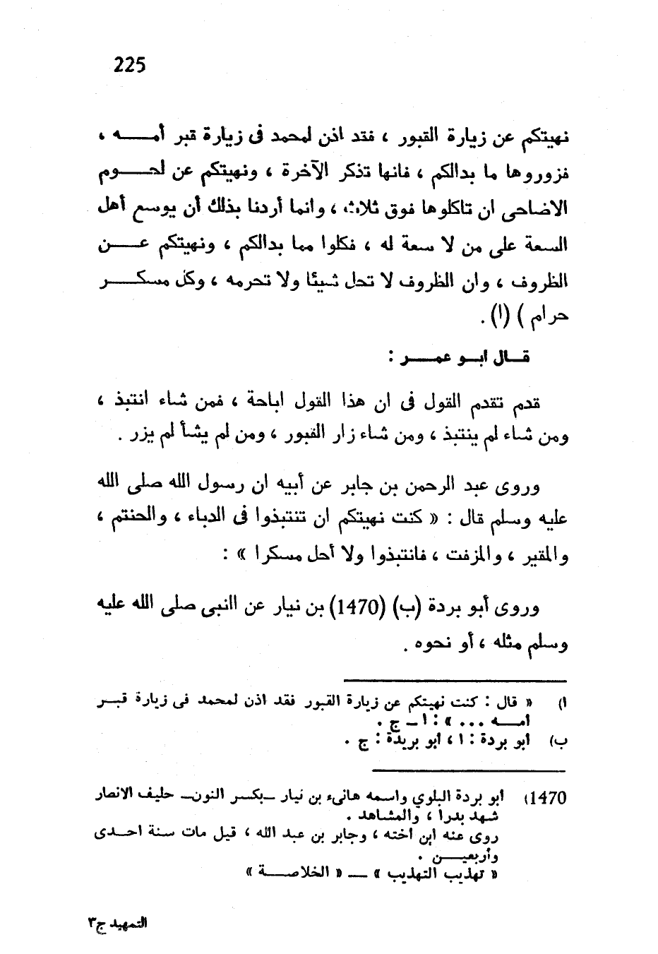 نَهَيْتُكُمْ عَنْ زِيَارَةِ الْقُبُورِ فَقَدْ أُذِنَ لِمُحَمَّدٍ فِي زِيَارَةِ قَبْرِ أُمِّهِ فَزُورُوهَا مَا بَدَا لَكُمْ فَإِنَّهَا تُذَكِّرُ الْآخِرَةَ وَنَهَيْتُكُمْ عَنْ لُحُومِ الْأَضَاحِي أَنْ تَأْكُلُوهَا فَوْقَ ثَلَاثٍ وَإِنَّمَا أَرَدْنَا بِذَلِكَ أَنْ يُوَسِّعَ أَهْلُ السَّعَةِ عَلَى مَنْ لَا سَعَةَ لَهُ فَكُلُوا مِمَّا بَدَا لَكُمْ وَنَهَيْتُكُمْ عَنِ الظُّرُوفِ وَإِنَّ الظُّرُوفَ لَا تَحُلُّ شَيْئًا وَلَا تُحَرِّمُهُ وَكُلُّ مُسْكِرٍ حَرَامٌ) قَالَ أبو عمر قدم تَقَدَّمَ الْقَوْلُ فِي أَنَّ هَذَا الْقَوْلَ إِبَاحَةٌ فَمَنْ شَاءَ انْتَبَذَ وَمَنْ شَاءَ لَمْ يَنْتَبِذْ وَمَنْ شَاءَ زَارَ الْقُبُورَ وَمَنْ لَمْ يَشَأْ لَمْ يَزُرْ وَرَوَى عَبْدُ الرَّحْمَنِ بْنُ جَابِرٍ عَنْ أَبِيهِ أَنَّ رَسُولَ اللَّهِ صَلَّى اللَّهُ عَلَيْهِ وَسَلَّمَ قَالَ كُنْتُ نَهَيْتُكُمْ أَنْ تَنْتَبِذُوا في الدباء والحنتم والمقير والمزفت فانبتذوا وَلَا أُحِلُّ مُسْكِرًا وَرَوَى أَبُو بُرْدَةَ بْنُ نِيَارٍ عَنِ النَّبِيِّ صَلَّى اللَّهُ عَلَيْهِ وَسَلَّمَ مِثْلَهُ أَوْ نَحْوَهُ