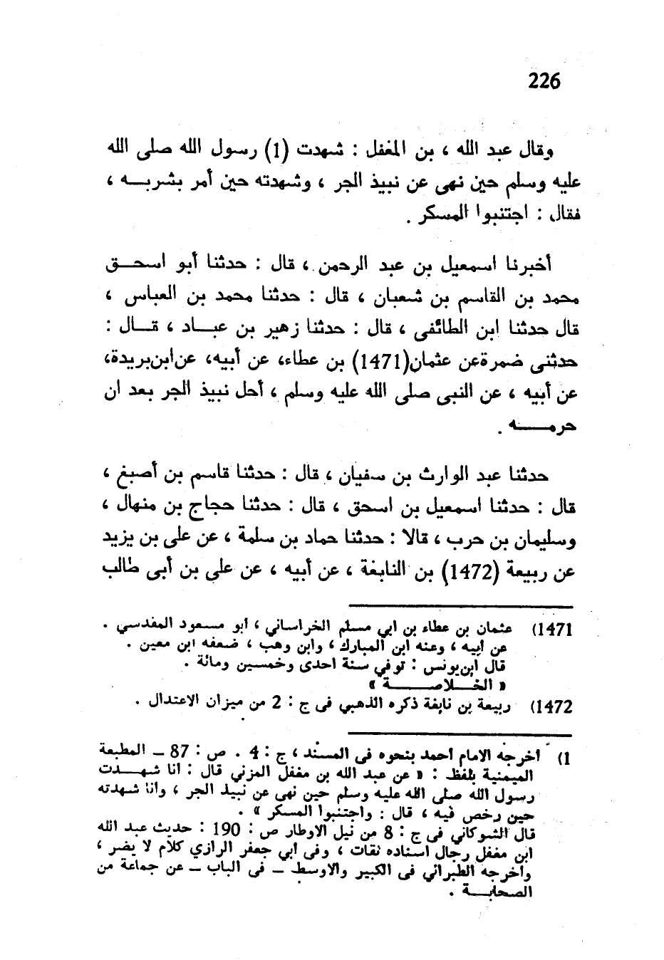 وَقَالَ عَبْدُ اللَّهِ بْنُ الْمُغَفَّلِ شَهِدْتُ رَسُولَ اللَّهِ صَلَّى اللَّهُ عَلَيْهِ وَسَلَّمَ حِينَ نَهَى عَنْ نَبِيذِ الْجَرِّ وَشَهِدْتُهُ حِينَ أَمَرَ بِشُرْبِهِ فقال اجتنبوا المسكر أخبرنا إسمعيل بن عبد الرحمن قال حدثنا أبو اسحق مُحَمَّدُ بْنُ الْقَاسِمِ بْنِ شَعْبَانَ قَالَ حَدَّثَنَا مُحَمَّدُ بْنُ الْعَبَّاسِ قَالَ حَدَّثَنَا ابْنُ الطَّائِفِيِّ قَالَ حَدَّثَنَا زُهَيْرُ بْنُ عَبَّادٍ قَالَ حَدَّثَنِي ضَمْرَةُ عَنْ عُثْمَانَ بْنِ عَطَاءٍ عَنْ أَبِيهِ عَنِ ابْنِ بُرَيْدَةَ عَنْ أَبِيهِ عَنِ النَّبِيِّ صَلَّى اللَّهُ عَلَيْهِ وَسَلَّمَ أَحَلَّ نَبِيذَ الْجَرِّ بَعْدَ أَنْ حَرَّمَهُ حَدَّثَنَا عَبْدُ الْوَارِثِ بْنُ سُفْيَانَ قَالَ حَدَّثَنَا قاسم بن أصبغ قال حدثنا إسمعيل بن إسحق قَالَ حَدَّثَنَا حَجَّاجُ بْنُ مِنْهَالٍ وَسُلَيْمَانُ بْنُ حَرْبٍ قَالَ حَدَّثَنَا حَمَّادُ بْنُ سَلَمَةَ عَنْ عَلِيِّ بْنِ يَزِيدَ عَنْ رَبِيعَةَ بْنِ النَّابِغَةِ عَنْ أَبِيهِ عَنْ عَلِيِّ بْنِ أَبِي طَالِبٍ