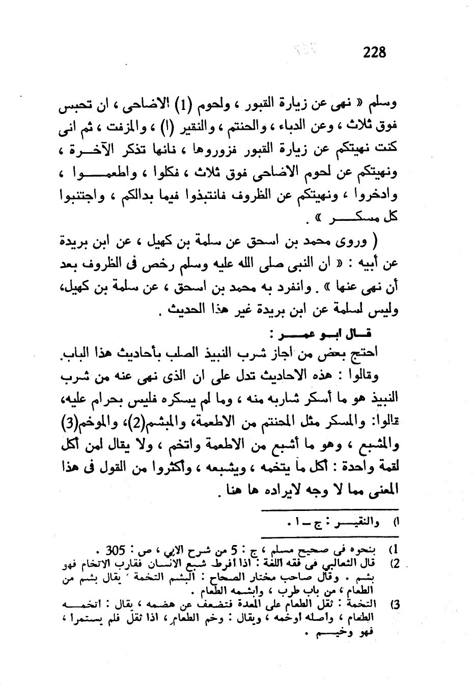 نَهَى عَنْ زِيَارَةِ الْقُبُورِ وَلُحُومِ الْأَضَاحِي أَنْ تُحْبَسَ فَوْقَ ثَلَاثٍ وَعَنِ الدُّبَّاءِ وَالْحَنْتَمِ وَالنَّقِيرِ وَالْمُزَفَّتِ ثُمَّ إِنِّي كُنْتُ نَهَيْتُكُمْ عَنْ زِيَارَةِ الْقُبُورِ فَزُورُوهَا فَإِنَّهَا تُذَكِّرُ الْآخِرَةَ وَنَهَيْتُكُمْ عَنْ لُحُومِ الْأَضَاحِي فَوْقَ ثَلَاثٍ فَكَلُّوا وَأَطْعِمُوا وَادَّخِرُوا وَنَهَيْتُكُمْ عَنِ الظُّرُوفِ فَانْتَبِذُوا فِيمَا بَدَا لَكُمْ وَاجْتَنِبُوا كُلَّ مُسْكِرٍ (وَرَوَى مُحَمَّدُ بْنُ إِسْحَاقَ عَنْ سَلَمَةَ بْنِ كُهَيْلٍ عَنِ ابْنِ بُرَيْدَةَ عَنْ أَبِيهِ أَنَّ النَّبِيَّ صَلَّى اللَّهُ عَلَيْهِ وَسَلَّمَ رَخَّصَ فِي الظُّرُوفِ بَعْدَ أَنْ نَهَى عَنْهَا وَانْفَرَدَ بِهِ مُحَمَّدُ بْنُ إِسْحَاقَ عَنْ سَلَمَةَ بْنِ كُهَيْلٍ وَلَيْسَ لِسَلَمَةَ عَنِ ابْنِ بُرَيْدَةَ غَيْرُ هَذَا الْحَدِيثِ قَالَ أَبُو عُمَرَ احْتَجَّ بَعْضُ مَنْ أَجَازَ شُرْبَ النَّبِيذِ الصَّلْبِ بِأَحَادِيثِ هَذَا الْبَابِ وَقَالُوا هَذِهِ الْأَحَادِيثُ تَدُلُّ عَلَى أَنَّ الَّذِي نُهِيَ عَنْهُ مِنْ شُرْبِ النَّبِيذِ هُوَ مَا أَسْكَرَ شَارِبَهُ مِنْهُ وَمَا لَمْ يُسْكِرْهُ فَلَيْسَ بِحَرَامٍ عَلَيْهِ قَالُوا وَالْمُسْكِرُ مثل المحنتم من الاطعمة والمبشم (2) والموخم وَالْمُشَبَّعِ وَهُوَ مَا أَشْبَعَ مِنَ الْأَطْعِمَةِ وَأَتْخَمَ وَلَا يُقَالُ لِمَنْ أَكَلَ لُقْمَةً وَاحِدَةً أَكَلَ مَا يُتْخِمُهُ وَيُشْبِعُهُ وَأَكْثَرُوا مِنَ الْقَوْلِ فِي هذا المعنى مما لا وجه لإيراده يراده ها هنا
