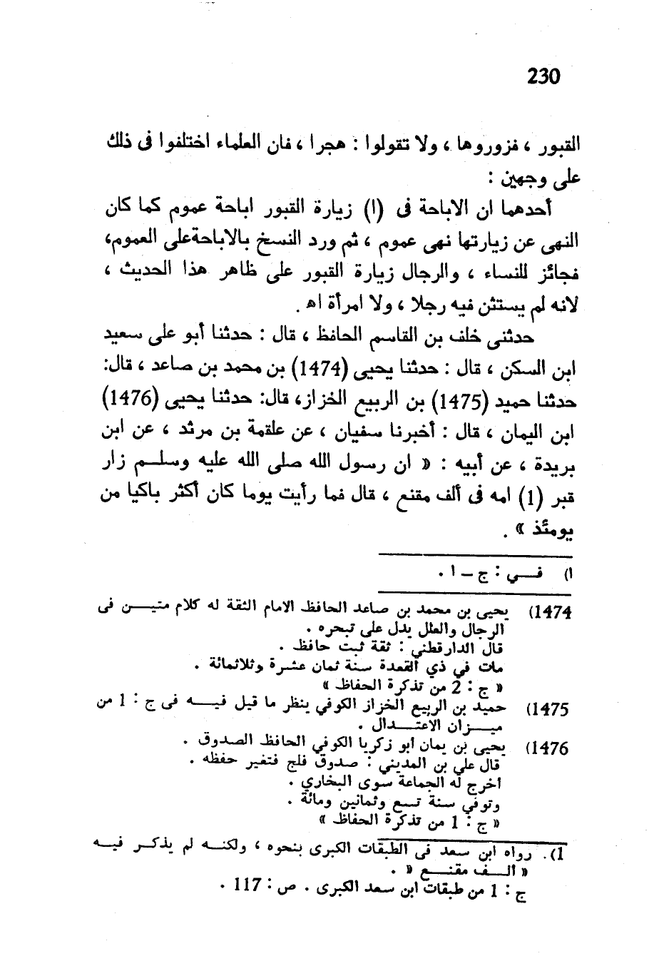 الْقُبُورِ فَزُورُوهَا وَلَا تَقُولُوا هُجْرًا فَإِنَّ الْعُلَمَاءَ اخْتَلَفُوا فِي ذَلِكَ عَلَى وَجْهَيْنِ أَحَدُهُمَا أَنَّ الْإِبَاحَةَ فِي زِيَارَةِ الْقُبُورِ إِبَاحَةُ عُمُومٍ كَمَا كَانَ النَّهْيُ عَنْ زِيَارَتِهَا نَهْيُ عُمُومٍ ثُمَّ وَرَدَ النَّسْخُ بِالْإِبَاحَةِ عَلَى الْعُمُومِ فَجَائِزٌ لِلنِّسَاءِ وَالرِّجَالِ زِيَارَةُ الْقُبُورِ عَلَى ظَاهِرِ هَذَا الْحَدِيثِ لِأَنَّهُ لَمْ يَسْتَثْنِ فِيهِ رَجُلًا وَلَا امْرَأَةً اهـ حَدَّثَنِي خَلَفُ بْنُ الْقَاسِمِ الْحَافِظُ قَالَ حَدَّثَنَا أَبُو علي سعيد ابن السَّكَنِ قَالَ حَدَّثَنَا يَحْيَى بْنُ مُحَمَّدِ بْنِ صَاعِدٍ قَالَ حَدَّثَنَا حَمِيدُ بْنُ الرَّبِيعِ الْخَزَّازُ قال حدثنا يحيى ابن الْيَمَانِ قَالَ أَخْبَرَنَا سُفْيَانُ عَنْ عَلْقَمَةَ بْنِ مَرْثَدٍ عَنِ ابْنِ بُرَيْدَةَ عَنْ أَبِيهِ أَنَّ رَسُولَ اللَّهِ صَلَّى اللَّهُ عَلَيْهِ وَسَلَّمَ زَارَ قَبْرَ أُمِّهِ فِي أَلْفِ مُقَنَّعٍ قَالَ فَمَا رَأَيْتُ يَوْمًا كَانَ أَكْثَرَ بَاكِيًا مِنْ يَوْمِئِذٍ