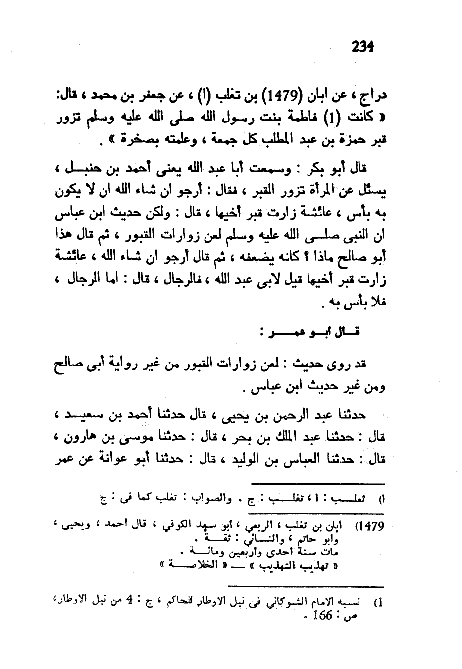 دَرَّاجٍ عَنْ أَبَانِ بْنِ تَغْلِبَ عَنْ جَعْفَرِ بْنِ مُحَمَّدٍ قَالَ كَانَتْ فَاطِمَةُ بِنْتُ رَسُولِ اللَّهِ صَلَّى اللَّهُ عَلَيْهِ وَسَلَّمَ تَزُورُ قَبْرَ حَمْزَةَ بْنِ عَبْدِ الْمُطَّلِبِ كُلَّ جُمُعَةٍ وَعَلَّمَتْهُ بِصَخْرَةٍ قَالَ أَبُو بَكْرٍ وَسَمِعْتُ أَبَا عَبْدِ اللَّهِ يَعْنِي أَحْمَدَ بْنَ حَنْبَلٍ يسئل عَنِ الْمَرْأَةِ تَزُورُ الْقَبْرَ فَقَالَ أَرْجُو إِنْ شَاءَ اللَّهُ أَنْ لَا يَكُونَ بِهِ بَأْسٌ عَائِشَةُ زَارَتْ قَبْرَ أَخِيهَا قَالَ وَلَكِنَّ حَدِيثَ ابْنِ عَبَّاسٍ أَنَّ النَّبِيَّ صَلَّى اللَّهُ عَلَيْهِ وَسَلَّمَ لَعَنَ زَوَّارَاتِ الْقُبُورِ ثُمَّ قَالَ هَذَا أَبُو صَالِحٍ مَاذَا كَأَنَّهُ يُضَعِّفُهُ ثُمَّ قَالَ أَرْجُو إِنْ شَاءَ اللَّهُ عَائِشَةُ زَارَتْ قَبْرَ أَخِيهَا قِيلَ لِأَبِي عَبْدِ اللَّهِ فَالرِّجَالُ قَالَ أَمَّا الرِّجَالُ فَلَا بَأْسَ بِهِ قَالَ أَبُو عُمَرَ قَدْ رُوِيَ حَدِيثُ لَعَنَ زَوَّارَاتِ الْقُبُورِ مِنْ غَيْرِ رِوَايَةِ أَبِي صَالِحٍ وَمِنْ غَيْرِ حَدِيثِ ابْنِ عَبَّاسٍ حَدَّثَنَا عَبْدُ الرَّحْمَنِ بْنُ يَحْيَى قَالَ حَدَّثَنَا أَحْمَدُ بْنُ سَعِيدٍ قَالَ حَدَّثَنَا عَبْدُ الْمَلِكِ بْنُ بَحْرٍ قَالَ حَدَّثَنَا مُوسَى بْنُ هَارُونَ قَالَ حَدَّثَنَا الْعَبَّاسُ بْنُ الْوَلِيدِ قَالَ حَدَّثَنَا أَبُو عَوَانَةَ عَنْ عُمَرَ