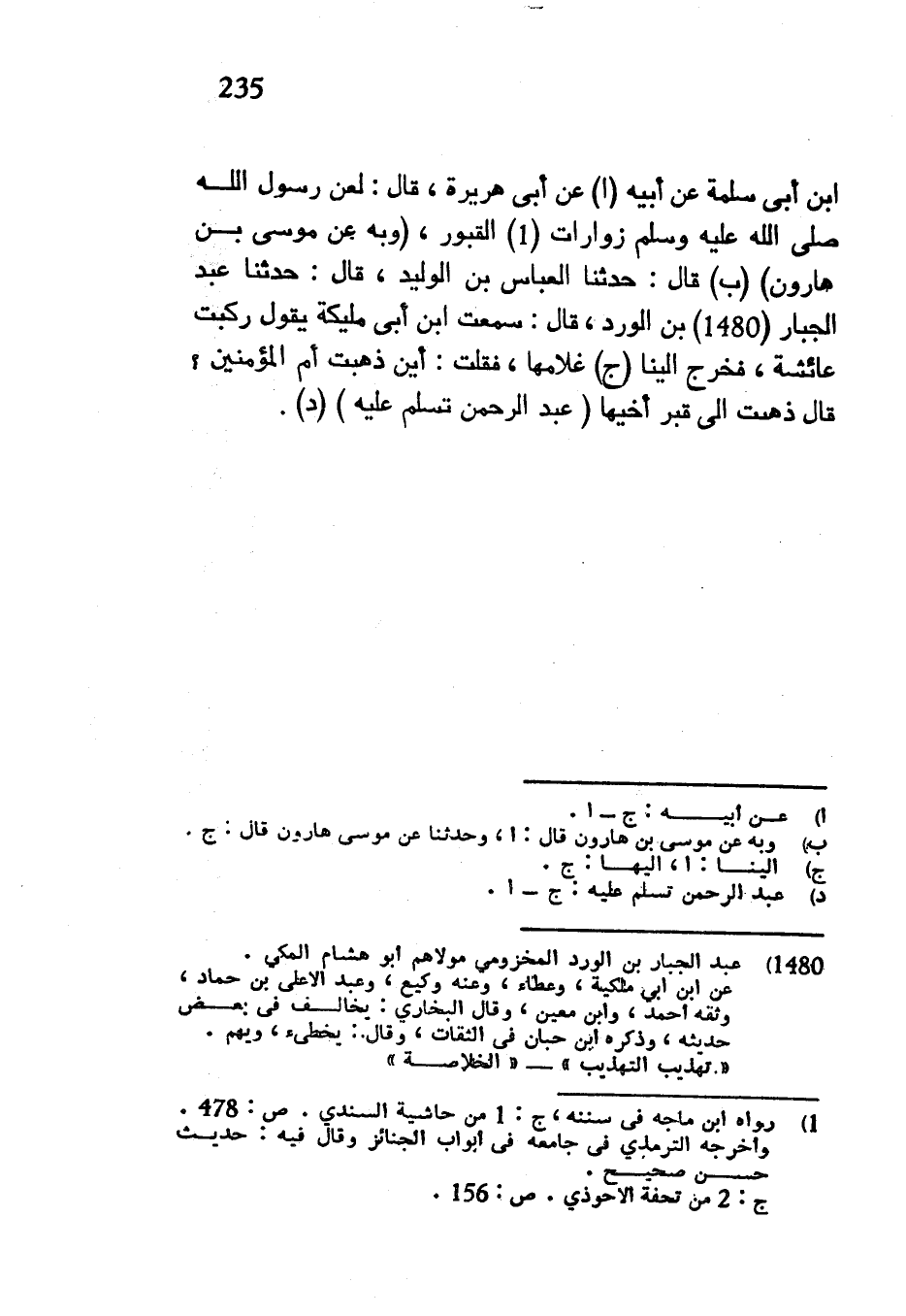 ابْنِ أَبِي سَلَمَةَ عَنْ أَبِيهِ عَنْ أَبِي هُرَيْرَةَ قَالَ لَعَنَ رَسُولُ اللَّهِ صَلَّى اللَّهُ عَلَيْهِ وَسَلَّمَ زَوَّارَاتِ الْقُبُورِ (وَبِهِ عَنْ مُوسَى بن هارون) (ب) قَالَ حَدَّثَنَا الْعَبَّاسُ بْنُ الْوَلِيدِ قَالَ حَدَّثَنَا عَبْدُ الْجَبَّارِ بْنُ الْوَرْدِ قَالَ سَمِعْتُ ابْنَ أَبِي مَلِيكَةَ يَقُولُ رَكِبَتْ عَائِشَةُ فَخَرَجَ إِلَيْنَا غُلَامُهَا فَقُلْتُ أَيْنَ ذَهَبَتْ أُمُّ الْمُؤْمِنِينَ قَالَ ذَهَبَتْ إِلَى قَبْرِ أَخِيهَا (عَبْدِ الرَّحْمَنِ تُسَلِّمُ عليه) (د)