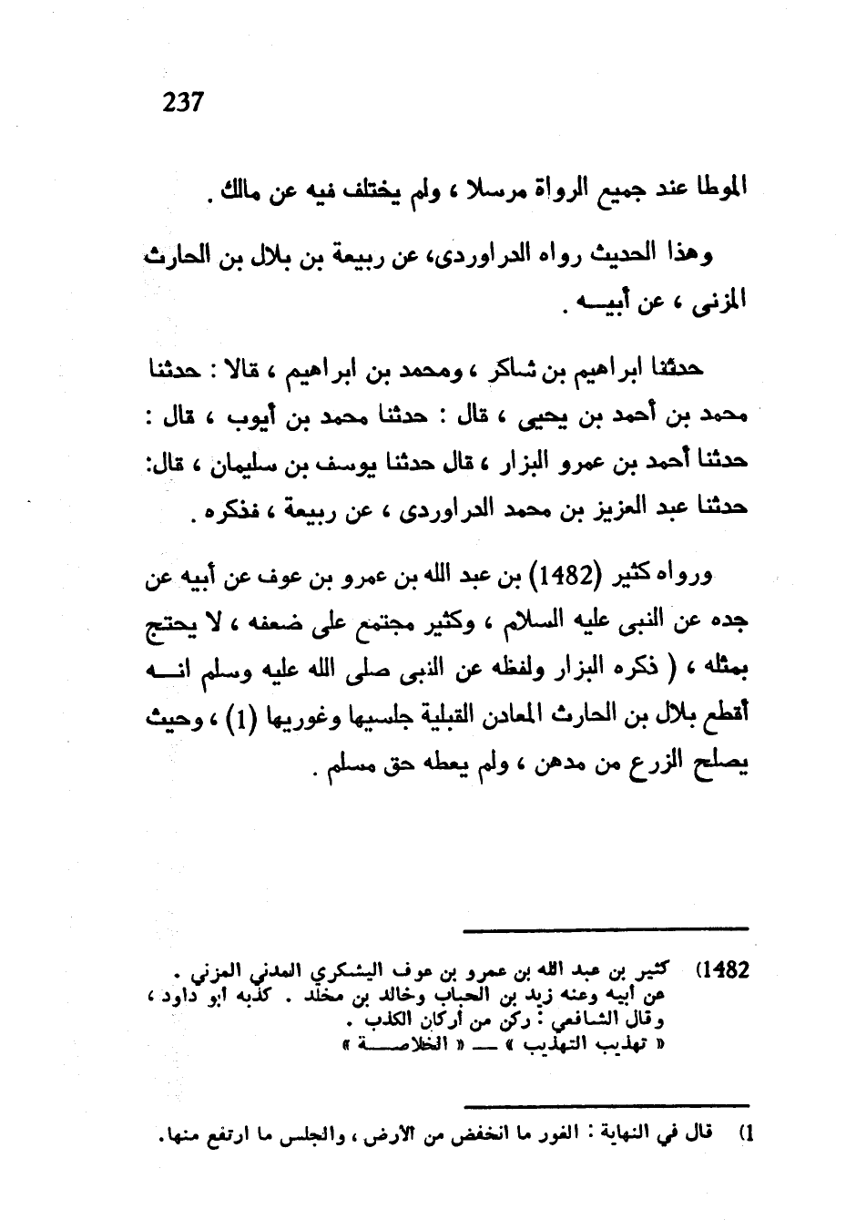 الْمُوَطَّأِ عِنْدَ جَمِيعِ الرُّوَاةِ مُرْسَلًا وَلَمْ يُخْتَلَفْ فِيهِ عَنْ مَالِكٍ وَهَذَا الْحَدِيثُ رَوَاهُ الدَّرَاوَرْدِيُّ عَنْ رَبِيعَةَ بْنِ بِلَالِ بْنِ الْحَارِثِ الْمُزَنِيِّ عَنْ أَبِيهِ حَدَّثَنَا إِبْرَاهِيمُ بْنُ شَاكِرٍ وَمُحَمَّدُ بْنُ إِبْرَاهِيمَ قَالَا حَدَّثَنَا مُحَمَّدُ بْنُ أَحْمَدَ بْنِ يَحْيَى قَالَ حَدَّثَنَا مُحَمَّدُ بْنُ أَيُّوبَ قَالَ حَدَّثَنَا أَحْمَدُ بْنُ عَمْرٍو الْبَزَّارُ قَالَ حَدَّثَنَا يُوسُفُ بْنُ سُلَيْمَانَ قَالَ حَدَّثَنَا عَبْدُ الْعَزِيزِ بْنُ مُحَمَّدٍ الدَّرَاوَرْدِيُّ عَنْ رَبِيعَةَ فَذَكَرَهُ وَرَوَاهُ كَثِيرُ بْنُ عَبْدِ اللَّهِ بْنِ عَمْرِو بْنِ عَوْفٍ عَنْ أَبِيهِ عَنْ جَدِّهِ عَنِ النَّبِيِّ عَلَيْهِ السَّلَامُ وَكَثِيرٌ مُجْتَمَعٌ عَلَى ضَعْفِهِ لَا يُحْتَجُّ بِمِثْلِهِ (ذَكَرَهُ الْبَزَّارُ وَلَفْظُهُ عَنِ النَّبِيِّ صَلَّى اللَّهُ عَلَيْهِ وَسَلَّمَ أَنَّهُ أَقْطَعَ بِلَالَ بْنَ الْحَارِثِ الْمَعَادِنَ الْقَبَلِيَّةَ جَلْسِيَّهَا وَغَوْرِيَّهَا (1) وَحَيْثُ يَصْلُحُ الزَّرْعُ مِنْ مُدْهِنٍ وَلَمْ يُعْطِهِ حق مسلم