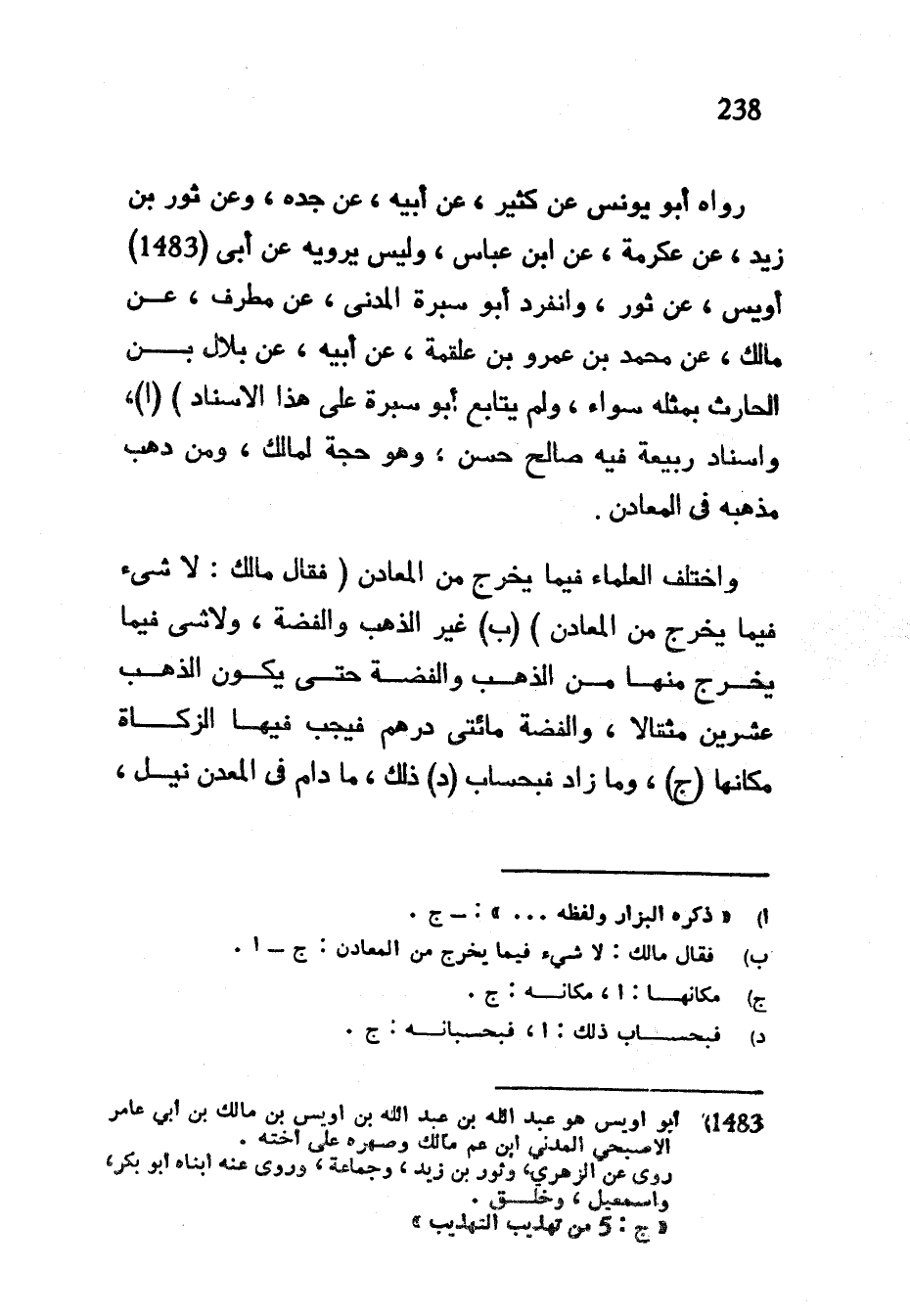 رَوَاهُ أَبُو يُونُسَ عَنْ كَثِيرٍ عَنْ أَبِيهِ عَنْ جَدِّهِ وَعَنْ ثَوْرِ بْنِ زَيْدٍ عَنْ عِكْرِمَةَ عَنِ ابْنِ عَبَّاسٍ وَلَيْسَ يَرْوِيهِ عَنْ أَبِي أُوَيْسٍ عَنْ ثَوْرٍ وَانْفَرَدَ أَبُو سَبْرَةَ الْمَدَنِيُّ عَنْ مُطَرِّفٍ عَنْ مَالِكٍ عَنْ مُحَمَّدِ بْنِ عَمْرِو بْنِ عَلْقَمَةَ عَنْ أَبِيهِ عَنْ بِلَالِ بْنِ الْحَارِثِ بِمِثْلِهِ سَوَاءً وَلَمْ يُتَابَعْ أَبُو سَبْرَةَ عَلَى هَذَا الْإِسْنَادِ) وَإِسْنَادُ رَبِيعَةَ فِيهِ صَالِحٌ حَسَنٌ وَهُوَ حُجَّةٌ لِمَالِكٍ وَمَنْ ذَهَبَ مَذْهَبَهُ فِي الْمَعَادِنِ وَاخْتَلَفَ الْعُلَمَاءُ فِيمَا يُخْرَجُ مِنَ الْمَعَادِنِ (فَقَالَ مَالِكٌ لَا شَيْءَ فيما يخرج من المعادن) (ب) غَيْرُ الذَّهَبِ وَالْفِضَّةِ وَلَا شَيْءَ فِيمَا يَخْرُجُ مِنْهَا مِنَ الذَّهَبِ وَالْفِضَّةِ حَتَّى يَكُونَ الذَّهَبُ عِشْرِينَ مِثْقَالَا وَالْفِضَّةُ مِائَتَيْ دِرْهَمٍ فَيَجِبُ فِيهَا الزَّكَاةُ مَكَانَهَا وَمَا زَادَ فَبِحِسَابِ ذَلِكَ مَا دَامَ فِي الْمَعْدِنِ نَيْلٌ