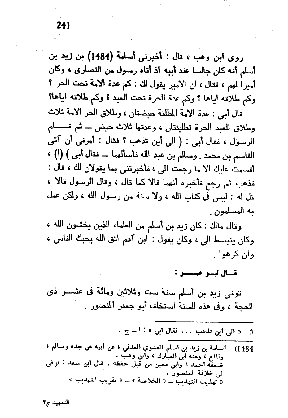 رَوَى ابْنُ وَهَبٍ قَالَ أَخْبَرَنِي أُسَامَةُ بْنُ زَيْدِ بْنِ أَسْلَمَ أَنَّهُ كَانَ جَالِسًا عِنْدَ أَبِيهِ إِذْ أَتَاهُ رَسُولٌ مِنَ النَّصَارَى وَكَانَ أَمِيرًا لَهُمْ فَقَالَ إِنَّ الْأَمِيرَ يَقُولُ لَكَ كَمْ عِدَّةُ الْأَمَةِ تَحْتَ الْحُرِّ وَكَمْ طَلَاقُهُ إِيَّاهَا وَكَمْ عِدَّةُ الْحُرَّةِ تَحْتَ الْعَبْدِ وَكَمْ طَلَاقُهُ إِيَّاهَا قَالَ أَبِي عِدَّةُ الْأَمَةِ الْمُطَلَّقَةِ حَيْضَتَانِ وَطَلَاقُ الْحُرِّ الْأَمَةَ ثَلَاثٌ وَطَلَاقُ الْعَبْدِ الْحُرَّةَ تَطْلِيقَتَانِ وَعِدَّتُهَا ثَلَاثُ حِيَضٍ ثُمَّ قَامَ الرَّسُولُ فَقَالَ أَبِي (إِلَى أَيْنَ تَذْهَبُ فَقَالَ أَمَرَنِي أَنْ آتِيَ الْقَاسِمَ بْنَ مُحَمَّدٍ وَسَالِمَ بْنَ عَبْدِ اللَّهِ فأسألهما فقال أبي) (أ) أَقْسَمْتُ عَلَيْكَ إِلَّا مَا رَجَعْتَ إِلَيَّ فَأَخْبَرْتَنِي بِمَا يَقُولَانِ لَكَ قَالَ فَذَهَبَ ثُمَّ رَجَعَ فَأَخْبَرَهُ أَنَّهُمَا قَالَا كَمَا قَالَ وَقَالَ الرَّسُولُ قَالَا قُلْ لَهُ لَيْسَ فِي كِتَابِ اللَّهِ وَلَا سُنَّةٍ مِنْ رَسُولِ اللَّهِ وَلَكِنْ عَمِلَ بِهِ الْمُسْلِمُونَ وَقَالَ مَالِكٌ كَانَ زَيْدُ بْنُ أَسْلَمَ مِنَ الْعُلَمَاءِ الَّذِينَ يَخْشَوْنَ اللَّهَ وَكَانَ يَنْبَسِطُ إِلَيَّ وَكَانَ يَقُولُ ابْنُ آدَمَ اتَّقِ اللَّهَ يُحِبَّكَ النَّاسُ وَإِنْ كَرِهُوا قَالَ أَبُو عُمَرَ تُوُفِّيَ زَيْدُ بْنُ أَسْلَمَ سَنَةَ سِتٍّ وَثَلَاثِينَ وَمِائَةٍ فِي عَشْرِ ذِي الْحِجَّةِ وَفِي هَذِهِ السَّنَةِ اسْتُخْلِفَ أَبُو جَعْفَرٍ الْمَنْصُورُ