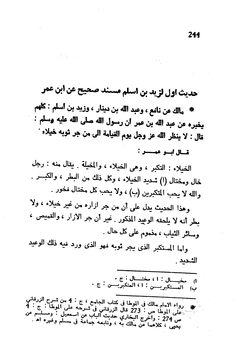 حَدِيثٌ أَوَّلُ لِزَيْدِ بْنِ أَسْلَمَ مُسْنَدٌ صَحِيحٌ عَنِ ابْنِ عُمَرَ مَالِكٌ عَنْ نَافِعٍ وَعَبْدِ اللَّهِ بْنِ دِينَارٍ وَزَيْدِ بْنِ أَسْلَمَ كُلُّهُمْ يُخْبِرُهُ عَنْ عَبْدِ اللَّهِ بْنِ عُمَرَ أَنَّ رَسُولَ اللَّهِ صَلَّى اللَّهُ عَلَيْهِ وَسَلَّمَ قَالَ لَا يَنْظُرُ اللَّهُ عَزَّ وَجَلَّ يَوْمَ الْقِيَامَةِ إِلَى مَنْ جَرَّ ثَوْبَهُ خُيَلَاءَ قَالَ أَبُو عُمَرَ الْخُيَلَاءُ التَّكَبُّرُ وَهِيَ الْخُيَلَاءُ وَالْمَخْيَلَةُ يُقَالُ مِنْهُ رَجُلٌ خَالٌ وَمُخْتَالٌ شَدِيدُ الْخُيَلَاءِ وَكُلُّ ذَلِكَ مِنَ الْبَطَرِ وَالْكِبْرِ وَاللَّهُ لَا يُحِبُّ الْمُتَكَبِّرِينَ وَلَا يُحِبُّ كُلَّ مُخْتَالٍ فَخُورٍ وَهَذَا الْحَدِيثُ يَدُلُّ عَلَى أَنَّ مَنْ جَرَّ إِزَارَهُ مِنْ غَيْرِ خُيَلَاءَ وَلَا بَطَرٍ أَنَّهُ لَا يَلْحَقُهُ الْوَعِيدُ الْمَذْكُورُ غَيْرَ أَنَّ جَرَّ الْإِزَارِ وَالْقَمِيصِ وَسَائِرِ الثِّيَابِ مَذْمُومٌ عَلَى كُلِّ حَالٍ وَأَمَّا الْمُسْتَكْبِرُ الَّذِي يَجُرُّ ثَوْبَهُ فَهُوَ الَّذِي وَرَدَ فِيهِ ذَلِكَ الْوَعِيدُ الشَّدِيدُ