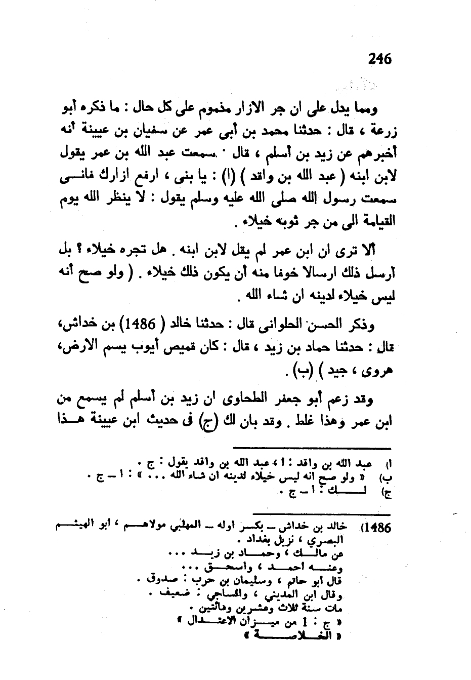 وَمِمَّا يَدُلُّ عَلَى أَنَّ جَرَّ الْإِزَارِ مَذْمُومٌ عَلَى كُلِّ حَالٍ مَا ذَكَرَهُ أَبُو زُرْعَةَ قَالَ حَدَّثَنَا مُحَمَّدُ بْنُ أَبِي عُمَرَ عَنْ سُفْيَانَ بْنِ عُيَيْنَةَ أَنَّهُ أَخْبَرَهُمْ عَنْ زَيْدِ بْنِ أَسْلَمَ قَالَ سَمِعْتُ عَبْدَ اللَّهِ بْنَ عُمَرَ يَقُولُ لِابْنِ ابْنِهِ (عَبْدِ اللَّهِ بْنِ واقد) (أ) يَا بُنَيَّ ارْفَعْ إِزَارَكَ فَإِنِّي سَمِعْتُ رَسُولَ اللَّهِ صَلَّى اللَّهُ عَلَيْهِ وَسَلَّمَ يَقُولُ لَا يَنْظُرُ اللَّهُ يَوْمَ الْقِيَامَةِ إِلَى مَنْ جَرَّ ثَوْبَهُ خُيَلَاءَ أَلَّا تَرَى أَنَّ ابْنَ عُمَرَ لَمْ يَقُلْ لِابْنِ ابْنِهِ هَلْ تَجُرُّهُ خُيَلَاءَ بَلْ أَرْسَلَ ذَلِكَ إِرْسَالًا خَوْفًا مِنْهُ أَنْ يَكُونَ ذَلِكَ خُيَلَاءَ (وَلَوْ صَحَّ أَنَّهُ لَيْسَ خُيَلَاءَ لِدِينِهِ إِنْ شَاءَ اللَّهُ وَذَكَرَ الْحَسَنُ الْحُلْوَانِيُّ قَالَ حَدَّثَنَا خَالِدُ (1486) بْنُ خِدَاشٍ قَالَ حَدَّثَنَا حَمَّادُ بْنُ زَيْدٍ قَالَ كَانَ قَمِيصُ أَيُّوبَ يَسِمُ الْأَرْضَ هَرَوِيٌّ جَيِّدٌ) وَقَدْ زَعَمَ أَبُو جَعْفَرٍ الطَّحَاوِيُّ أَنَّ زَيْدَ بْنَ أَسْلَمَ لَمْ يَسْمَعْ مِنَ ابْنِ عُمَرَ وَهَذَا غَلَطٌ وَقَدْ بَانَ لَكَ فِي حَدِيثِ ابْنِ عُيَيْنَةَ هذا