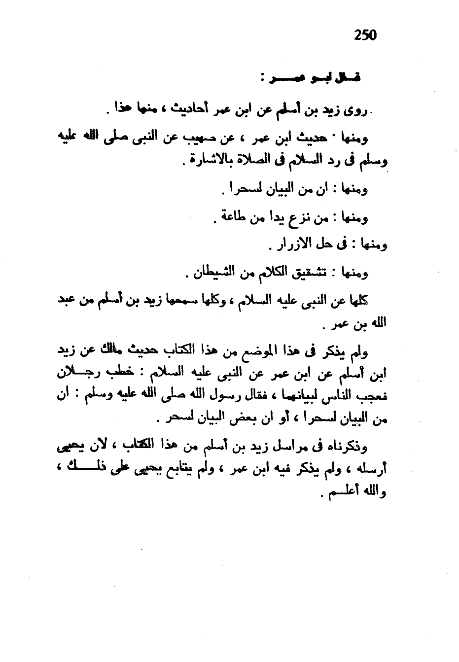 قَالَ أَبُو عُمَرَ رَوَى زَيْدُ بْنُ أَسْلَمَ عَنِ ابْنِ عُمَرَ أَحَادِيثَ مِنْهَا هَذَا وَمِنْهَا حَدِيثُ ابْنُ عُمَرَ عَنْ صُهَيْبٍ عَنِ النَّبِيِّ صَلَّى اللَّهُ عَلَيْهِ وَسَلَّمَ فِي رَدِّ السَّلَامِ فِي الصَّلَاةِ بِالْإِشَارَةِ وَمِنْهَا إِنَّ مِنَ الْبَيَانِ لَسِحْرًا وَمِنْهَا مَنْ نَزَعَ يَدًا مِنْ طَاعَةٍ وَمِنْهَا فِي حَلِّ الْأَزْرَارِ وَمِنْهَا تَشْقِيقُ الْكَلَامِ مِنَ الشَّيْطَانِ كُلُّهَا عَنِ النَّبِيِّ عَلَيْهِ السَّلَامُ وَكُلُّهَا سَمِعَهَا زَيْدُ بْنُ أَسْلَمَ مِنْ عَبْدِ اللَّهِ بْنِ عُمَرَ وَلَمْ يُذْكَرْ فِي هَذَا الْمَوْضِعِ مِنْ هَذَا الْكِتَابِ حَدِيثُ مَالِكٍ عَنْ زيد ابن أَسْلَمَ عَنِ ابْنِ عُمَرَ عَنِ النَّبِيِّ عَلَيْهِ السَّلَامُ خَطَبَ رَجُلَانِ فَعَجِبَ النَّاسُ لِبَيَانِهِمَا فَقَالَ رَسُولُ اللَّهِ صَلَّى اللَّهُ عَلَيْهِ وَسَلَّمَ إِنَّ مِنَ الْبَيَانِ لَسِحْرًا أَوْ إِنَّ بَعْضَ الْبَيَانِ لسحر وذكرناه في مراسل زيد ابن أَسْلَمَ مِنْ هَذَا الْكِتَابِ لِأَنَّ يَحْيَى أَرْسَلَهُ وَلَمْ يَذْكُرْ فِيهِ ابْنَ عُمَرَ وَلَمْ يُتَابَعْ يَحْيَى عَلَى ذَلِكَ وَاللَّهُ أَعْلَمُ