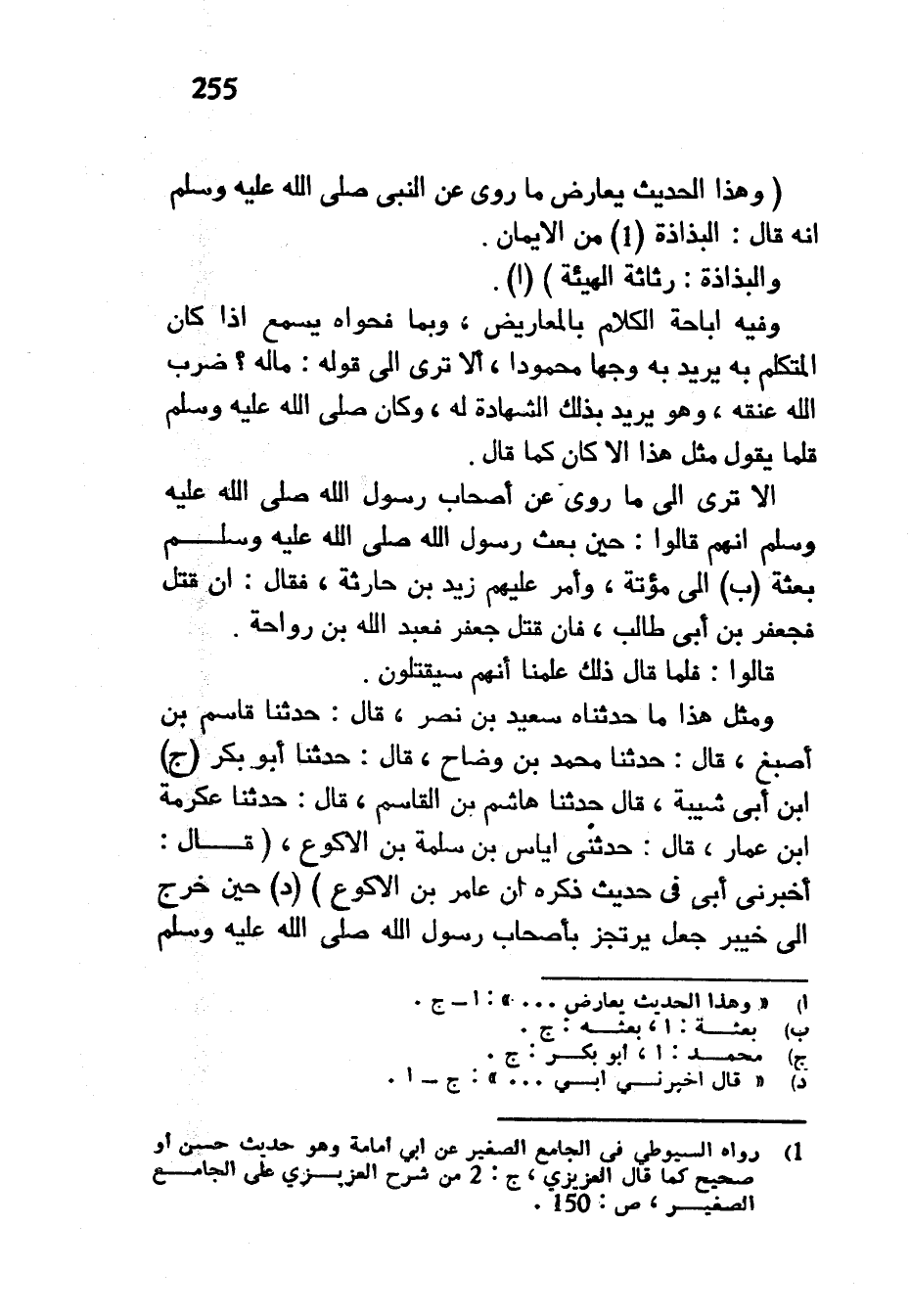 (وَهَذَا الْحَدِيثُ يُعَارِضُ مَا رُوِيَ عَنِ النَّبِيِّ صَلَّى اللَّهُ عَلَيْهِ وَسَلَّمَ أَنَّهُ قَالَ الْبَذَاذَةُ مِنَ الْإِيمَانِ وَالْبَذَاذَةُ رَثَاثَةُ الْهَيْئَةِ) وَفِيهِ إِبَاحَةُ الْكَلَامِ بِالْمَعَارِيضِ وَبِمَا فَحْوَاهُ يُسْمَعُ إِذَا كَانَ الْمُتَكَلِّمُ بِهِ يُرِيدُ بِهِ وَجْهًا مَحْمُودًا أَلَا ترى إلى قوله ماله ضَرَبَ اللَّهُ عُنُقَهُ وَهُوَ يُرِيدُ بِذَلِكَ الشَّهَادَةَ لَهُ وَكَانَ صَلَّى اللَّهُ عَلَيْهِ وَسَلَّمَ قَلَّمَا يَقُولُ مِثْلَ هَذَا إِلَّا كَانَ كَمَا قَالَ أَلَا تَرَى إِلَى مَا رُوِيَ عَنْ أَصْحَابِ رَسُولِ اللَّهِ صَلَّى اللَّهُ عَلَيْهِ وَسَلَّمَ أَنَّهُمْ قَالُوا حِينَ بَعَثَ رَسُولُ اللَّهِ صَلَّى اللَّهُ عَلَيْهِ وَسَلَّمَ بِعْثَةً إِلَى مُؤْتَةَ وَأَمَّرَ عَلَيْهِمْ زَيْدَ بْنَ حَارِثَةَ فَقَالَ إِنْ قُتِلَ فَجَعْفَرُ بْنُ أَبِي طَالِبٍ فَإِنْ قُتِلَ جَعْفَرٌ فَعَبْدُ اللَّهِ بْنُ رَوَاحَةَ قَالُوا فَلَمَّا قَالَ ذَلِكَ عَلِمْنَا أَنَّهُمْ سَيُقْتَلُونَ وَمِثْلُ هَذَا مَا حَدَّثَنَاهُ سَعِيدُ بْنُ نَصْرٍ قَالَ حَدَّثَنَا قَاسِمُ بْنُ أَصْبَغَ قَالَ حَدَّثَنَا مُحَمَّدُ بْنُ وَضَّاحٍ قَالَ حدثنا أبو بكر ابن أَبِي شَيْبَةَ قَالَ حَدَّثَنَا هَاشِمُ بْنُ الْقَاسِمِ قَالَ حَدَّثَنَا عكرمة ابن عَمَّارٍ قَالَ حَدَّثَنِي إِيَاسُ بْنُ سَلَمَةَ بْنِ الْأَكْوَعِ (قَالَ أَخْبَرَنِي أَبِي فِي حَدِيثٍ ذَكَرَهُ ان عامر بن الأكوع) (د) حِينَ خَرَجَ إِلَى خَيْبَرَ جَعَلَ يَرْتَجِزُ بِأَصْحَابِ رَسُولِ اللَّهِ صَلَّى اللَّهُ عَلَيْهِ وَسَلَّمَ
