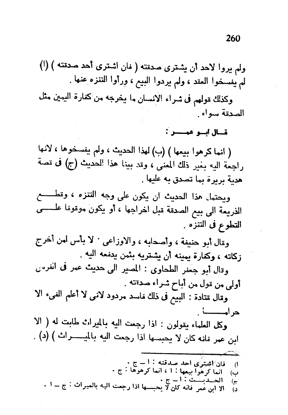وَلَمْ يَرَوْا لِأَحَدٍ أَنْ يَشْتَرِيَ صَدَقَتَهُ (فَإِنِ إشترى أحد صدقته) (أ) لَمْ يَفْسَخُوا الْعَقْدَ وَلَمْ يَرُدُّوا الْبَيْعَ وَرَأَوُا التَّنَزُّهَ عَنْهَا وَكَذَلِكَ قَوْلُهُمْ فِي شِرَاءِ الْإِنْسَانِ مَا يُخْرِجُهُ مِنْ كَفَّارَةِ الْيَمِينِ مِثْلَ الصَّدَقَةِ سَوَاءً قَالَ أَبُو عُمَرَ (إِنَّمَا كَرِهُوا بَيْعَهَا) (ب) لِهَذَا الْحَدِيثِ وَلَمْ يَفْسَخُوهَا لِأَنَّهَا رَاجِعَةٌ إِلَيْهِ بِغَيْرِ ذَلِكَ الْمَعْنَى وَقَدْ بَيَّنَّا هَذَا الْحَدِيثَ فِي قِصَّةِ هَدِيَّةِ بَرِيرَةَ بِمَا تُصَدِّقَ بِهِ عَلَيْهَا وَيَحْتَمِلُ هَذَا الْحَدِيثُ أَنْ يَكُونَ عَلَى وَجْهِ التَّنَزُّهِ وَقَطْعِ الذَّرِيعَةِ إِلَى بَيْعِ الصَّدَقَةِ قَبْلَ إِخْرَاجِهَا أَوْ يَكُونُ مَوْقُوفًا عَلَى التَّطَوُّعِ فِي التَّنَزُّهِ وَقَالَ أَبُو حَنِيفَةَ وَأَصْحَابُهُ وَالْأَوْزَاعِيُّ لَا بَأْسَ لِمَنْ أَخْرَجَ زَكَاتَهُ وَكَفَّارَةَ يَمِينِهِ أَنْ يَشْتَرِيَهُ بِثَمَنٍ يَدْفَعُهُ إِلَيْهِ وَقَالَ أَبُو جَعْفَرٍ الطَّحَاوِيُّ الْمَصِيرُ إِلَى حَدِيثِ عُمَرَ فِي الْفَرَسِ أَوْلَى مِنْ قَوْلِ مَنْ أَبَاحَ شِرَاءَ صَدَقَتُهُ وَقَالَ قَتَادَةُ الْبَيْعُ فِي ذَلِكَ فَاسِدٌ مَرْدُودٌ لِأَنِّي لَا أَعْلَمُ الْفَيْءَ إِلَّا حَرَامًا وَكُلُّ الْعُلَمَاءِ يَقُولُونَ إِذَا رَجَعَتْ إِلَيْهِ بِالْمِيرَاثِ طَابَتْ لَهُ (إِلَّا ابْنَ عُمَرَ فَإِنَّهُ كَانَ لا يحبسها إذا رجعت اليه بالميراث) (د)