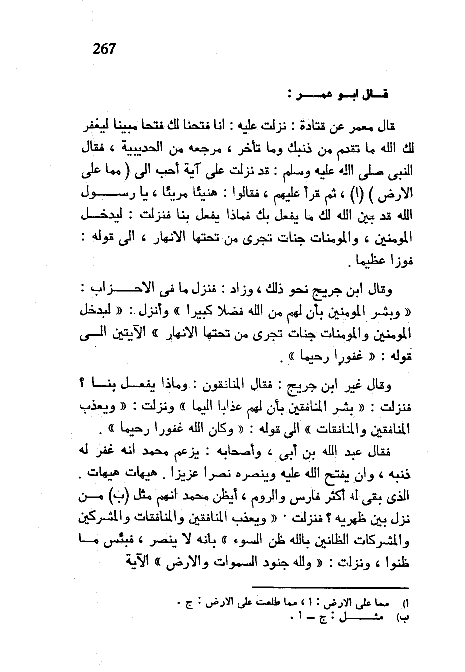 قَالَ أَبُو عُمَرَ قَالَ مَعْمَرٌ عَنْ قَتَادَةَ نَزَلَتْ عَلَيْهِ إِنَّا فَتَحْنَا لَكَ فَتْحًا مُبِينًا لِيَغْفِرَ لَكَ اللَّهُ مَا تَقَدَّمَ مِنْ ذَنْبِكَ وَمَا تَأَخَّرَ مَرْجِعُهُ مِنَ الْحُدَيْبِيَةِ فَقَالَ النَّبِيُّ صَلَّى اللَّهُ عَلَيْهِ وَسَلَّمَ قَدْ نَزَلَتْ عَلَيَّ آية أحب إلى (مما على الأرض) (أ) ثُمَّ قَرَأَ عَلَيْهِمْ فَقَالُوا هَنِيئًا مَرِيئًا يَا رَسُولَ اللَّهِ قَدْ بَيَّنَ اللَّهُ لَكَ مَا يَفْعَلُ بِكَ فَمَاذَا يَفْعَلُ بِنَا فَنَزَلَتْ لِيُدْخِلَ الْمُؤْمِنِينَ وَالْمُؤْمِنَاتِ جَنَّاتٍ تَجْرِي مِنْ تَحْتِهَا الْأَنْهَارُ إِلَى قَوْلِهِ فَوْزًا عَظِيمًا وَقَالَ ابْنُ جُرَيْجٍ نَحْوَ ذَلِكَ وَزَادَ فَنَزَلَ مَا فِي الْأَحْزَابِ وَبَشِّرِ الْمُؤْمِنِينَ بِأَنَّ لَهُمْ مِنَ اللَّهِ فَضْلًا كَبِيرًا وَأَنْزَلَ لِيُدْخِلَ الْمُؤْمِنِينَ وَالْمُؤْمِنَاتِ جَنَّاتٍ تَجْرِي مِنْ تَحْتِهَا الْأَنْهَارُ الْآيَتَيْنِ إِلَى قَوْلِهِ غَفُورًا رَحِيمًا وَقَالَ غَيْرُ ابْنِ جُرَيْجٍ فَقَالَ الْمُنَافِقُونَ وَمَاذَا يَفْعَلُ بِنَا فَنَزَلَتْ بَشِّرِ الْمُنَافِقِينَ بِأَنَّ لَهُمْ عَذَابًا أَلِيمًا وَنَزَلَتْ وَيُعَذِّبَ الْمُنَافِقِينَ وَالْمُنَافِقَاتِ إِلَى قَوْلِهِ وَكَانَ اللَّهُ غَفُورًا رَحِيمًا فَقَالَ عَبْدُ اللَّهِ بْنُ أُبَيٍّ وَأَصْحَابُهُ يَزْعُمُ مُحَمَّدٌ أَنَّهُ غُفِرَ لَهُ ذَنْبُهُ وَأَنْ يَفْتَحَ اللَّهُ عَلَيْهِ وَيَنْصُرَهُ نَصْرًا عَزِيزًا هَيْهَاتَ هَيْهَاتَ الَّذِي بَقِيَ لَهُ أَكْثَرُ فَارِسَ وَالرُّومِ أَيَظُنُّ مُحَمَّدٌ أَنَّهُمْ مِثْلُ مَنْ نَزَلَ بَيْنَ ظَهْرَيْهِ فَنَزَلَتْ وَيُعَذِّبَ الْمُنَافِقِينَ وَالْمُنَافِقَاتِ وَالْمُشْرِكِينَ وَالْمُشْرِكَاتِ الظَّانِّينَ بِاللَّهِ ظَنَّ السَّوْءِ بِأَنَّهُ لَا يَنْصُرُ فَبِئْسَ مَا ظَنُّوا وَنَزَلَتْ وَلِلَّهِ جُنُودُ السَّمَاوَاتِ وَالْأَرْضِ الْآيَةَ