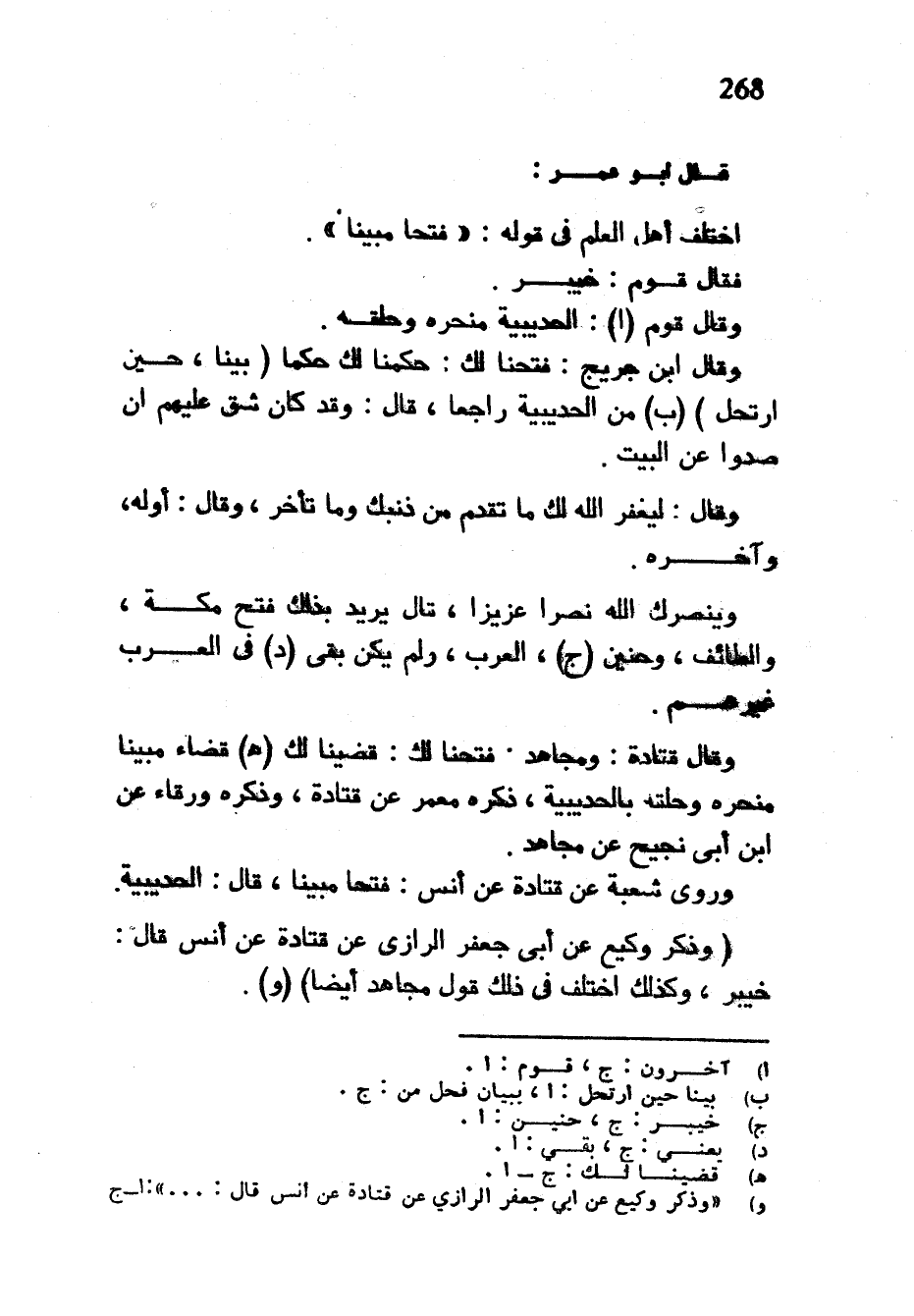 قَالَ أَبُو عُمَرَ اخْتَلَفَ أَهْلُ الْعِلْمِ فِي قوله فتحنا مُبِينًا فَقَالَ قَوْمٌ خَيْبَرُ وَقَالَ قَوْمٌ الْحُدَيْبِيَةُ مَنْحَرَهُ وَحَلْقَهُ وَقَالَ ابْنُ جُرَيْجٍ فَتَحْنَا لَكَ حكمنا لك حكما (بينا حين ارتحل) (ب) مِنَ الْحُدَيْبِيَةِ رَاجِعًا قَالَ وَقَدْ كَانَ شَقَّ عَلَيْهِمْ أَنْ صُدُّوا عَنِ الْبَيْتِ وَقَالَ لِيَغْفِرَ اللَّهُ لَكَ مَا تَقَدَّمَ مِنْ ذَنْبِكَ وَمَا تَأَخَّرَ وَقَالَ أَوَّلُهُ وَآخِرُهُ وَيَنْصُرُكَ اللَّهُ نَصْرًا عَزِيزًا قَالَ يُرِيدُ بِذَلِكَ فَتْحَ مَكَّةَ وَالطَّائِفِ وَحُنَيْنَ الْعَرَبِ وَلَمْ يَكُنْ بَقِيَ فِي الْعَرَبِ غَيْرُهُمْ وَقَالَ قتادة ومجاهد فتحنا لك قضينا لك (هـ) قَضَاءً مُبِينًا مَنْحَرَهُ وَحَلْقَهُ بِالْحُدَيْبِيَةِ ذَكَرَهُ مَعْمَرٌ عَنْ قَتَادَةَ وَذَكَرَهُ وَرْقَاءُ عَنِ ابْنِ أَبِي نَجِيحٍ عَنْ مُجَاهِدٍ وَرَوَى شُعْبَةُ عَنْ قَتَادَةَ عَنْ أَنَسٍ فَتْحًا مُبِينًا قَالَ الْحُدَيْبِيَةَ (وَذَكَرَ وَكِيعٌ عَنْ أَبِي جَعْفَرٍ الرَّازِيِّ عَنْ قَتَادَةَ عَنْ أَنَسٍ قَالَ خَيْبَرُ وَكَذَلِكَ اخْتَلَفَ فِي ذلك قول مجاهد ايضا) (و)