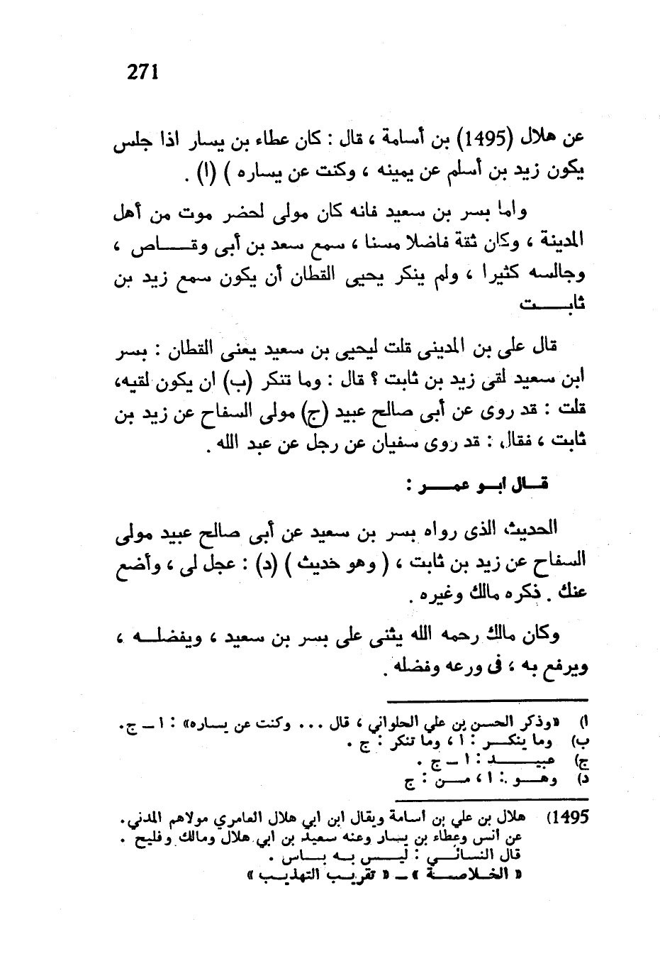 عَنْ هِلَالِ بْنِ أُسَامَةَ قَالَ كَانَ عَطَاءُ بْنُ يَسَارٍ إِذَا جَلَسَ يَكُونُ زَيْدُ بْنُ أَسْلَمَ عَنْ يَمِينِهِ وَكُنْتُ عَنْ يَسَارِهِ) وَأَمَّا بُسْرُ بْنُ سَعِيدٍ فَإِنَّهُ كَانَ مَوْلًى لِحَضْرَ مَوْتَ مِنْ أَهْلِ الْمَدِينَةِ وَكَانَ ثِقَةٌ فَاضِلًا مُسِنًّا سَمِعَ سَعْدَ بْنَ أَبِي وَقَّاصٍ وَجَالَسَهُ كَثِيرًا وَلَمْ يُنْكِرْ يَحْيَى الْقَطَّانُ أَنْ يَكُونَ سَمِعَ زَيْدَ بْنَ ثَابِتٍ قَالَ عَلِيُّ بْنُ الْمَدِينِيِّ قُلْتُ لِيَحْيَى بْنِ سَعِيدٍ يَعْنِي الْقِطَّانَ بسر ابن سَعِيدٍ لَقِيَ زَيْدَ بْنَ ثَابِتٍ قَالَ وَمَا تُنْكِرُ أَنْ يَكُونَ لَقِيَهُ قُلْتُ قَدْ رَوَى عَنْ أَبِي صَالِحٍ عُبَيْدٍ مَوْلَى السَّفَّاحِ عَنْ زَيْدِ بْنِ ثَابِتٍ فَقَالَ قَدْ رَوَى سُفْيَانُ عَنْ رَجُلٍ عَنْ عَبْدِ اللَّهِ قَالَ أَبُو عُمَرَ الْحَدِيثُ الَّذِي رَوَاهُ بُسْرُ بْنُ سَعِيدٍ عَنْ أَبِي صَالِحٍ عُبَيْدٍ مَوْلَى السَّفَّاحِ عَنْ زيد بن ثابت (وهو حديث) (د) عَجِّلْ لِي وَأَضَعْ عَنْكَ ذَكَرَهُ مَالِكٌ وَغَيْرُهُ وَكَانَ مَالِكٌ رَحِمَهُ اللَّهُ يُثْنِي عَلَى بُسْرِ بْنِ سَعِيدٍ وَيُفَضِّلُهُ وَيَرْفَعُ بِهِ فِي وَرَعِهِ وفضله