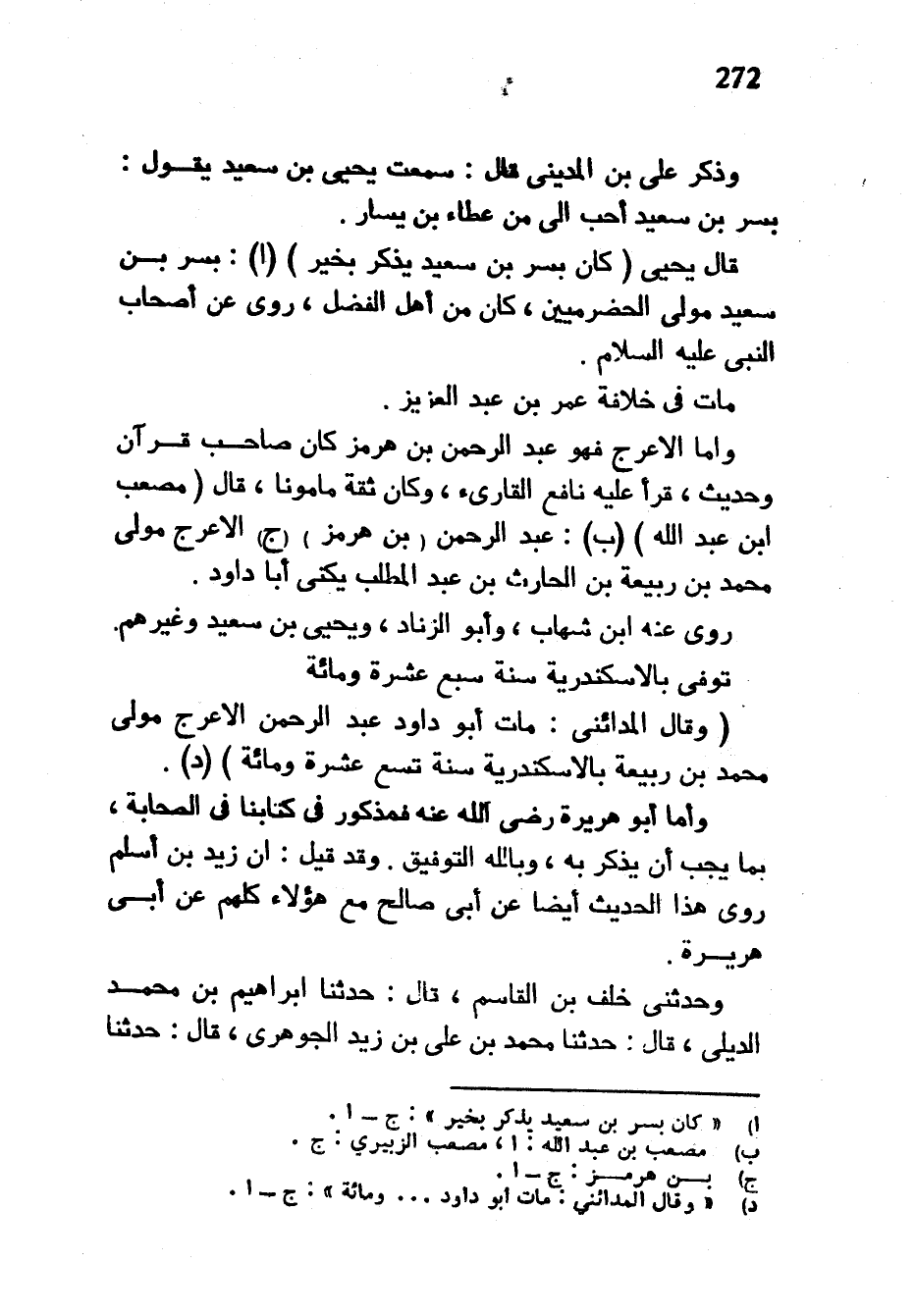 وَذَكَرَ عَلِيُّ بْنُ الْمَدِينِيِّ قَالَ سَمِعْتُ يَحْيَى بْنَ سَعِيدٍ يَقُولُ بُسْرُ بْنُ سَعِيدٍ أَحَبُّ إِلَيَّ مِنْ عَطَاءِ بْنِ يَسَارٍ قَالَ يَحْيَى (كان بسر بن سعيد يذكر بخير) (أ) بُسْرُ بْنُ سَعِيدٍ مَوْلَى الْحَضْرَمِيِّينَ كَانَ مِنْ أَهْلِ الْفَضْلِ رَوَى عَنْ أَصْحَابِ النَّبِيِّ عَلَيْهِ السَّلَامُ مَاتَ فِي خِلَافَةِ عُمَرَ بْنِ عَبْدِ الْعَزِيزِ وَأَمَّا الْأَعْرَجُ فَهُوَ عَبْدُ الرَّحْمَنِ بْنُ هُرْمُزَ كَانَ صَاحِبَ قُرْآنٍ وَحَدِيثٍ قَرَأَ عَلَيْهِ نَافِعٌ الْقَارِئُ وَكَانَ ثِقَةً مَأْمُونًا قَالَ (مُصْعَبُ ابن عبد الله) (ب) عبد الرحمن (بن هرمز) (ج) الْأَعْرَجُ مَوْلَى مُحَمَّدِ بْنِ رَبِيعَةَ بْنِ الْحَارِثِ بْنِ عَبْدِ الْمُطَّلِبِ يُكْنَى أَبَا دَاوُدَ رَوَى عَنْهُ ابْنُ شِهَابٍ وَأَبُو الزِّنَادِ وَيَحْيَى بْنُ سَعِيدٍ وَغَيْرُهُمْ تُوِّفِيَ بِالْإِسْكَنْدَرِيَّةِ سَنَةَ سَبْعَ عَشَرَةَ وَمِائَةٍ (وَقَالَ الْمَدَائِنِيُّ مَاتَ أَبُو دَاوُدَ عَبْدُ الرَّحْمَنِ الْأَعْرَجُ مَوْلَى مُحَمَّدِ بْنِ رَبِيعَةَ بِالْإِسْكَنْدَرِيَّةِ سَنَةَ تسع عشرة ومائة) (د) وَأَمَّا أَبُو هُرَيْرَةَ رَضِيَ اللَّهُ عَنْهُ فَمَذْكُورٌ فِي كِتَابِنَا فِي الصَّحَابَةِ بِمَا يَجِبُ أَنْ يُذَكَرَ بِهِ وَبِاللَّهِ التَّوْفِيقُ وَقَدْ قِيلَ إِنَّ زَيْدَ بْنَ أَسْلَمَ رَوَى هَذَا الْحَدِيثَ أَيْضًا عَنْ أَبِي صَالِحٍ مَعَ هَؤُلَاءِ كُلِّهِمْ عَنْ أَبِي هُرَيْرَةَ وَحَدَّثَنِي خَلَفُ بْنُ الْقَاسِمِ قَالَ حَدَّثَنَا إِبْرَاهِيمُ بْنُ مُحَمَّدٍ الدِّيلِيُّ قَالَ حَدَّثَنَا مُحَمَّدُ بْنُ عَلِيِّ بْنِ زَيْدٍ الْجَوْهَرِيُّ قَالَ حدثنا