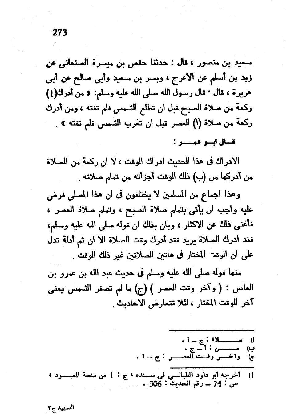 سَعِيدُ بْنُ مَنْصُورٍ قَالَ حَدَّثَنَا حَفْصُ بْنُ مَيْسَرَةَ الصَّنْعَانِيُّ عَنْ زَيْدِ بْنِ أَسْلَمَ عَنِ الْأَعْرَجِ وَبُسْرِ بْنِ سَعِيدٍ وَأَبِي صَالِحٍ عَنْ أَبِي هُرَيْرَةَ قَالَ قَالَ رَسُولُ اللَّهِ صَلَّى اللَّهُ عَلَيْهِ وَسَلَّمَ مَنْ أَدْرَكَ رَكْعَةً من صَلَاةِ الصُّبْحِ قَبْلَ أَنْ تَطْلُعَ الشَّمْسُ فَلَمْ تَفُتْهُ وَمَنْ أَدْرَكَ رَكْعَةً مِنْ صَلَاةِ الْعَصْرِ قَبْلَ أَنْ تَغْرُبَ الشَّمْسُ فَلَمْ تَفُتْهُ قَالَ أَبُو عُمَرَ الْإِدْرَاكُ فِي هَذَا الْحَدِيثِ إِدْرَاكُ الْوَقْتِ لَا أَنَّ رَكْعَةً مِنَ الصَّلَاةِ مَنْ أَدْرَكَهَا مِنْ ذَلِكَ الْوَقْتِ أَجْزَأَتْهُ مِنْ تَمَامِ صِلَاتِهِ وَهَذَا إِجْمَاعٌ مِنَ الْمُسْلِمِينَ لَا يَخْتَلِفُونَ فِي أَنَّ هَذَا الْمُصَلِّيَ فُرِضَ عَلَيْهِ وَاجِبٌ أَنْ يَأْتِيَ بِتَمَامِ صَلَاةِ الصُّبْحِ وَتَمَامِ صَلَاةِ الْعَصْرِ فَأَغْنَى ذَلِكَ عَنِ الْإِكْثَارِ وَبَانَ بِذَلِكَ أَنَّ قَوْلَهُ صَلَّى اللَّهُ عَلَيْهِ وَسَلَّمَ فَقَدْ أَدْرَكَ الصَّلَاةَ يُرِيدُ فَقَدْ أَدْرَكَ وَقْتَ الصَّلَاةِ إِلَّا أَنَّ ثَمَّ أَدِلَّةً تَدُلُّ عَلَى أَنَّ الْوَقْتَ الْمُخْتَارَ فِي هَاتَيْنِ الصَّلَاتَيْنِ غَيْرُ ذَلِكَ الْوَقْتِ مِنْهَا قَوْلُهُ صَلَّى اللَّهُ عَلَيْهِ وَسَلَّمَ فِي حَدِيثِ عَبْدِ اللَّهِ بْنِ عَمْرِو بْنِ الْعَاصِ (وآخر وقت العصر) (ج) مَا لَمْ تَصْفَرَّ الشَّمْسُ يَعْنِي آخِرَ الْوَقْتِ الْمُخْتَارِ لِئَلَّا تَتَعَارَضَ الْأَحَادِيثُ