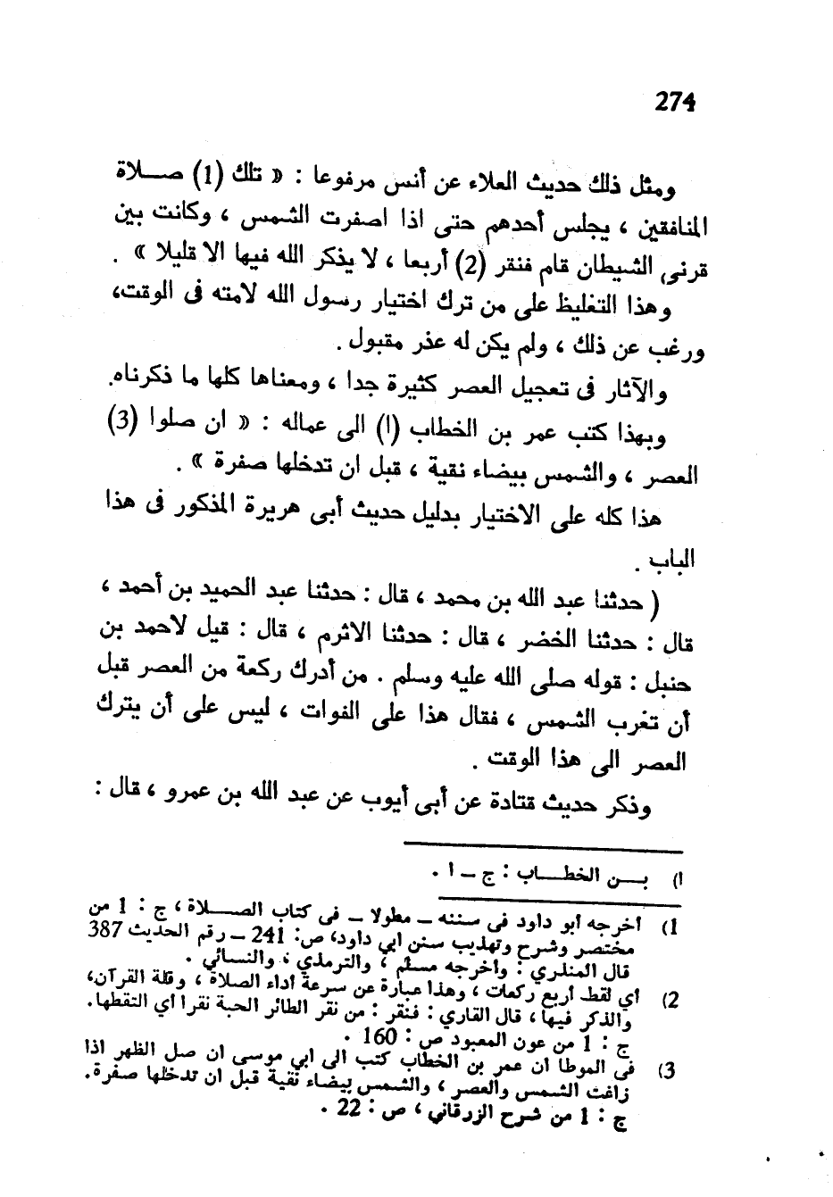 وَمِثْلُ ذَلِكَ حَدِيثُ الْعَلَاءِ عَنْ أَنَسٍ مَرْفُوعًا تِلْكَ صَلَاةُ الْمُنَافِقِينَ يَجْلِسُ أَحَدُهُمْ حَتَّى إِذَا اصْفَرَّتِ الشَّمْسُ وَكَانَتْ بَيْنَ قَرْنَيِ الشَّيْطَانِ قَامَ فَنَقَرَ أَرْبَعًا لَا يَذْكُرُ اللَّهَ فِيهَا إِلَّا قَلِيلًا وَهَذَا التَّغْلِيظُ عَلَى مَنْ تَرَكَ اخْتِيَارَ رَسُولِ اللَّهِ لِأُمَّتِهِ فِي الْوَقْتِ وَرَغِبَ عَنْ ذَلِكَ وَلَمْ يَكُنْ لَهُ عُذْرٌ مَقْبُولٌ وَالْآثَارُ فِي تَعْجِيلِ الْعَصْرِ كَثِيرَةٌ جِدًّا وَمَعْنَاهَا كُلِّهَا مَا ذَكَرْنَاهُ وَبِهَذَا كَتَبَ عُمَرُ بْنُ الْخَطَّابِ إِلَى عُمَّالِهِ أَنْ صَلُّوا الْعَصْرَ وَالشَّمْسَ بَيْضَاءَ نَقِيَّةً قَبْلَ أَنْ تَدْخُلَهَا صُفْرَةٌ هَذَا كُلُّهُ عَلَى الِاخْتِيَارِ بِدَلِيلِ حَدِيثِ أَبِي هُرَيْرَةَ الْمَذْكُورِ فِي هَذَا الْبَابِ (حَدَّثَنَا عَبْدُ اللَّهِ بْنُ مُحَمَّدٍ قَالَ حَدَّثَنَا عَبْدُ الْحَمِيدِ بْنُ أَحْمَدَ قَالَ حَدَّثَنَا الْخَضِرُ قَالَ حَدَّثَنَا الْأَثْرَمُ قَالَ قِيلَ لِأَحْمَدَ بْنِ حَنْبَلٍ قَوْلُهُ صَلَّى اللَّهُ عَلَيْهِ وَسَلَّمَ مَنْ أَدْرَكَ رَكْعَةً مِنَ الْعَصْرِ قَبْلَ أَنْ تَغْرُبَ الشَّمْسُ فَقَالَ هَذَا عَلَى الْفَوَاتِ لَيْسَ عَلَى أَنْ يُتْرَكَ الْعَصْرُ إِلَى هَذَا الْوَقْتِ وَذُكِرَ حَدِيثُ قَتَادَةَ عَنْ أَبِي أَيُّوبَ عَنْ عَبْدِ اللَّهِ بْنِ عَمْرٍو قَالَ