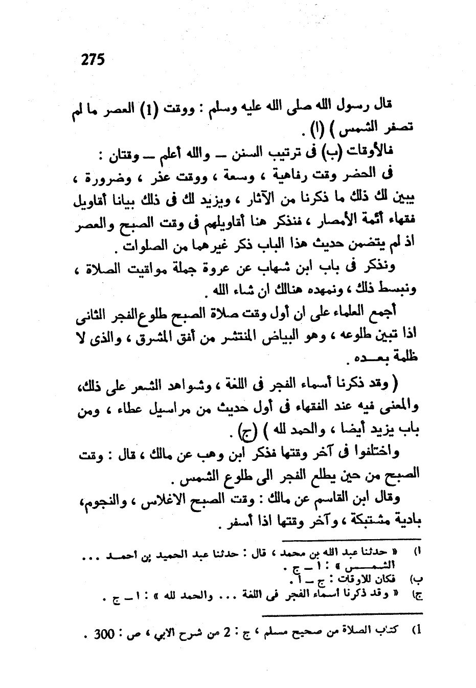 قَالَ رَسُولُ اللَّهِ صَلَّى اللَّهُ عَلَيْهِ وَسَلَّمَ وَوَقْتُ الْعَصْرِ مَا لَمْ تَصْفَرَّ الشَّمْسُ) فَالْأَوْقَاتُ فِي تَرْتِيبِ السُّنَنِ وَاللَّهُ أَعْلَمُ وَقْتَانِ فِي الحضر وقت رفاهية وسعة ووقت عذر ضرورة يُبَيِّنُ لَكَ ذَلِكَ مَا ذَكَرْنَا مِنَ الْآثَارِ وَيَزِيدُ لَكَ فِي ذَلِكَ بَيَانًا أَقَاوِيلُ فُقَهَاءِ أَئِمَّةِ الْأَمْصَارِ فَنَذْكُرُ هُنَا أَقَاوِيلَهُمْ فِي وَقْتِ الصُّبْحِ وَالْعَصْرِ إِذْ لَمْ يَتَضَمَّنْ حَدِيثُ هَذَا الْبَابِ ذِكْرَ غَيْرِهِمَا مِنَ الصَّلَوَاتِ وَنَذْكُرُ فِي بَابِ ابْنِ شِهَابٍ عَنْ عُرْوَةَ جُمْلَةَ مَوَاقِيتِ الصَّلَاةِ وَنُبَسِّطُ ذَلِكَ وَنُمَهِّدُهُ هُنَاكَ إنْ شَاءَ اللَّهُ أَجْمَعَ الْعُلَمَاءُ عَلَى أَنَّ أَوَّلَ وَقْتِ صَلَاةِ الصُّبْحِ طُلُوعُ الْفَجْرِ الثَّانِي إِذَا تَبَيَّنَ طلوعه وهو البياض الْمُنْتَشِرُ مِنْ أُفُقِ الْمَشْرِقِ وَالَّذِي لَا ظُلْمَةَ بَعْدَهُ (وَقَدْ ذَكَرْنَا أَسْمَاءَ الْفَجْرِ فِي اللُّغَةِ وَشَوَاهِدَ الشِّعْرِ عَلَى ذَلِكَ وَالْمَعْنَى فِيهِ عِنْدَ الْفُقَهَاءِ فِي أَوَّلِ حَدِيثٍ مِنْ مَرَاسِيلِ عَطَاءٍ وَمِنْ بَابِ يَزِيدَ أَيْضًا وَالْحَمْدُ لِلَّهِ)) وَاخْتَلَفُوا فِي آخِرِ وَقْتِهَا فَذَكَرَ ابْنُ وَهْبٍ عَنْ مَالِكٍ قَالَ وَقْتُ الصُّبْحِ مِنْ حِينِ يَطْلُعُ الْفَجْرُ إِلَى طُلُوعِ الشَّمْسِ وَقَالَ ابْنُ الْقَاسِمِ عَنْ مَالِكٍ وَقْتُ الصُّبْحِ الْإِغْلَاسُ وَالنُّجُومُ بَادِيَةٌ مُشْتَبِكَةٌ وَآخِرُ وَقْتِهَا إِذَا أَسْفَرَ