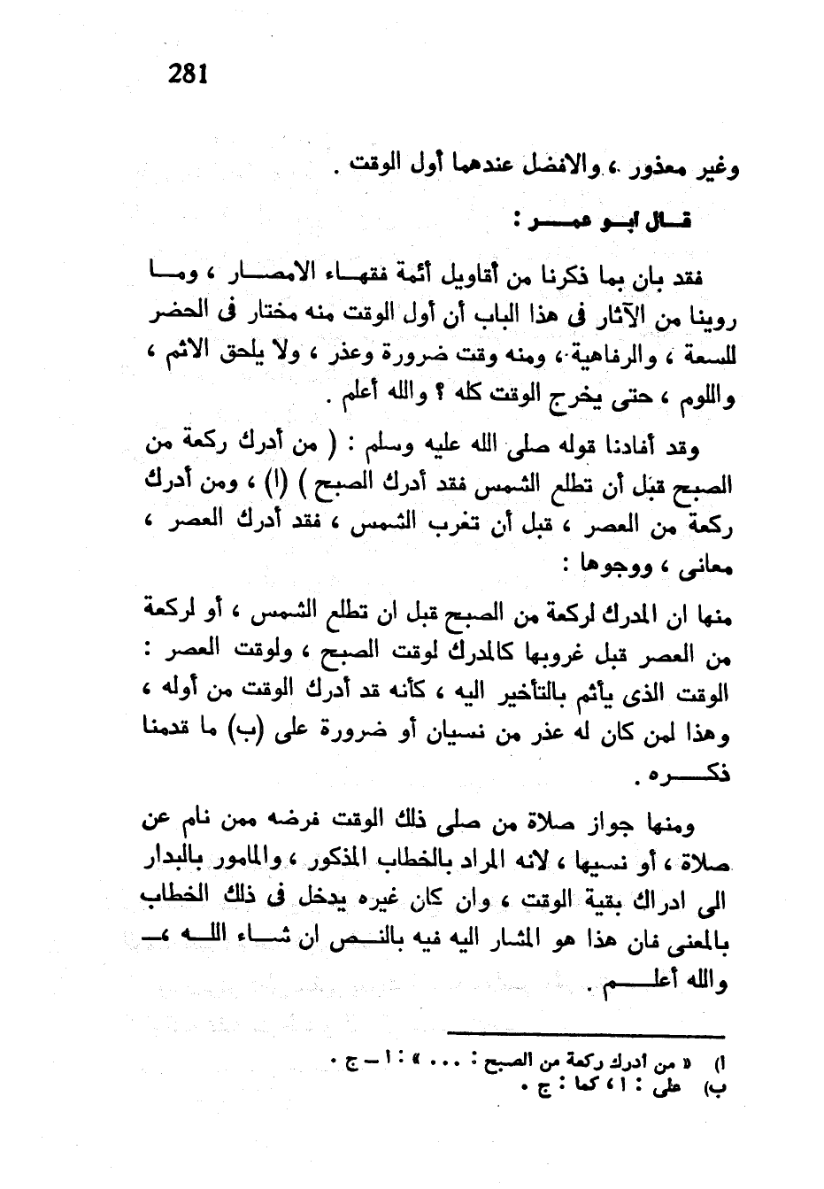 وَغَيْرِ مَعْذُورٍ وَالْأَفْضَلُ عِنْدَهُمَا أَوَّلُ الْوَقْتِ قَالَ أَبُو عُمَرَ فَقَدْ بَانَ بِمَا ذَكَرْنَا مِنْ أَقَاوِيلَ أَئِمَّةِ فُقَهَاءِ الْأَمْصَارِ وَمَا رَوَيْنَا مِنَ الْآثَارِ فِي هَذَا الْبَابِ أَنَّ أَوَّلَ الْوَقْتِ مِنْهُ مُخْتَارٌ فِي الْحَضَرِ لِلسِّعَةِ وَالرَّفَاهِيَةِ وَمِنْهُ وَقْتُ ضَرُورَةٍ وَعُذْرٍ وَلَا يَلْحَقُ الْإِثْمُ وَاللَّوْمُ حَتَّى يَخْرُجَ الْوَقْتُ كُلُّهُ وَاللَّهُ أَعْلَمُ وَقَدْ أَفَادَنَا قَوْلُهُ صَلَّى اللَّهُ عَلَيْهِ وَسَلَّمَ (مَنْ أَدْرَكَ رَكْعَةً مِنَ الصُّبْحِ قَبْلَ أَنْ تَطْلُعَ الشَّمْسُ فقد أدرك الصبح) (أ) وَمَنْ أَدْرَكَ رَكْعَةً مِنَ الْعَصْرِ قَبْلَ أَنْ تَغْرُبَ الشَّمْسُ فَقَدْ أَدْرَكَ الْعَصْرَ مَعَانِيَ وَوُجُوهًا مِنْهَا أَنَّ الْمُدْرِكَ لِرَكْعَةٍ مِنَ الصُّبْحِ قَبْلَ أَنْ تَطْلُعَ الشَّمْسُ أَوْ لِرَكْعَةٍ مِنَ الْعَصْرِ قَبْلَ غُرُوبِهَا كَالْمُدْرِكِ لِوَقْتِ الصُّبْحِ وَلِوَقْتِ الْعَصْرِ الْوَقْتُ الَّذِي يَأْثَمُ بِالتَّأْخِيرِ إِلَيْهِ كَأَنَّهُ قَدْ أَدْرَكَ الْوَقْتَ مِنْ أَوَّلِهِ وَهَذَا لِمَنْ كَانَ لَهُ عُذْرٌ مِنْ نِسْيَانٍ أَوْ ضَرُورَةٍ عَلَى ما قدما ذِكْرَهُ وَمِنْهَا جَوَازُ صَلَاةِ مَنْ صَلَّى ذَلِكَ الْوَقْتَ فَرْضَهُ مِمَّنْ نَامَ عَنْ صَلَاةٍ أَوْ نَسِيَهَا لِأَنَّهُ الْمُرَادُ بِالْخِطَابِ الْمَذْكُورِ وَالْمَأْمُورِ بِالْبِدَارِ إِلَى إِدْرَاكِ بَقِيَّةِ الْوَقْتِ وَإِنْ كَانَ غَيْرُهُ يَدْخُلُ فِي ذَلِكَ الْخِطَابِ بِالْمَعْنَى فَإِنَّ هَذَا هُوَ الْمُشَارُ إِلَيْهِ فِيهِ بِالنَّصِّ إِنْ شَاءَ اللَّهُ وَاللَّهُ أَعْلَمُ