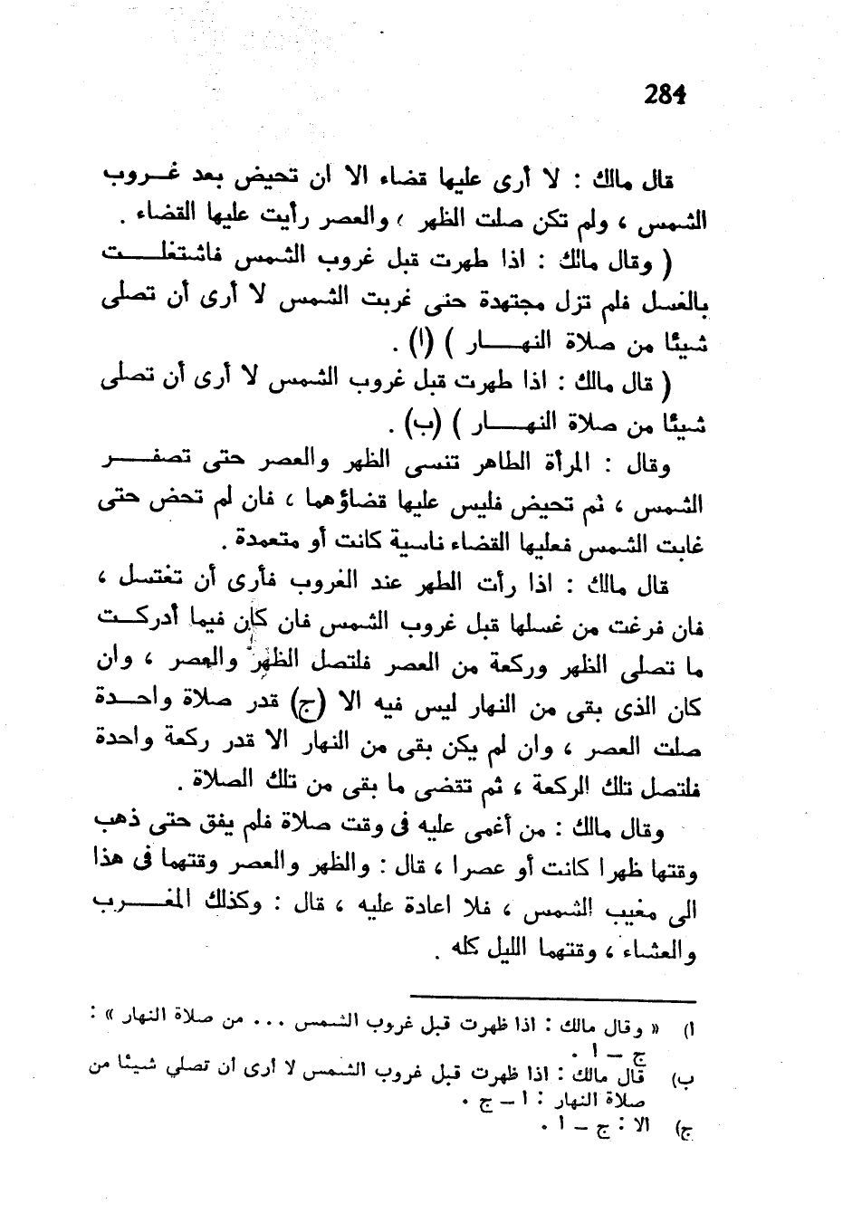 قَالَ مَالِكٌ لَا أَرَى عَلَيْهَا قَضَاءً إِلَّا أَنْ تَحِيضَ بَعْدَ غُرُوبِ الشَّمْسِ وَلَمْ تَكُنْ صَلَّتِ الظُّهْرَ وَالْعَصْرَ رَأَيْتُ عَلَيْهَا الْقَضَاءَ (وَقَالَ مَالِكٌ إِذَا طَهُرَتْ قَبْلَ غُرُوبِ الشَّمْسِ فَاشْتَغَلَتْ بِالْغُسْلِ فَلَمْ تَزَلْ مُجْتَهِدَةً حَتَّى غَرَبَتِ الشَّمْسُ لَا أَرَى أَنْ تُصَلِّيَ شَيْئًا مِنْ صَلَاةِ النهار) (أ) (قَالَ مَالِكٌ إِذَا طَهُرَتْ قَبْلَ غُرُوبِ الشَّمْسِ لَا أَرَى أَنْ تُصَلِّيَ شَيْئًا مِنْ صَلَاةِ النهار) (ب) وَقَالَ الْمَرْأَةُ الطَّاهِرُ تَنْسَى الظُّهْرَ وَالْعَصْرَ حَتَّى تَصْفَرَّ الشَّمْسُ ثُمَّ تَحِيضُ فَلَيْسَ عَلَيْهَا قَضَاؤُهُمَا فَإِنْ لَمْ تَحِضْ حَتَّى غَابَتِ الشَّمْسُ فَعَلَيْهَا الْقَضَاءُ نَاسِيَةً كَانَتْ أَوْ مُتَعَمِّدَةً قَالَ مَالِكٌ إِذَا رَأَتِ الطُّهْرَ عِنْدَ الْغُرُوبِ فَأَرَى أَنْ تَغْتَسِلَ فَإِنْ فَرَغَتْ مِنْ غُسْلِهَا قَبْلَ غُرُوبِ الشَّمْسِ فَإِنْ كَانَ فِيمَا أَدْرَكَتْ مَا تُصَلِّي الظُّهْرَ وَرَكْعَةً مِنَ الْعَصْرِ فَلْتُصَلِّ الظُّهْرَ وَالْعَصْرَ وَإِنْ كَانَ الَّذِي بَقِيَ مِنَ النَّهَارِ لَيْسَ فِيهِ إِلَّا قَدْرُ صَلَاةٍ وَاحِدَةٍ صَلَّتِ الْعَصْرَ وَإِنْ لَمْ يَكُنْ بَقِيَ مِنَ النَّهَارِ إِلَّا قَدْرُ رَكْعَةٍ وَاحِدَةٍ فَلْتُصَلِّ تِلْكَ الرَّكْعَةَ ثُمَّ تَقْضِي مَا بَقِيَ مِنْ تِلْكَ الصَّلَاةِ وَقَالَ مَالِكٌ مَنْ أُغْمِيَ عَلَيْهِ فِي وَقْتِ صَلَاةٍ فَلَمْ يُفِقْ حَتَّى ذَهَبَ وَقْتُهَا ظُهْرًا كَانَتْ أَوْ عَصْرًا قَالَ وَالظُّهْرُ وَالْعَصْرُ وَقْتُهُمَا فِي هَذَا إِلَى مَغِيبِ الشَّمْسِ فَلَا إِعَادَةَ عَلَيْهِ قَالَ وَكَذَلِكَ الْمَغْرِبُ وَالْعِشَاءُ وَقْتُهُمَا اللَّيْلُ كُلُّهُ