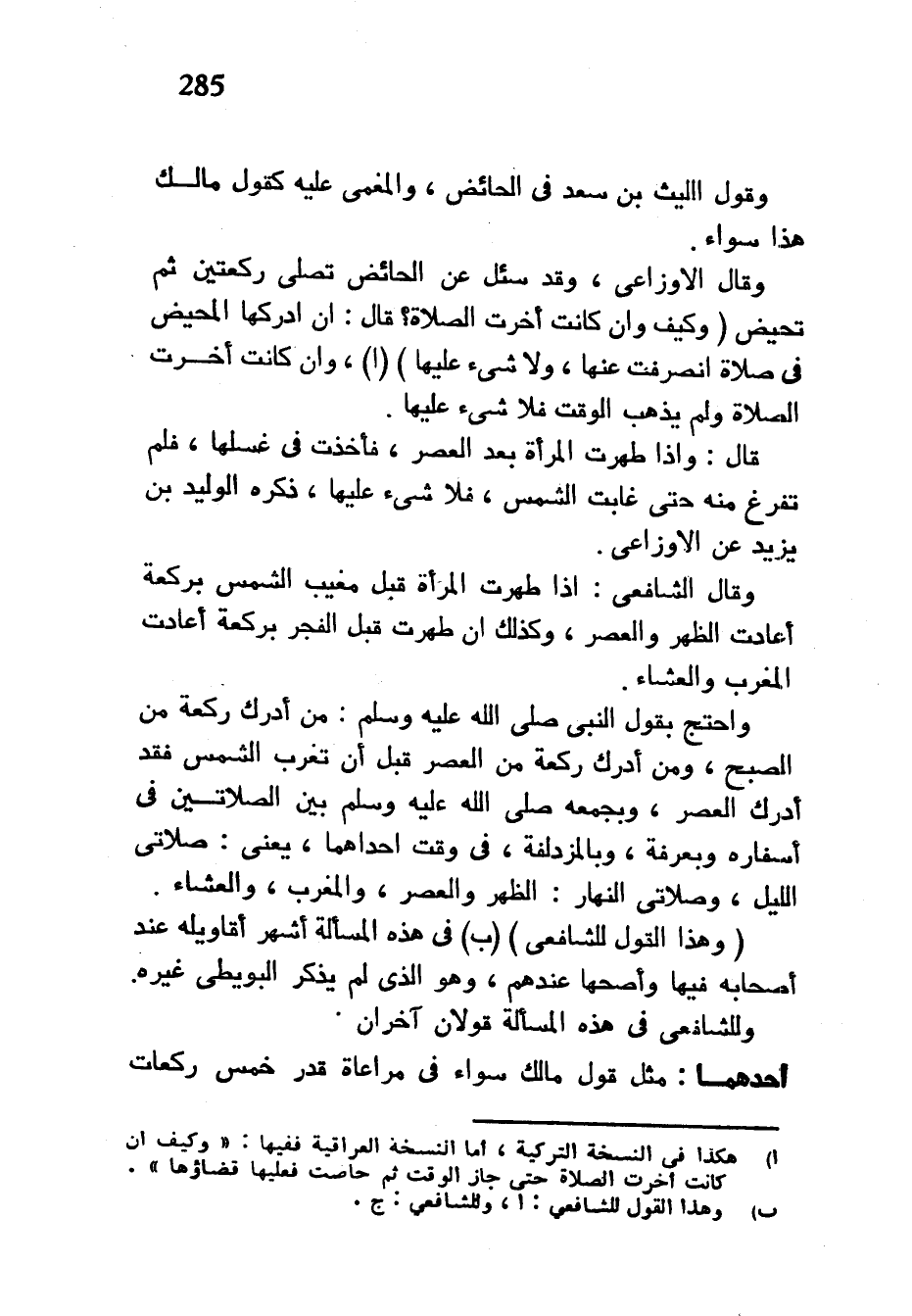 وَقَوْلُ اللَّيْثُ بْنُ سَعْدٍ فِي الْحَائِضِ وَالْمُغْمَى عَلَيْهِ كَقَوْلِ مَالِكٍ هَذَا سَوَاءٌ وَقَالَ الْأَوْزَاعِيُّ وَقَدْ سُئِلَ عَنِ الْحَائِضِ تُصَلِّي رَكْعَتَيْنِ ثُمَّ تَحِيضُ (وَكَيْفَ وَإِنْ كَانَتْ أَخَّرَتِ الصَّلَاةَ قَالَ إِنْ أَدْرَكَهَا الْمَحِيضُ فِي صَلَاةٍ انْصَرَفَتْ عَنْهَا ولا شيء عليها) (أ) وَإِنْ كَانَتْ أَخَّرَتِ الصَّلَاةَ وَلَمْ يَذْهَبِ الْوَقْتُ فَلَا شَيْءَ عَلَيْهَا قَالَ وَإِذَا طَهُرَتِ الْمَرْأَةُ بَعْدَ الْعَصْرِ فَأَخَذَتْ فِي غُسْلِهَا فَلَمْ تَفْرُغْ مِنْهُ حَتَّى غَابَتِ الشَّمْسُ فَلَا شَيْءَ عَلَيْهَا ذَكَرَهُ الْوَلِيدُ بْنُ يَزِيدَ عَنِ الْأَوْزَاعِيِّ وَقَالَ الشَّافِعِيُّ إِذَا طَهُرَتِ الْمَرْأَةُ قَبْلَ مَغِيبِ الشَّمْسِ بِرَكْعَةٍ أَعَادَتِ الظُّهْرَ وَالْعَصْرَ وَكَذَلِكَ إِنْ طَهُرَتْ قَبْلَ الْفَجْرِ بِرَكْعَةٍ أَعَادَتِ الْمَغْرِبَ وَالْعِشَاءَ وَاحْتَجَّ بِقَوْلِ النَّبِيِّ صَلَّى اللَّهُ عَلَيْهِ وَسَلَّمَ مَنْ أَدْرَكَ رَكْعَةً مِنَ الصُّبْحِ وَمَنْ أَدْرَكَ رَكْعَةً مِنَ الْعَصْرِ قَبْلَ أَنْ تَغْرُبَ الشمس فقد أَدْرَكَ الْعَصْرَ وَبِجَمْعِهِ صَلَّى اللَّهُ عَلَيْهِ وَسَلَّمَ بين الصلاتين فِي أَسْفَارِهِ وَبِعَرَفَةَ وَبِالْمُزْدَلِفَةِ فِي وَقْتِ إِحْدَاهُمَا يَعْنِي صَلَاتَيِ اللَّيْلِ وَصَلَاتَيِ النَّهَارِ الظُّهْرَ وَالْعَصْرَ والمغرب والعشاء (وهذا القول للشافعي) (ب) فِي هَذِهِ الْمَسْأَلَةِ أَشْهَرُ أَقَاوِيلِهِ عِنْدَ أَصْحَابِهِ فِيهَا وَأَصَحُّهَا عِنْدَهُمْ وَهُوَ الَّذِي لَمْ يَذْكُرِ الْبُوَيْطِيُّ غَيْرَهُ وَلِلشَّافِعِيِّ فِي هَذِهِ الْمَسْأَلَةِ قَوْلَانِ آخَرَانِ أَحَدُهُمَا مِثْلُ قَوْلِ مَالِكٍ سَوَاءٌ فِي مُرَاعَاةِ قَدْرِ خَمْسِ رَكَعَاتٍ