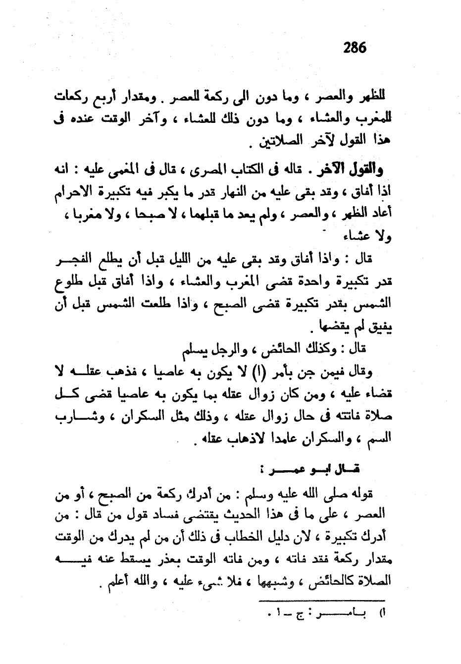 لِلظُّهْرِ وَالْعَصْرِ وَمَا دُونَ إِلَى رَكْعَةٍ لِلْعَصْرِ وَمِقْدَارِ أَرْبَعِ رَكَعَاتٍ لِلْمَغْرِبِ وَالْعِشَاءِ وَمَا دُونَ ذَلِكَ لِلْعِشَاءِ وَآخِرُ الْوَقْتِ عِنْدَهُ فِي هَذَا الْقَوْلِ لِآخِرِ الصَّلَاتَيْنِ وَالْقَوْلُ الْآخَرُ قَالَهُ فِي الْكِتَابِ الْمِصْرِيِّ قَالَ فِي الْمُغْمَى عَلَيْهِ إِنَّهُ إِذَا أَفَاقَ وَقَدْ بَقِيَ عَلَيْهِ مِنَ النَّهَارِ قدر ما يكبر فيه تكبيرة الْإِحْرَامَ أَعَادَ الظُّهْرَ وَالْعَصْرَ وَلَمْ يُعِدْ مَا قَبْلَهُمَا لَا صُبْحًا وَلَا مَغْرِبًا وَلَا عِشَاءً قَالَ وَإِذَا أَفَاقَ وَقَدْ بَقِيَ عَلَيْهِ مِنَ اللَّيْلِ قَبْلَ أَنْ يَطْلُعَ الْفَجْرُ قَدْرُ تَكْبِيرَةٍ وَاحِدَةٍ قَضَى الْمَغْرِبَ وَالْعِشَاءَ وَإِذَا أَفَاقَ قَبْلَ طلوع الشمس بقدر تكبيرة قَضَى الصُّبْحَ وَإِذَا طَلَعَتِ الشَّمْسُ قَبْلَ أَنْ يُفِيقَ لَمْ يَقْضِهَا قَالَ وَكَذَلِكَ الْحَائِضُ وَالرَّجُلُ يُسْلِمُ وَقَالَ فِيمَنْ جُنَّ بِأَمْرٍ لَا يَكُونُ بِهِ عَاصِيًا فَذَهَبَ عَقْلُهُ لَا قَضَاءَ عَلَيْهِ وَمَنْ كَانَ زَوَالُ عَقْلِهِ بِمَا يَكُونُ بِهِ عَاصِيًا قَضَى كُلَّ صَلَاةٍ فَاتَتْهُ فِي حَالِ زوال عقل وذلك مثل السركان وشارب السم والسركان عامدا لاذهان عَقْلِهِ قَالَ أَبُو عُمَرَ قَوْلُهُ صَلَّى اللَّهُ عَلَيْهِ وسلم من أدرك ركعةمن الصُّبْحِ أَوْ مِنَ الْعَصْرِ عَلَى مَا فِي هَذَا الْحَدِيثِ يَقْتَضِي فَسَادَ قَوْلِ مَنْ قَالَ من أدرك تكبيرة لأن دليل الْخَطَّابِ فِي ذَلِكَ أَنَّ مَنْ لَمْ يُدْرِكْ مِنَ الْوَقْتِ مِقْدَارَ رَكْعَةٍ فَقَدْ فَاتَهُ وَمَنْ فَاتَهُ الْوَقْتُ بِعُذْرٍ يَسْقُطُ عَنْهُ فِيهِ الصَّلَاةُ كَالْحَائِضِ وَشِبْهِهَا فَلَا شَيْءَ عَلَيْهِ وَاللَّهُ أَعْلَمُ