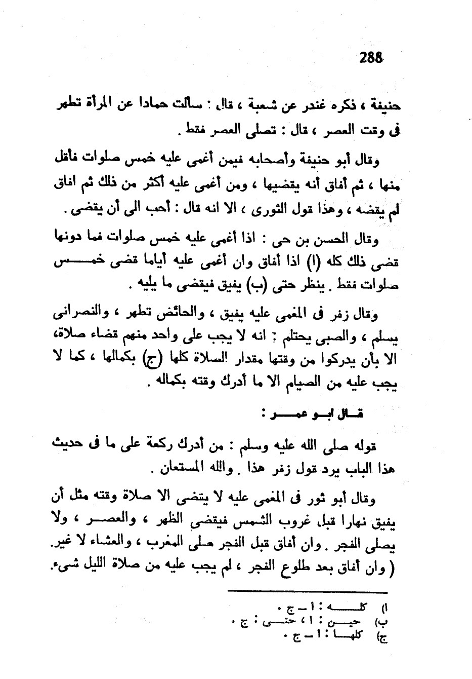 حَنِيفَةَ ذَكَرَهُ غُنْدَرٌ عَنْ شُعْبَةَ قَالَ سَأَلْتُ حَمَّادًا عَنِ الْمَرْأَةِ تَطْهُرُ فِي وَقْتِ الْعَصْرِ قَالَ تُصَلِّي الْعَصْرَ فَقَطْ وَقَالَ أَبُو حَنِيفَةَ وَأَصْحَابُهُ فَيمَنْ أُغْمِيَ عَلَيْهِ خَمْسَ صَلَوَاتٍ فَأَقَلَّ مِنْهَا ثُمَّ أَفَاقَ أَنَّهُ يَقْضِيهَا وَمَنْ أُغْمِيَ عَلَيْهِ أَكْثَرَ مِنْ ذَلِكَ ثُمَّ أَفَاقَ لَمْ يَقْضِهِ وَهَذَا قَوْلُ الثَّوْرِيِّ إِلَّا أَنَّهُ قَالَ أَحَبُّ إِلَيَّ أَنْ يَقْضِيَ وَقَالَ الْحَسَنُ بْنُ حَيٍّ إِذَا أُغْمِيَ عَلَيْهِ خَمْسَ صَلَوَاتٍ فَمَا دُونَهَا قَضَى ذَلِكَ كُلَّهُ إِذَا أَفَاقَ وَإِنْ أُغْمِيَ عَلَيْهِ أَيَّامًا قَضَى خَمْسَ صَلَوَاتٍ فَقَطْ يَنْظُرُ حَتَّى يُفِيقَ فَيَقْضِيَ مَا يَلِيَهُ وَقَالَ زُفَرُ فِي الْمُغْمَى عَلَيْهِ يُفِيقُ وَالْحَائِضِ تَطْهُرُ وَالنَّصْرَانِيِّ يُسْلِمُ وَالصَّبِيِّ يَحْتَلِمُ إِنَّهُ لَا يَجِبُ عَلَى وَاحِدٍ مِنْهُمْ قَضَاءُ صَلَاةٍ إِلَّا بِأَنْ يُدْرِكُوا مِنْ وَقْتِهَا مِقْدَارَ الصَّلَاةِ كُلِّهَا بِكَمَالِهَا كَمَا لَا يَجِبُ عَلَيْهِ مِنَ الصِّيَامِ إِلَّا مَا أَدْرَكَ وَقْتَهُ بِكَمَالِهِ قَالَ أَبُو عُمَرَ قَوْلُهُ صَلَّى اللَّهُ عَلَيْهِ وسلم من أدرك رَكْعَةً عَلَى مَا فِي حَدِيثِ هَذَا الْبَابِ يَرُدُّ قَوْلَ زُفَرَ هَذَا وَاللَّهُ الْمُسْتَعَانُ وَقَالَ أَبُو ثَوْرٍ فِي الْمُغْمَى عَلَيْهِ لَا يَقْضِي إِلَّا صَلَاةَ وَقْتِهِ مِثْلَ أَنْ يُفِيقَ نَهَارًا قَبْلَ غُرُوبِ الشَّمْسِ فَيَقْضِي الظُّهْرَ وَالْعَصْرَ وَلَا يُصَلِّي الْفَجْرَ وَإِنْ أَفَاقَ قَبْلَ الْفَجْرِ صَلَّى المغرب والعشاء لا غير (وأن أفاق بعد لطلوع الْفَجْرِ لَمْ يَجِبْ عَلَيْهِ مِنْ صَلَاةِ اللَّيْلِ شيء