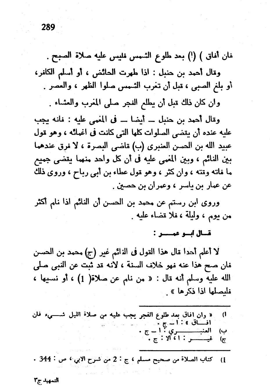 فَإِنْ أَفَاقَ) بَعْدَ طُلُوعِ الشَّمْسِ فَلَيْسَ عَلَيْهِ صَلَاةُ الصُّبْحِ وَقَالَ أَحْمَدُ بْنُ حَنْبَلٍ إِذَا طَهُرَتِ الْحَائِضُ أَوْ أَسْلَمَ الْكَافِرُ أَوْ بَلَغَ الصَّبِيُّ قَبْلَ أَنْ تَغْرُبَ الشَّمْسُ صَلَّوُا الظُّهْرَ وَالْعَصْرَ وَإِنْ كَانَ ذَلِكَ قَبْلَ أَنْ يَطْلُعَ الْفَجْرُ صَلَّى الْمَغْرِبَ وَالْعِشَاءَ وَقَالَ أَحْمَدُ بْنُ حَنْبَلٍ أَيْضًا فِي الْمُغْمَى عَلَيْهِ فَإِنَّهُ يَجِبُ عَلَيْهِ عِنْدَهُ أَنْ يَقْضِيَ الصَّلَوَاتِ كُلَّهَا الَّتِي كَانَتْ فِي إِغْمَائِهِ وَهُوَ قَوْلُ عُبَيْدِ اللَّهِ بن الحسن العنبري قَاضِي الْبَصْرَةِ لَا فَرْقَ عِنْدَهُمَا بَيْنَ النَّائِمِ وَبَيْنَ الْمُغْمَى عَلَيْهِ فِي أَنَّ كُلَّ وَاحِدٍ مِنْهُمَا يَقْضِي جَمِيعَ مَا فَاتَهُ وَقْتُهُ وَإِنْ كَثُرَ وَهُوَ قَوْلُ عَطَاءِ بْنِ أَبِي رَبَاحٍ وَرَوَى ذَلِكَ عَنْ عَمَّارِ بْنِ يَاسِرٍ وَعِمْرَانَ بْنِ حُصَيْنٍ وَرَوَى ابْنُ رُسْتُمَ عَنْ مُحَمَّدِ بْنِ الْحَسَنِ أَنَّ النَّائِمَ إِذَا نَامَ أَكْثَرَ مِنْ يَوْمٍ وَلَيْلَةٍ فَلَا قَضَاءَ عَلَيْهِ قَالَ أَبُو عُمَرَ لَا أَعْلَمُ أَحَدًا قَالَ هَذَا الْقَوْلَ فِي النَّائِمِ غَيْرَ مُحَمَّدِ بْنِ الْحَسَنِ فَإِنْ صَحَّ هَذَا عَنْهُ فَهُوَ خِلَافُ السُّنَّةِ لِأَنَّهُ قَدْ ثَبَتَ عَنِ النَّبِيِّ صَلَّى اللَّهُ عَلَيْهِ وَسَلَّمَ أَنَّهُ قَالَ مَنْ نَامَ عَنْ صَلَاةٍ أَوْ نَسِيَهَا فَلْيُصَلِّهَا إِذَا ذَكَرَهَا