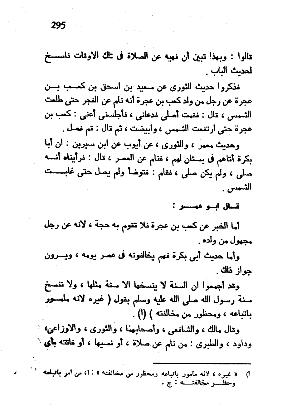 قَالُوا وَبِهَذَا تَبَيَّنَ أَنَّ نَهْيَهُ عَنِ الصَّلَاةِ فِي تِلْكَ الْأَوْقَاتِ نَاسِخٌ لِحَدِيثِ الْبَابِ فَذَكَرُوا حَدِيثَ الثَّوْرِيِّ عَنْ سَعِيدِ بْنِ إِسْحَاقَ بْنِ كَعْبِ بْنِ عُجْرَةَ عَنْ رَجُلٍ مَنْ وَلَدِ كَعْبِ بْنِ عُجْرَةَ أَنَّهُ نَامَ عَنِ الْفَجْرِ حَتَّى طَلَعَتِ الشَّمْسُ قَالَ فَقُمْتُ أَصَلِّي فَدَعَانِي فَأَجْلَسَنِي أَعْنِي كَعْبَ بْنَ عُجْرَةَ حَتَّى ارْتَفَعَتِ الشَّمْسُ وَابْيَضَّتْ ثُمَّ قَالَ قُمْ فَصَلِّ وَحَدِيثُ مَعْمَرٍ وَالثَّوْرِيِّ عَنْ أَيُّوبَ عَنِ ابْنِ سِيرِينَ أَنَّ أَبَا بَكْرَةَ أَتَاهُمْ فِي بُسْتَانٍ لَهُمْ فَنَامَ عَنِ الْعَصْرِ قَالَ فَرَأَيْنَاهُ أَنَّهُ صَلَّى وَلَمْ يَكُنْ صَلَّى فَقَامَ فَتَوَضَّأَ وَلَمْ يُصَلِّ حَتَّى غَابَتِ الشَّمْسُ قَالَ أَبُو عُمَرَ أَمَّا الْخَبَرُ عَنْ كَعْبِ بْنِ عُجْرَةَ فَلَا تَقُومُ بِهِ حُجَّةٌ لِأَنَّهُ عَنْ رَجُلٍ مَجْهُولٍ مِنْ وَلَدِهِ وَأَمَّا حَدِيثُ أَبِي بَكْرَةَ فَهُمْ يُخَالِفُونَهُ فِي عَصْرِ يَوْمِهِ وَيَرَوْنَ جَوَازَ ذَلِكَ وَقَدْ أَجْمَعُوا أَنَّ السُّنَّةَ لَا يَنْسَخُهَا إِلَّا سُنَّةٌ مِثْلُهَا وَلَا تُنْسَخُ سُنَّةُ رَسُولِ اللَّهِ صَلَّى اللَّهُ عَلَيْهِ وَسَلَّمَ بِقَوْلِ (غَيْرِهِ لِأَنَّهُ مَأْمُورٌ باتباعه ومحظور من مخالفته) (أ) وَقَالَ مَالِكٌ وَالشَّافِعِيُّ وَأَصْحَابُهُمَا وَالثَّوْرِيُّ وَالْأَوْزَاعِيُّ وَدَاوُدُ وَالطَّبَرِيُّ مَنْ نَامَ عَنْ صَلَاةٍ أَوْ نَسِيَهَا أو فاتته بأبي