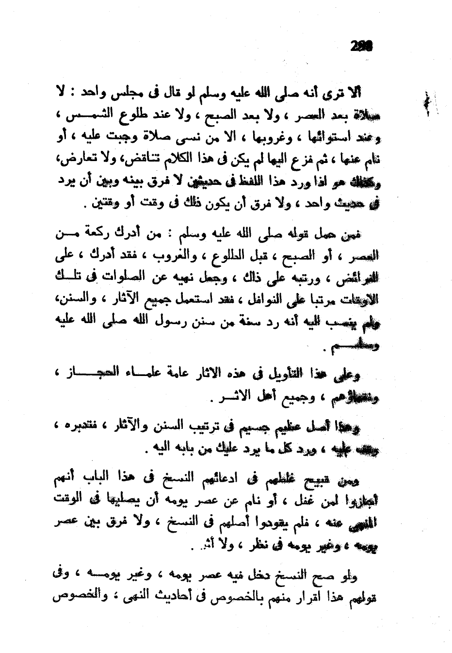 أَلَا تَرَى أَنَّهُ صَلَّى اللَّهُ عَلَيْهِ وَسَلَّمَ لَوْ قَالَ فِي مَجْلِسٍ وَاحِدٍ لَا صَلَاةَ بعدالعصر وَلَا بَعْدَ الصُّبْحِ وَلَا عِنْدَ طُلُوعِ الشَّمْسِ وَعِنْدَ اسْتِوَائِهَا وَغُرُوبِهَا إِلَّا مَنْ نَسِيَ صَلَاةً وَجَبَتْ عَلَيْهِ أَوْ نَامَ عَنْهَا ثُمَّ فَزِعَ إِلَيْهَا لَمْ يَكُنْ فِي هَذَا الْكَلَامِ تَنَاقُضٌ وَلَا تَعَارُضٌ وَكَذَلِكَ هُوَ إِذَا وَرَدَ هَذَا اللَّفْظُ فِي حَدِيثَيْنِ لَا فَرْقَ بَيْنَهُ وَبَيْنَ أَنْ يَرِدَ فِي حَدِيثٍ وَاحِدٍ وَلَا فَرْقَ أَنْ يَكُونَ ذَلِكَ فِي وَقْتٍ أَوْ وَقْتَيْنِ فَمَنْ حَمَلَ قَوْلَهُ صَلَّى اللَّهُ عَلَيْهِ وَسَلَّمَ مَنْ أَدْرَكَ رَكْعَةً مِنَ الْعَصْرِ أَوِ الصُّبْحِ قَبْلَ الطُّلُوعِ وَالْغُرُوبِ فَقَدْ أَدْرَكَ عَلَى الْفَرَائِضِ وَرَتَّبَهُ عَلَى ذَلِكَ وَجَعَلَ نَهْيَهُ عَنِ الصَّلَوَاتِ فِي تِلْكَ الْأَوْقَاتِ مُرَتَّبًا عَلَى النَّوَافِلِ فَقَدِ اسْتَعْمَلَ جَمِيعَ الْآثَارِ وَالسُّنَنِ وَلَمْ يُنْسَبْ إِلَيْهِ أَنَّهُ رَدَّ سُنَّةً مِنْ سُنَنِ رَسُولِ اللَّهِ صَلَّى اللَّهُ عَلَيْهِ وَسَلَّمَ وَعَلَى هَذَا التَّأْوِيلِ في هذه الآثار عامة علماء الحجاز وفقهاؤهم وجميع أَهْلِ الْأَثَرِ وَهَذَا أَصْلٌ عَظِيمٌ جَسِيمٌ فِي تَرْتِيبِ السُّنَنِ وَالْآثَارِ فَتَدَبَّرْهُ وَقِفْ عَلَيْهِ وَرُدَّ كُلَّ مَا يَرِدُ عَلَيْكَ مِنْ بَابِهِ إِلَيْهِ وَمِنْ قَبِيحِ غَلَطِهِمْ فِي ادِّعَائِهِمُ النَّسْخَ فِي هَذَا الْبَابِ أَنَّهُمْ أَجَازُوا لِمَنْ غَفَلَ أَوْ نَامَ عَنْ عَصْرِ يَوْمِهِ أَنْ يُصَلِّيَهَا فِي الْوَقْتِ الْمَنْهِيِّ عَنْهُ فَلَمْ يَقُودُوا أَصْلَهُمْ فِي النَّسْخِ وَلَا فَرْقَ بَيْنَ عَصْرِ يَوْمِهِ وَغَيْرِ يَوْمِهِ فِي نَظَرٍ وَلَا أَثَرٍ وَلَوْ صَحَّ النَّسْخُ دَخَلَ فِيهِ عَصْرُ يَوْمِهِ وَغَيْرِ يَوْمِهِ وَفِي قَوْلِهِمْ هَذَا إِقْرَارٌ مِنْهُمْ بِالْخُصُوصِ فِي أَحَادِيثَ النَّهْيِ وَالْخُصُوصُ
