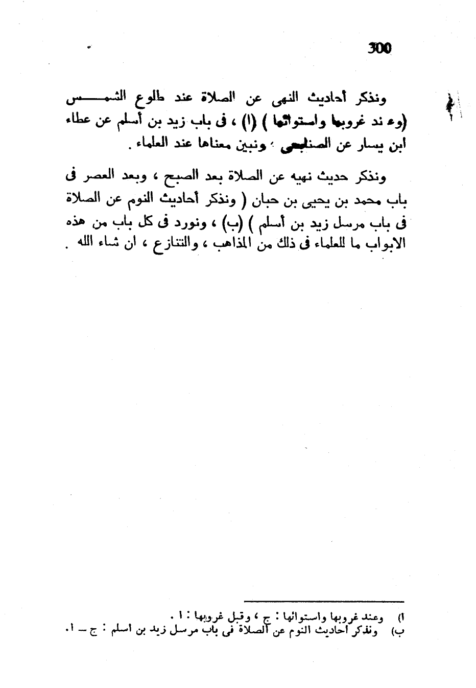وَنَذْكُرُ أَحَادِيثَ النَّهْيِ عَنِ الصَّلَاةِ عِنْدَ طُلُوعِ الشَّمْسِ (وَعِنْدَ غُرُوبِهَا واستوئاها) (أ) فِي بَابِ زَيْدِ بْنِ أَسْلَمَ عَنْ عَطَاءِ ابن يَسَارٍ عَنِ الصُّنَابِحِيِّ وَنُبَيِّنُ مَعْنَاهَا عِنْدَ الْعُلَمَاءِ ونذكر حديث نهيه عن الصلاة بعدالصبح وبعدالعصر فِي بَابِ مُحَمَّدِ بْنِ يَحْيَى بْنِ حِبَّانَ (وَنَذْكُرُ أَحَادِيثَ النَّوْمِ عَنِ الصَّلَاةِ فِي بَابِ مرسل زيد بن أسلم) (ب) وَنُورِدُ فِي كُلِّ بَابٍ مِنْ هَذِهِ الْأَبْوَابِ مَا لِلْعُلَمَاءِ فِي ذَلِكَ مِنَ الْمَذَاهِبِ وَالتَّنَازُعِ إِنْ شَاءَ اللَّهُ