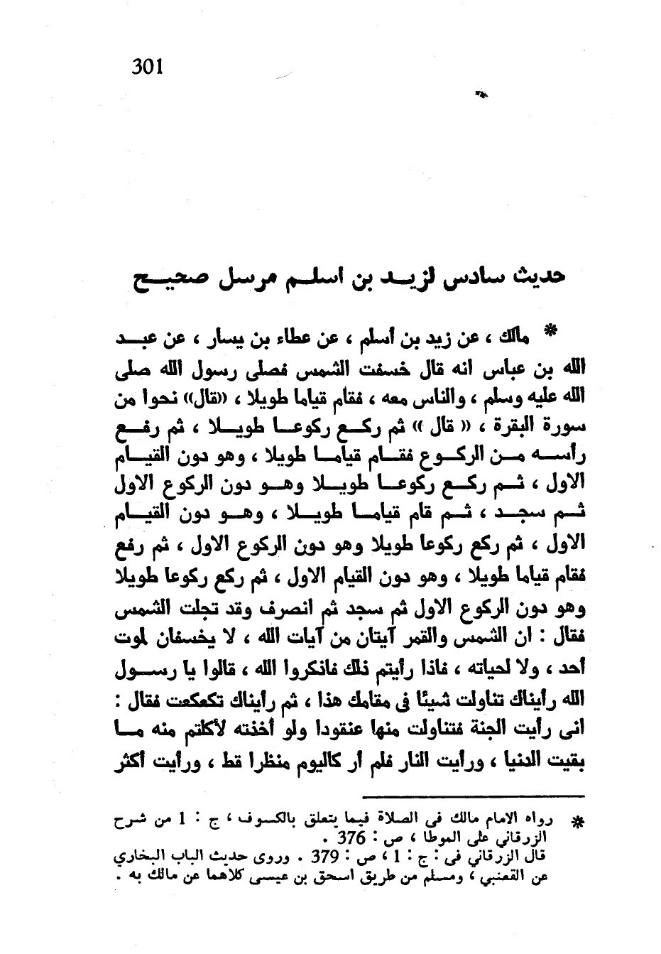 حَدِيثٌ سَادِسٌ لِزَيْدِ بْنِ أَسْلَمَ مُرْسَلٌ صَحِيحٌ مَالِكٌ عَنْ زَيْدِ ابْنِ أَسْلَمَ عَنْ عَطَاءِ بْنِ يَسَارٍ عَنْ عَبْدِ اللَّهِ بْنِ عَبَّاسٍ أَنَّهُ قَالَ خَسَفَتِ الشَّمْسُ فَصَلَّى رَسُولُ اللَّهِ صَلَّى اللَّهُ عَلَيْهِ وَسَلَّمَ وَالنَّاسُ مَعَهُ فَقَامَ قِيَامًا طَوِيلًا قَالَ نَحْوًا مِنْ سُورَةِ الْبَقَرَةِ قَالَ ثُمَّ رَكَعَ رُكُوعًا طَوِيلًا ثُمَّ رَفَعَ رَأْسَهُ مِنَ الرُّكُوعِ فَقَامَ قِيَامًا طَوِيلًا وَهُوَ دُونَ الْقِيَامِ الْأَوَّلِ ثُمَّ رَكَعَ رُكُوعًا طَوِيلًا وَهُوَ دُونَ الرُّكُوعِ الْأَوَّلِ ثُمَّ سَجَدَ ثُمَّ قَامَ قِيَامًا طَوِيلًا وَهُوَ دُونَ الْقِيَامِ الْأَوَّلِ ثُمَّ رَكَعَ رُكُوعًا طَوِيلًا وَهُوَ دُونَ الرُّكُوعِ الْأَوَّلِ ثُمَّ رَفَعَ فَقَامَ قِيَامًا طَوِيلًا وَهُوَ دُونَ الْقِيَامِ الْأَوَّلِ ثُمَّ رَكَعَ رُكُوعًا طَوِيلًا وَهُوَ دُونَ الرُّكُوعِ الْأَوَّلِ ثُمَّ سَجَدَ ثُمَّ انْصَرَفَ وَقَدْ تَجَلَّتِ الشَّمْسُ فَقَالَ إِنَّ الشَّمْسَ وَالْقَمَرَ آيَتَانِ مِنْ آيَاتِ اللَّهِ لَا يَخْسِفَانِ لِمَوْتِ أَحَدٍ وَلَا لِحَيَاتِهِ فَإِذَا رَأَيْتُمْ ذَلِكَ فَاذْكُرُوا اللَّهَ قَالُوا يَا رَسُولَ اللَّهِ رَأَيْنَاكَ تَنَاوَلْتَ شَيْئًا فِي مَقَامِكَ هَذَا ثُمَّ رَأَيْنَاكَ تَكَعْكَعْتَ فَقَالَ إِنِّي رَأَيْتُ الْجَنَّةَ فَتَنَاوَلْتُ مِنْهَا عُنْقُودًا وَلَوْ أَخَذْتُهُ لَأَكَلْتُمْ مِنْهُ مَا بَقِيَتِ الدُّنْيَا وَرَأَيْتُ النَّارَ فَلَمْ أَرَ كَالْيَوْمِ مَنْظَرًا قَطُّ وَرَأَيْتُ أَكْثَرَ