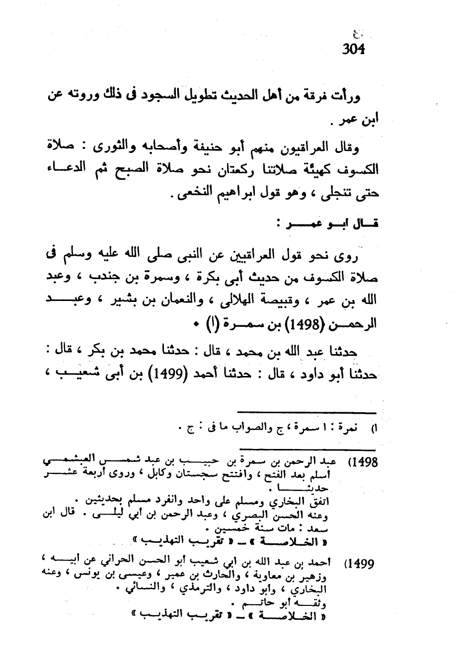 وَرَأَتْ فِرْقَةٌ مِنْ أَهْلِ الْحَدِيثِ تَطْوِيلَ السُّجُودِ فِي ذَلِكَ وَرَوَتْهُ عَنِ ابْنِ عُمَرَ وَقَالَ الْعِرَاقِيُّونَ مِنْهُمْ أَبُو حَنِيفَةَ وَأَصْحَابُهُ وَالثَّوْرِيُّ صَلَاةُ الْكُسُوفِ كَهَيْئَةِ صَلَاتِنَا رَكْعَتَانِ نَحْوُ صَلَاةِ الصُّبْحِ ثُمَّ الدُّعَاءِ حَتَّى تَنْجَلِيَ وَهُوَ قَوْلُ إِبْرَاهِيمَ النَّخَعِيِّ قَالَ أَبُو عُمَرَ رُوِيَ نَحْوُ قَوْلِ الْعِرَاقِيِّينَ عَنِ النَّبِيِّ صَلَّى اللَّهُ عَلَيْهِ وَسَلَّمَ فِي صَلَاةِ الْكُسُوفِ مِنْ حَدِيثِ أَبِي بَكْرَةَ وَسَمُرَةَ بْنِ جُنْدُبٍ وَعَبْدِ اللَّهِ بْنِ عُمَرَ وَقَبِيصَةَ الْهِلَالِيِّ وَالنُّعْمَانِ بْنِ بَشِيرٍ وَعَبْدِ الرَّحْمَنِ بْنِ سَمُرَةَ حَدَّثَنَا عَبْدُ اللَّهِ بْنُ مُحَمَّدٍ قَالَ حَدَّثَنَا مُحَمَّدُ بْنُ بَكْرٍ قَالَ حَدَّثَنَا أَبُو دَاوُدَ قَالَ حَدَّثَنَا أَحْمَدُ بْنُ أَبِي شُعَيْبٍ