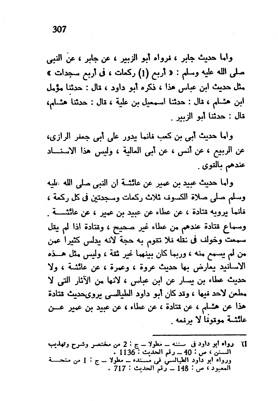 وَأَمَّا حَدِيثُ جَابِرٍ فَرَوَاهُ أَبُو الزُّبَيْرِ عَنْ جَابِرٍ عَنِ النَّبِيِّ صَلَّى اللَّهُ عَلَيْهِ وَسَلَّمَ أَرْبَعُ رَكَعَاتٍ فِي أَرْبَعِ سَجَدَاتٍ مِثْلَ حَدِيثِ ابْنِ عَبَّاسٍ هَذَا ذَكَرَهُ أَبُو دَاوُدَ قَالَ حدثنا مؤمل ابن هشام قال حدثنا اسمعيل بْنُ عُلَيَّةَ قَالَ حَدَّثَنَا هِشَامُ قَالَ حَدَّثَنَا أَبُو الزُّبَيْرِ وَأَمَّا حَدِيثُ أُبَيِّ بْنِ كَعْبٍ فَإِنَّمَا يَدُورُ عَلَى أَبِي جَعْفَرٍ الرَّازِيِّ عَنِ الرَّبِيعِ عَنْ أَنَسٍ عَنْ أَبِي الْعَالِيَةَ وَلَيْسَ هَذَا الْإِسْنَادُ عِنْدَهُمْ بِالْقَوِيِّ وَأَمَّا حَدِيثُ عُبَيْدِ بْنِ عُمَيْرٍ عَنْ عَائِشَةَ أَنَّ النَّبِيَّ صَلَّى اللَّهُ عَلَيْهِ وَسَلَّمَ صَلَّى صَلَاةَ الْكُسُوفِ ثَلَاثَ رَكَعَاتٍ وَسَجْدَتَيْنِ فِي كُلِّ رَكْعَةٍ فَإِنَّمَا يَرْوِيِهِ قتادة عَنْ عَطَاءٌ عَنْ عُبَيْدِ بْنِ عُمَيْرٍ عَنْ عَائِشَةَ وَسَمَاعُ قَتَادَةَ عِنْدَهُمْ مِنْ عَطَاءٍ غَيْرُ صَحِيحٍ وَقَتَادَةُ إِذَا لَمْ يَقُلْ سَمِعْتُ وَخُولِفَ فِي نَقْلِهِ فَلَا تَقُومُ بِهِ حُجَّةٌ لأنه يدلس كثيرا عمن من لم يسمع منه وربما كان بينهما غير ثِقَةً وَلَيْسَ مِثْلُ هَذِهِ الْأَسَانِيدِ يُعَارَضُ بِهَا حَدِيثُ عُرْوَةَ وَعَمْرَةَ عَنْ عَائِشَةَ وَلَا حَدِيثُ عَطَاءِ بْنِ يَسَارٍ عَنِ ابْنِ عَبَّاسٍ لِأَنَّهَا مِنَ الْآثَارِ الَّتِي لَا مَطْعَنَ لِأَحَدٍ فِيهَا وَقَدْ كَانَ أَبُو دَاوُدَ الطَّيَالِسِيُّ يَرْوِي حَدِيثَ قَتَادَةَ هَذَا عَنْ هِشَامٍ عَنْ قَتَادَةَ عَنْ عَطَاءٍ عَنْ عُبَيْدِ بْنِ عُمَيْرٍ عَنْ عَائِشَةَ مَوْقُوفًا لَا يَرْفَعُهُ